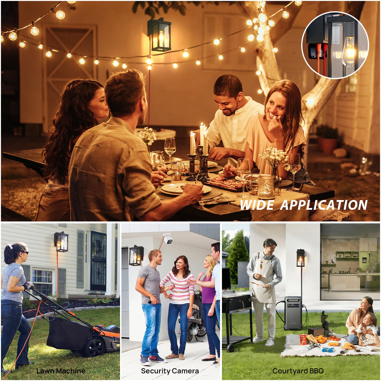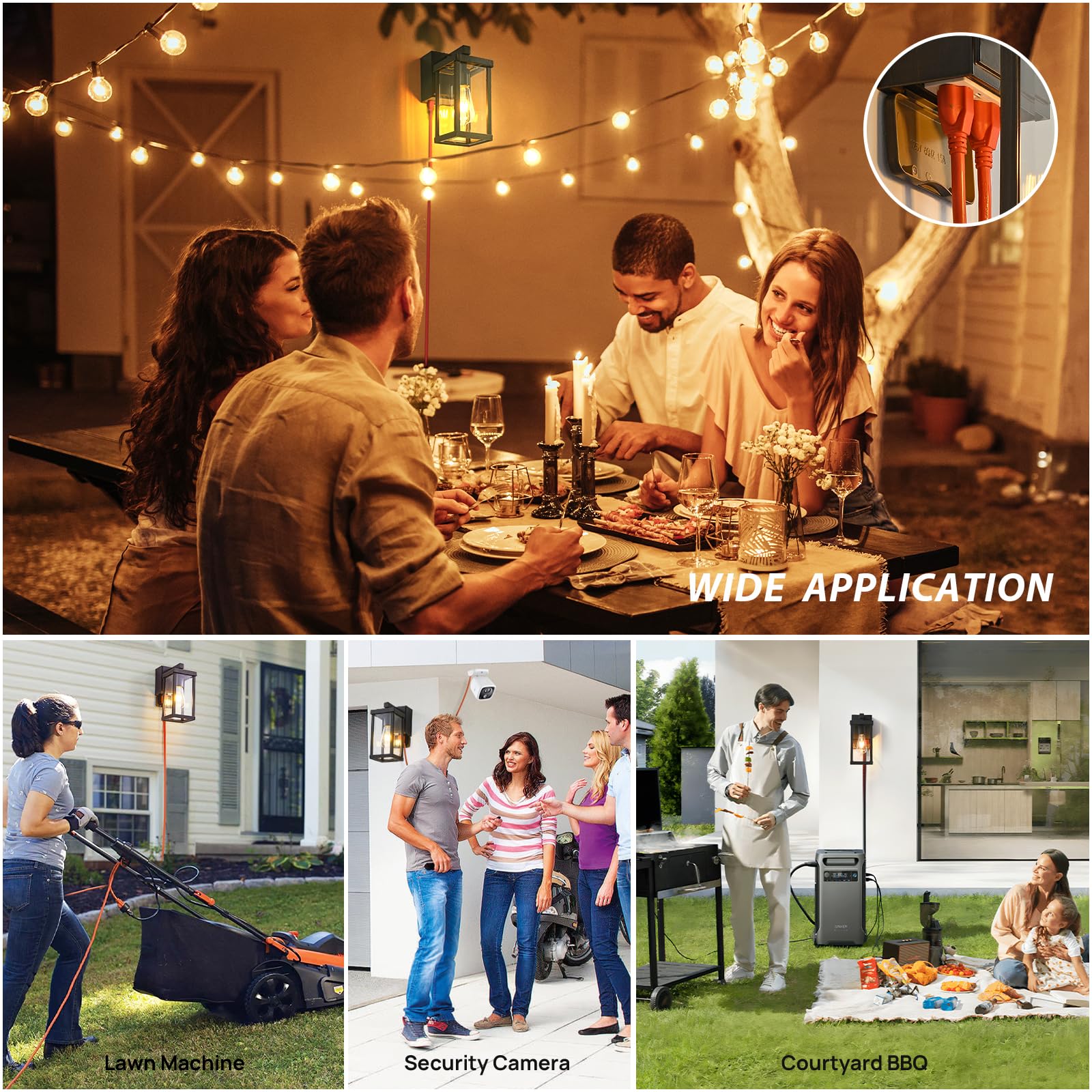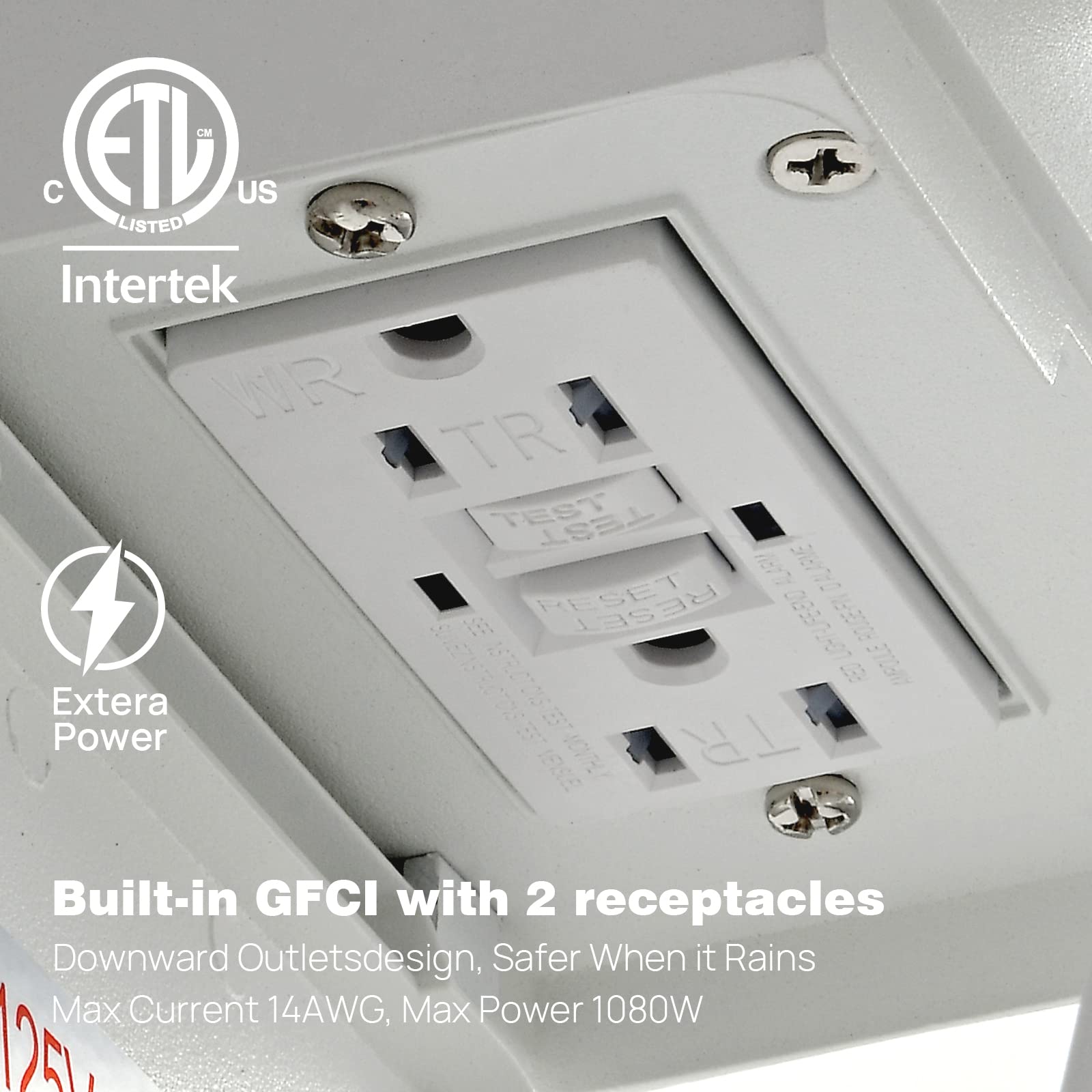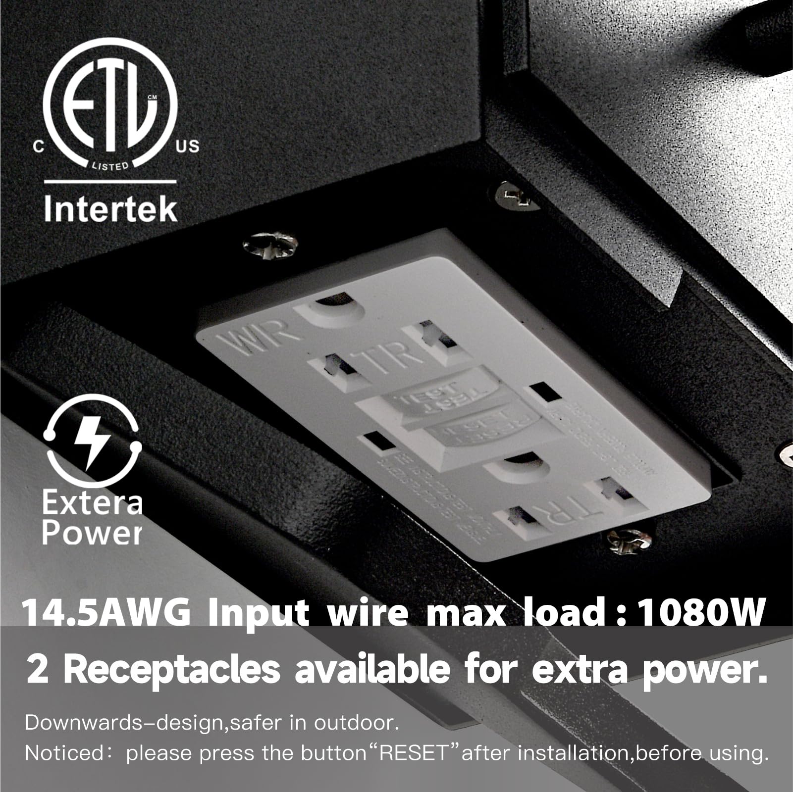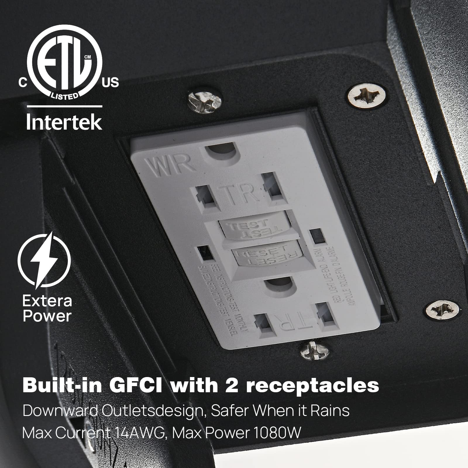 - Safer and Powerful GFCI Outlet Design: The porch light with outlet has a built-in 2 GFCI outlets(Max power 14.5AWG and Max Load 1080W) for your 2- and 3-prong plug devices, making it convenient to power outdoor electronics such as security cameras, party decorations and gardening tools. In addition the outlets of our black outdoor light fixtures are designed downward with magnetic box to protect the circuits from rain splashes.
