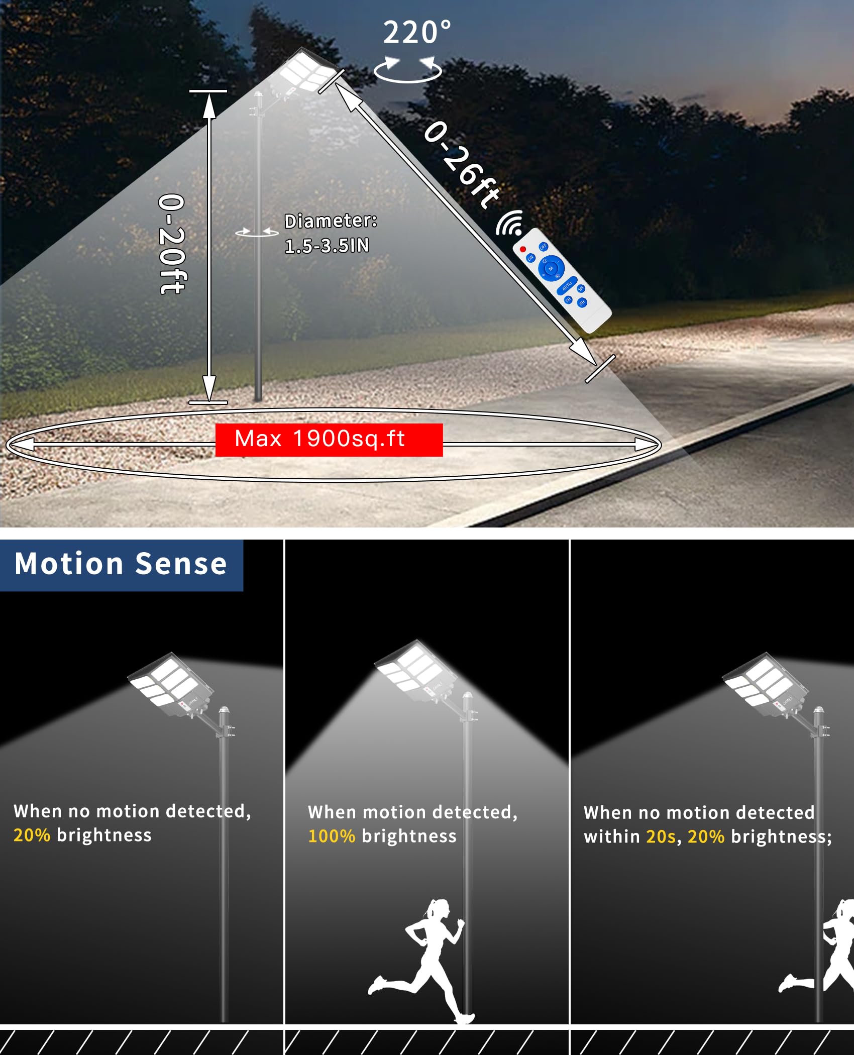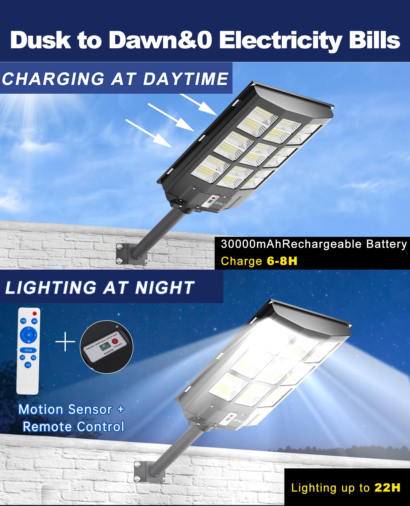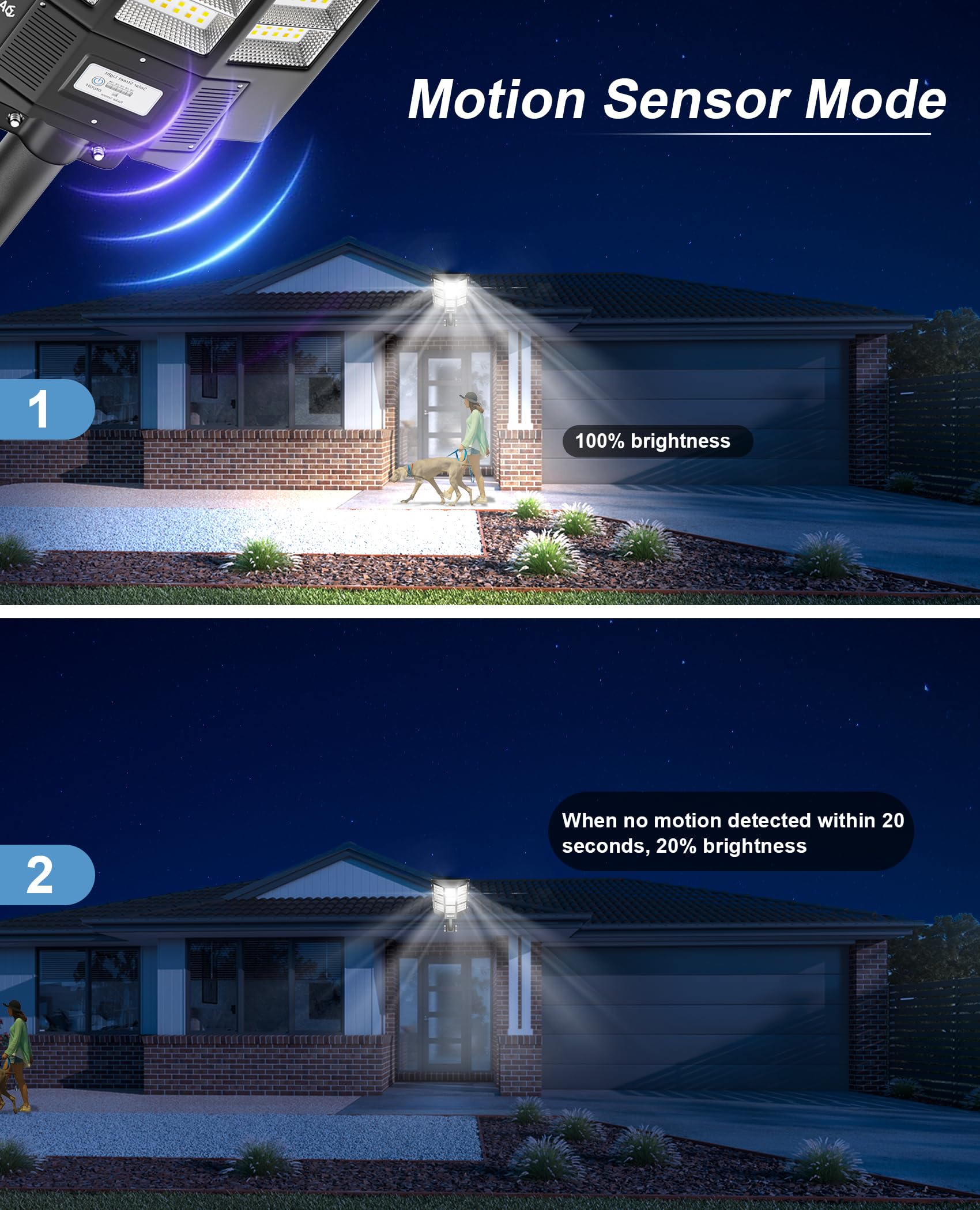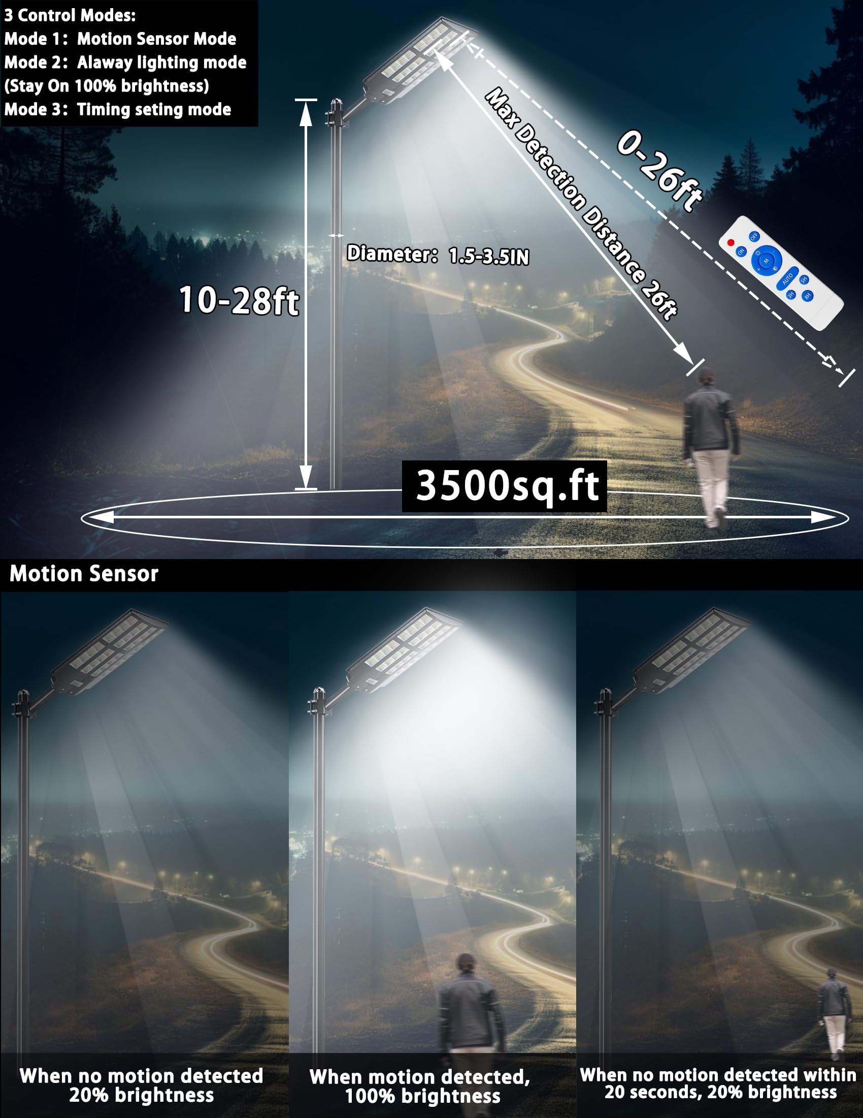 - 【WIRELESS REMOTE AND 3 MODES】1. Motion Sensing: When no motion is detected, the solar powered security light operates at 20% dimming, and switches to 100% brightness immediately after motion is detected, ensuring safety and energy saving. 2. Always Lighting: Provides 100% brightness in areas that require steady illumination, with 10 levels brightness of adjustable. 3. Dusk to Dawn: Street lamp charges during the day, turns on automatically at dusk and turns off automatically at dawn. (Remote control provides 3 time settings: 3H/5H/8H.)