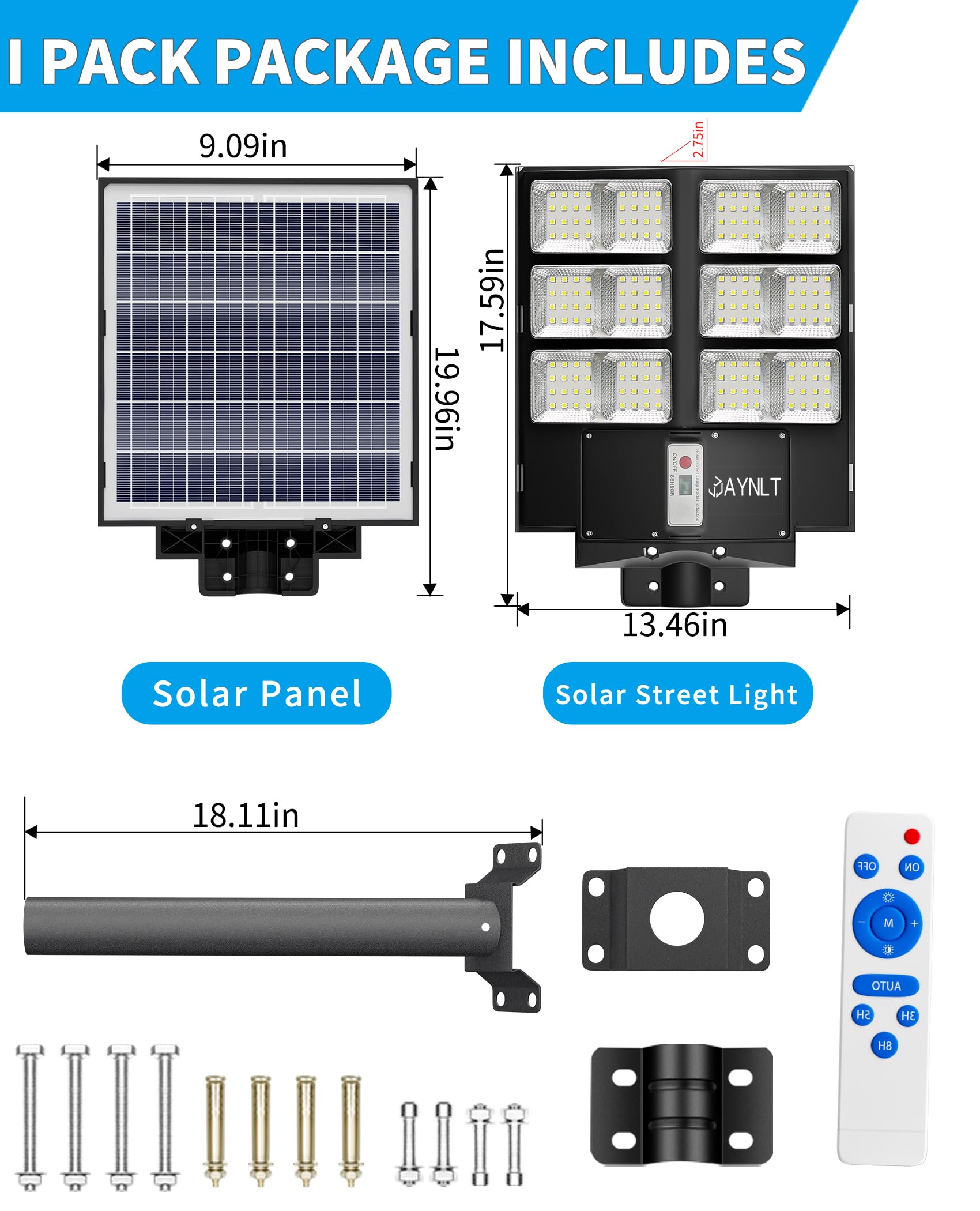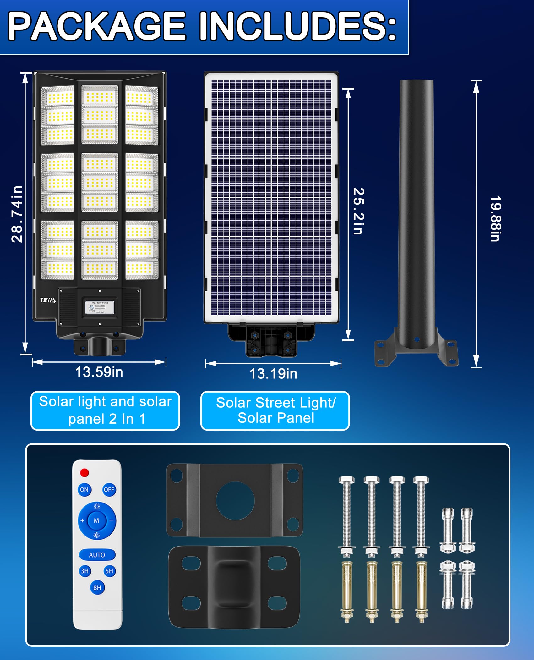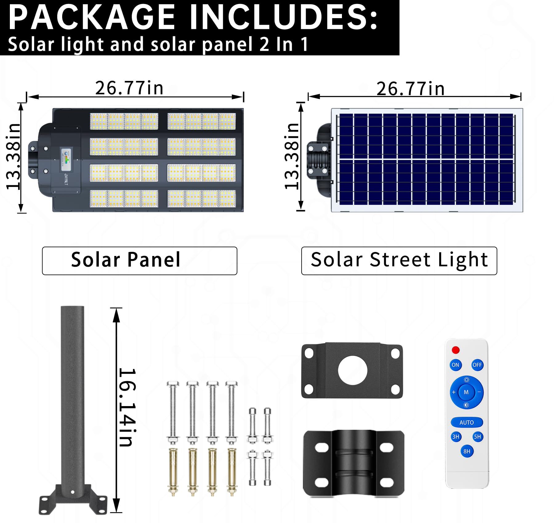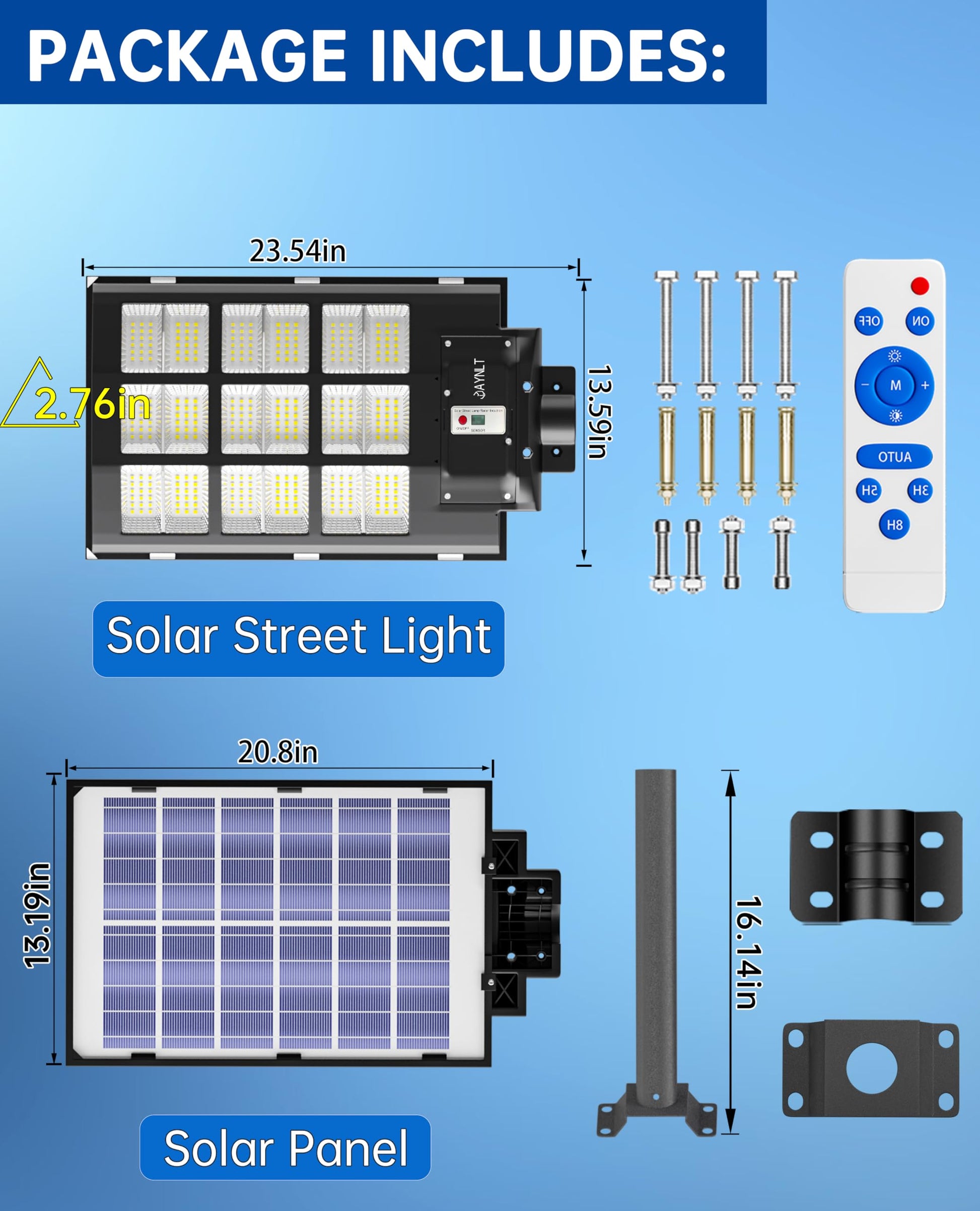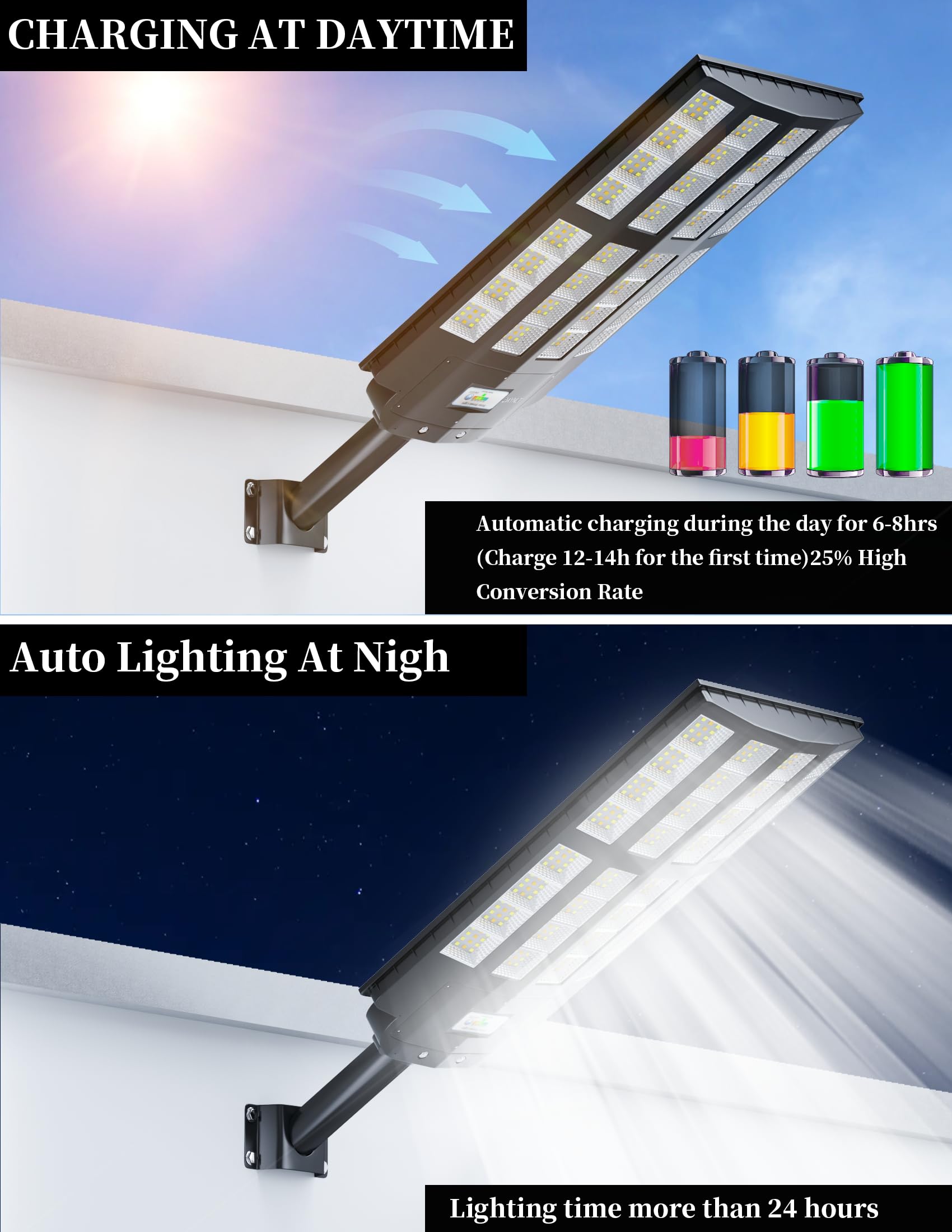 This solar street light have 2 installations to choose. Includes pole and wall mounted accessories, no wiring is required, which can be easily installed outdoor.