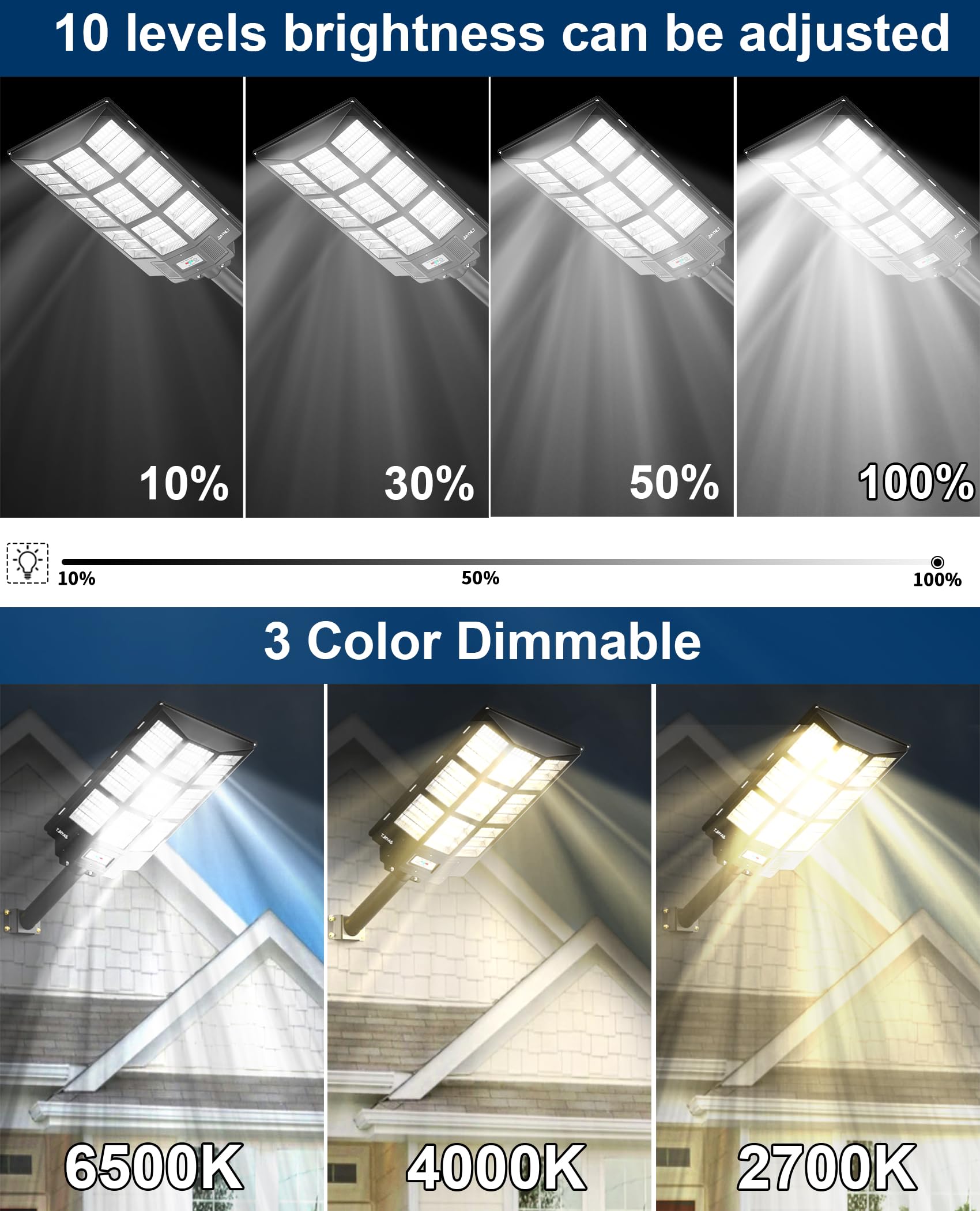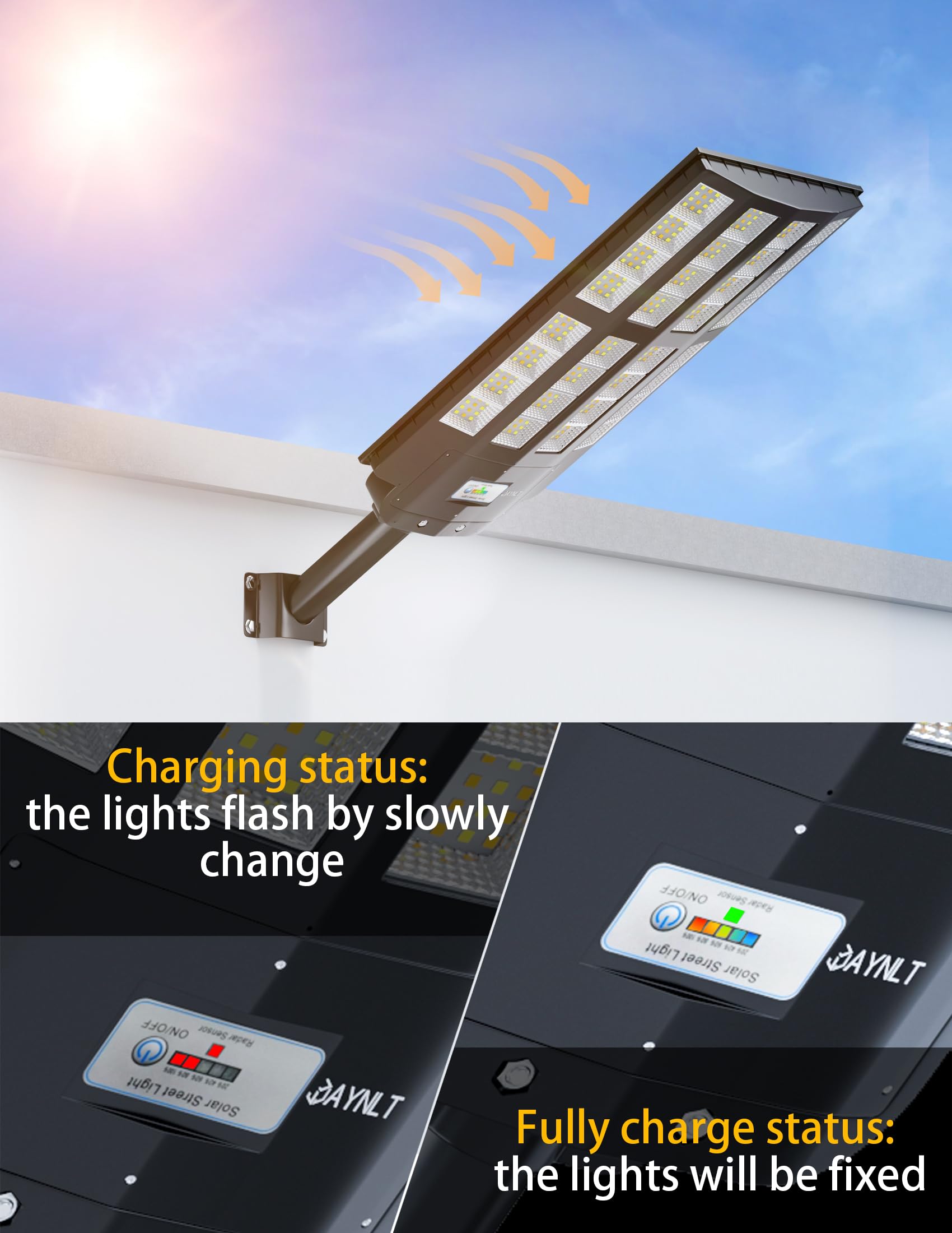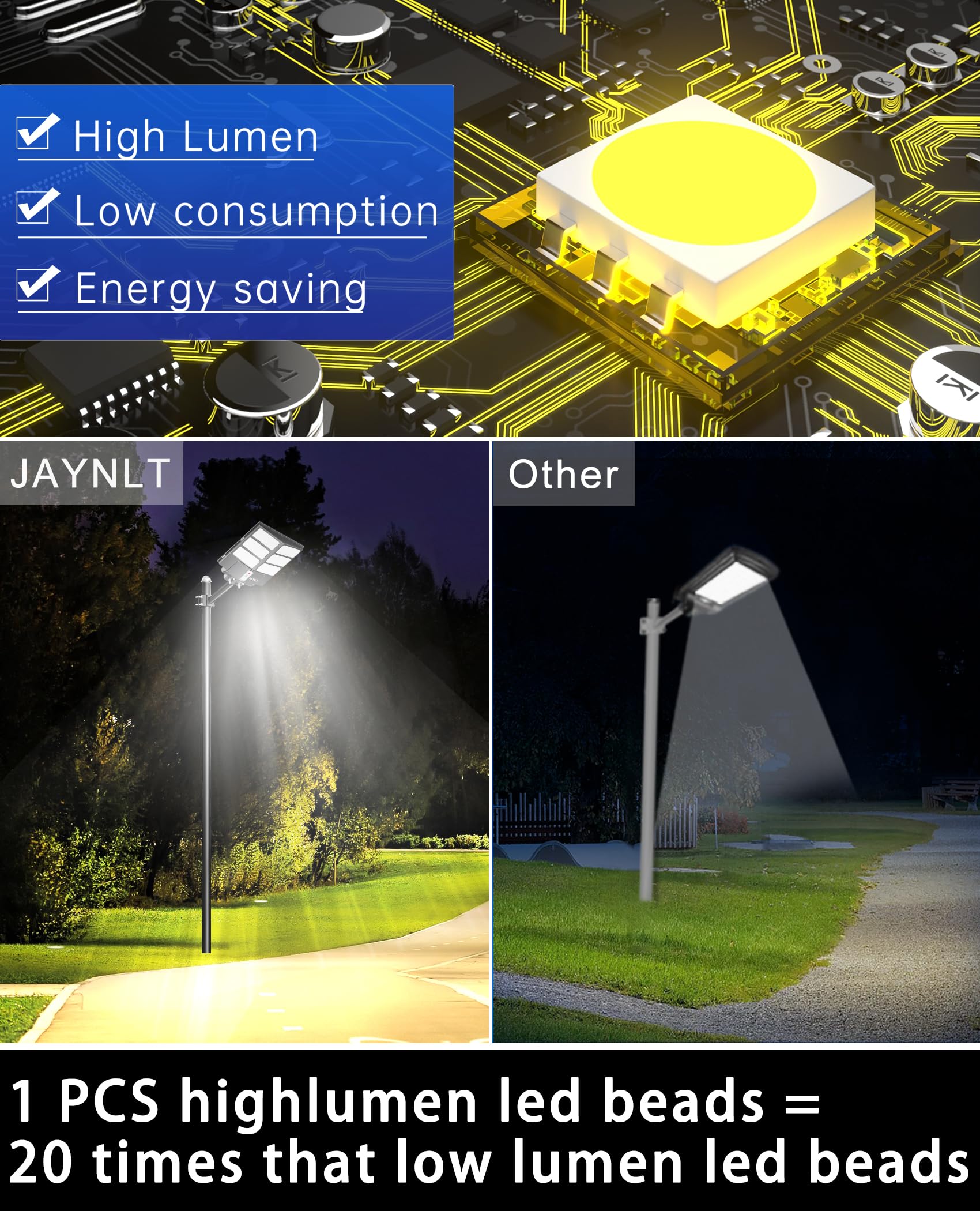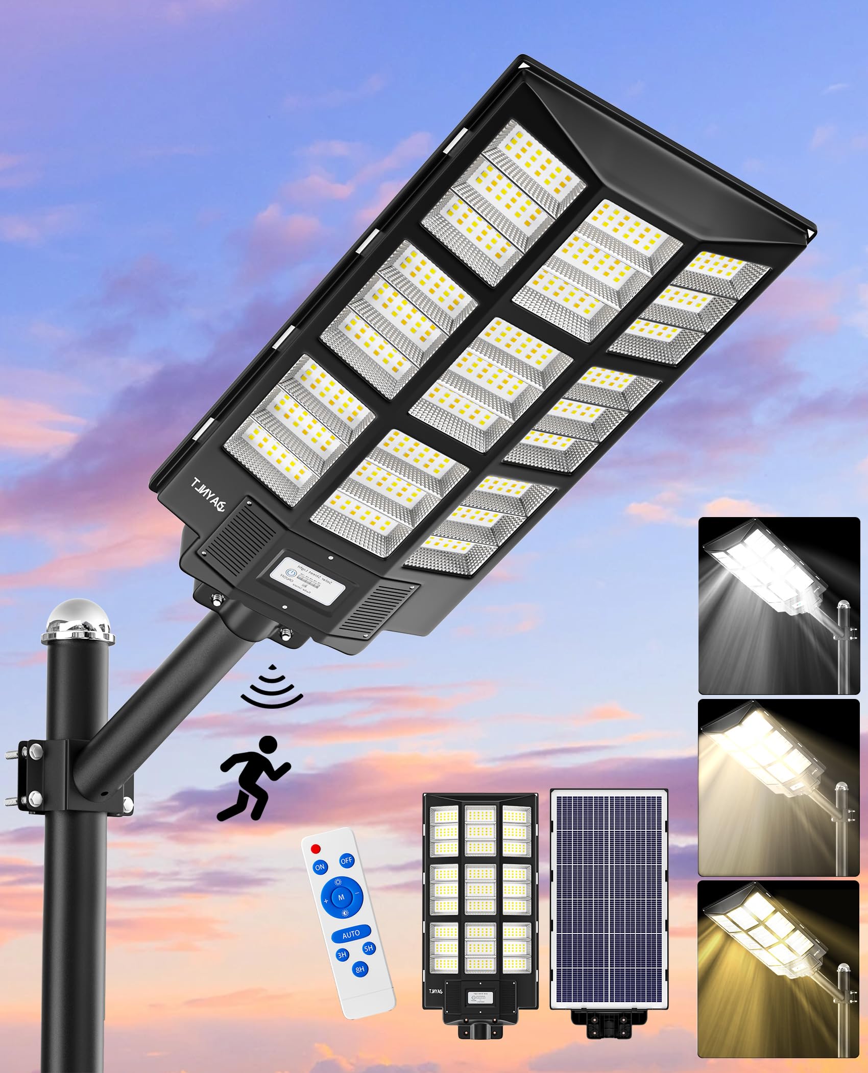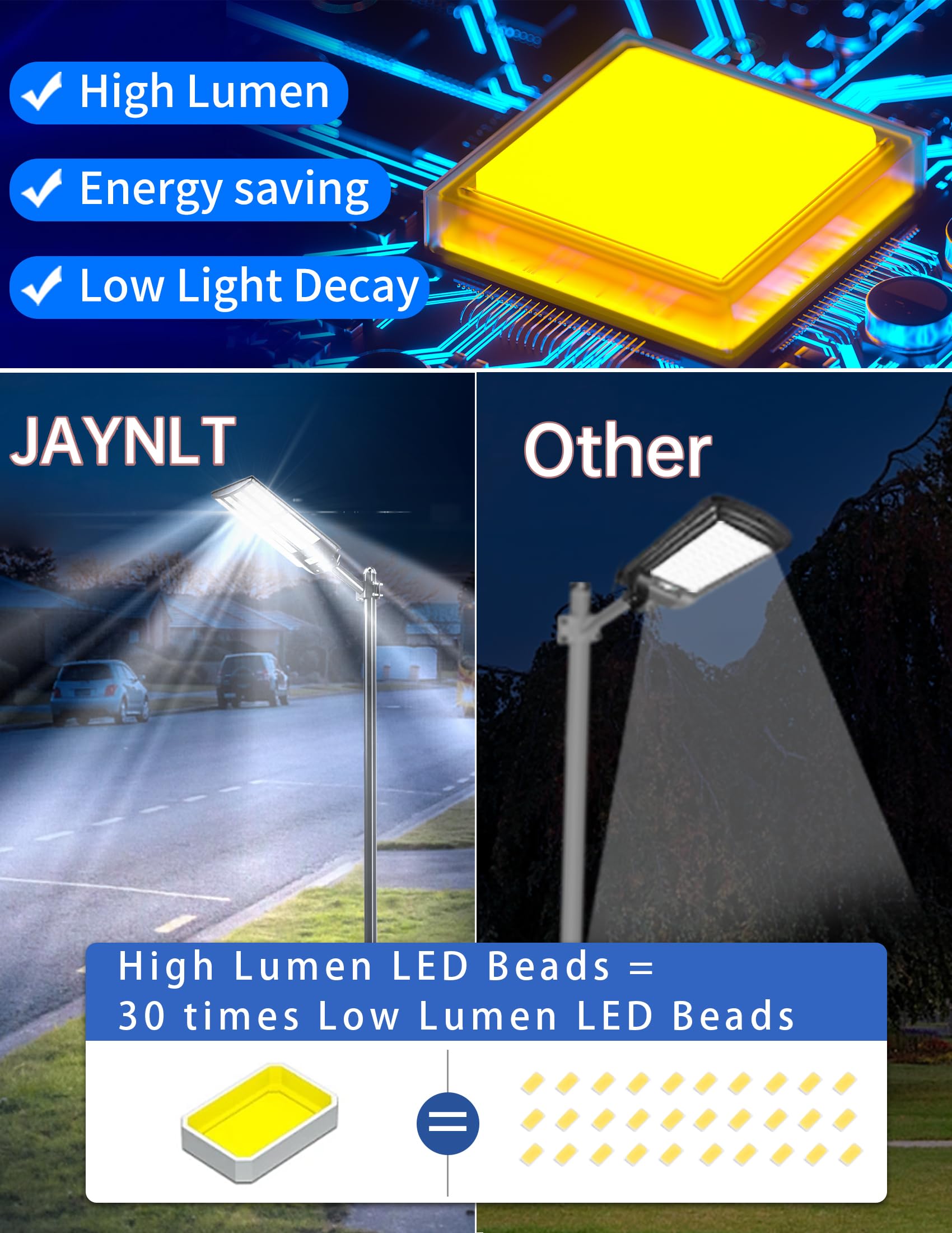 - 【HIGH LUMENS BEADS & 3 COLOR TEMPERATURES】 JAYNLT solar street light uses advanced LED chips and 456 high lumen beads, which can produce 680000lm high brightness to improve the visibility of outdoor space. Upgraded lighting design, provides three light color options, warm light (2700K), warm white light (4000K), white light (6500K) with adjustable color temperature to ensure adaptable to various lighting applications.