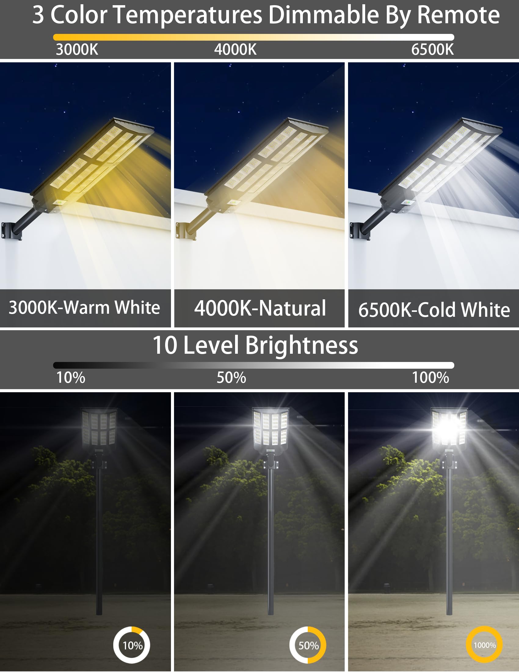 - This solar powered parking lot lights offer 3 color temperature to adjust. Using remote choose the mode you want.