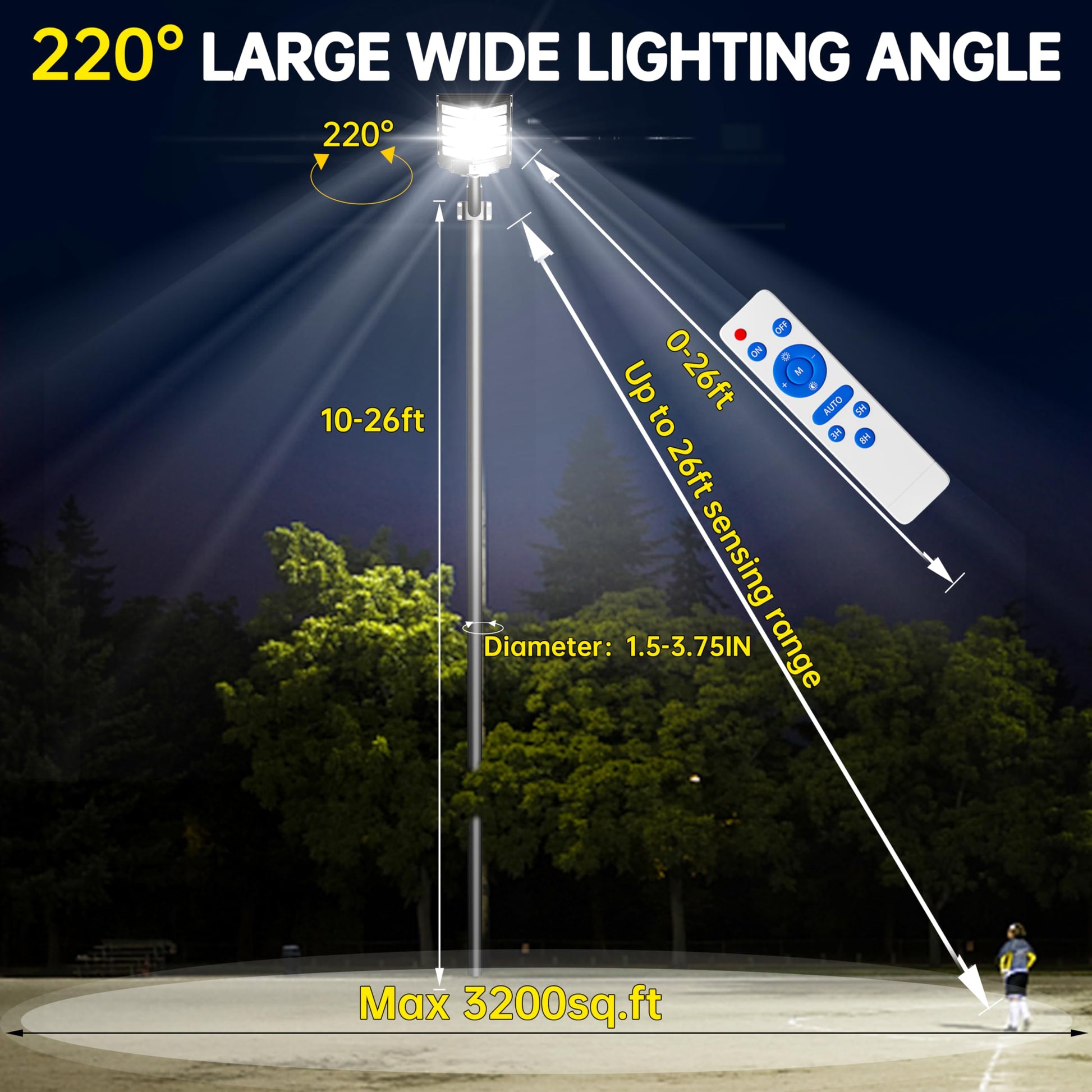 - 【WIRELESS INSTALLATION & APPLICATION】This solar powered outdoor flood lights 2 mounting options, pole mount and wall mount, easy to install with the included mounting kit. (We suggest install this parking lot lights commercial 10-28ft above the ground, supports street light poles 1.5in - 3.5in in diameter) The wireless design is perfect for roadways, garages, streets, courtyards, parking lots, basketball court plazas, illuminated industrial zones, and other areas not easily connectable to the power grid.
