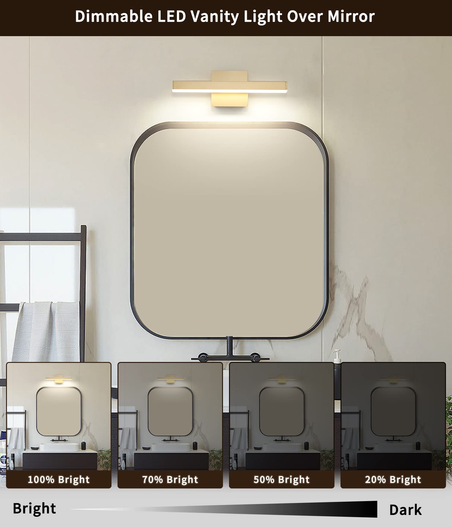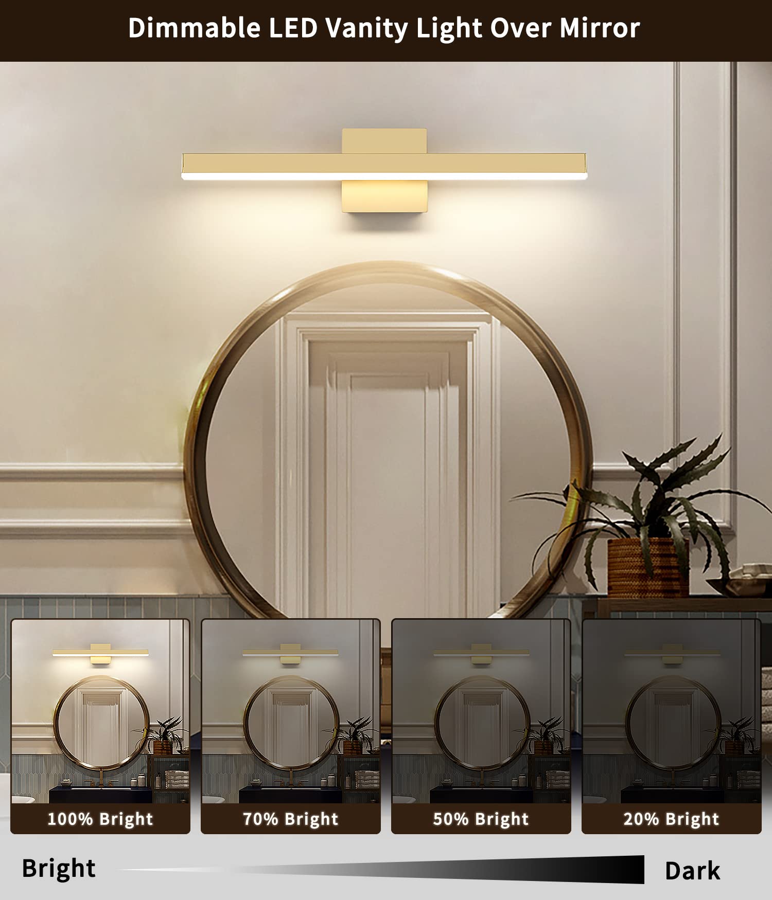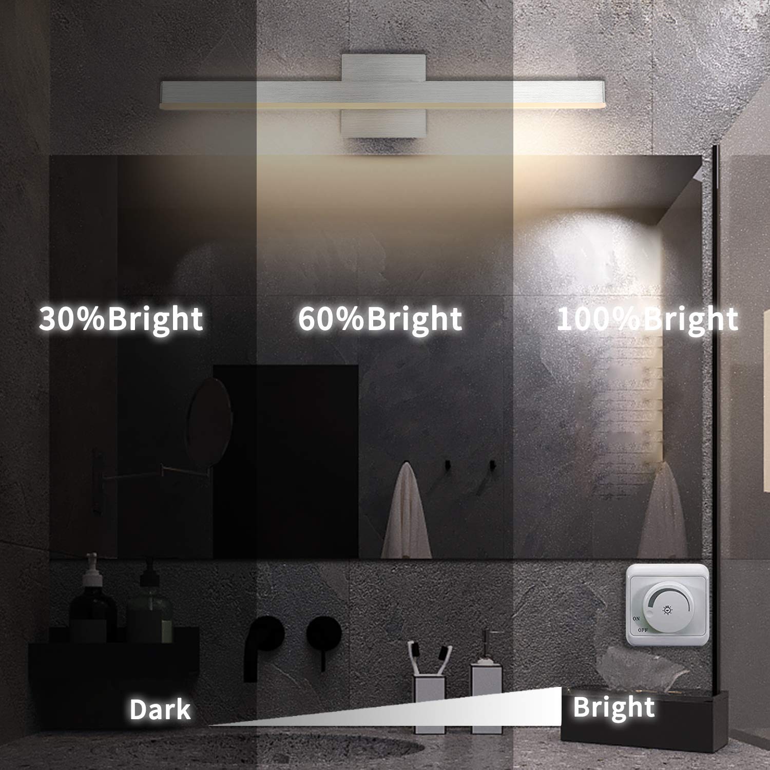 - Dimmable Function: LED vanity light with ETL certificated dimmable driver ensure the vanity lamp to 5%-100% dimming range, the LED lights for vanity mirror compatible with most household triac LED dimmers for smooth and flicker-free operation.you can switch the vanity bathroom lights freely to the dimming range