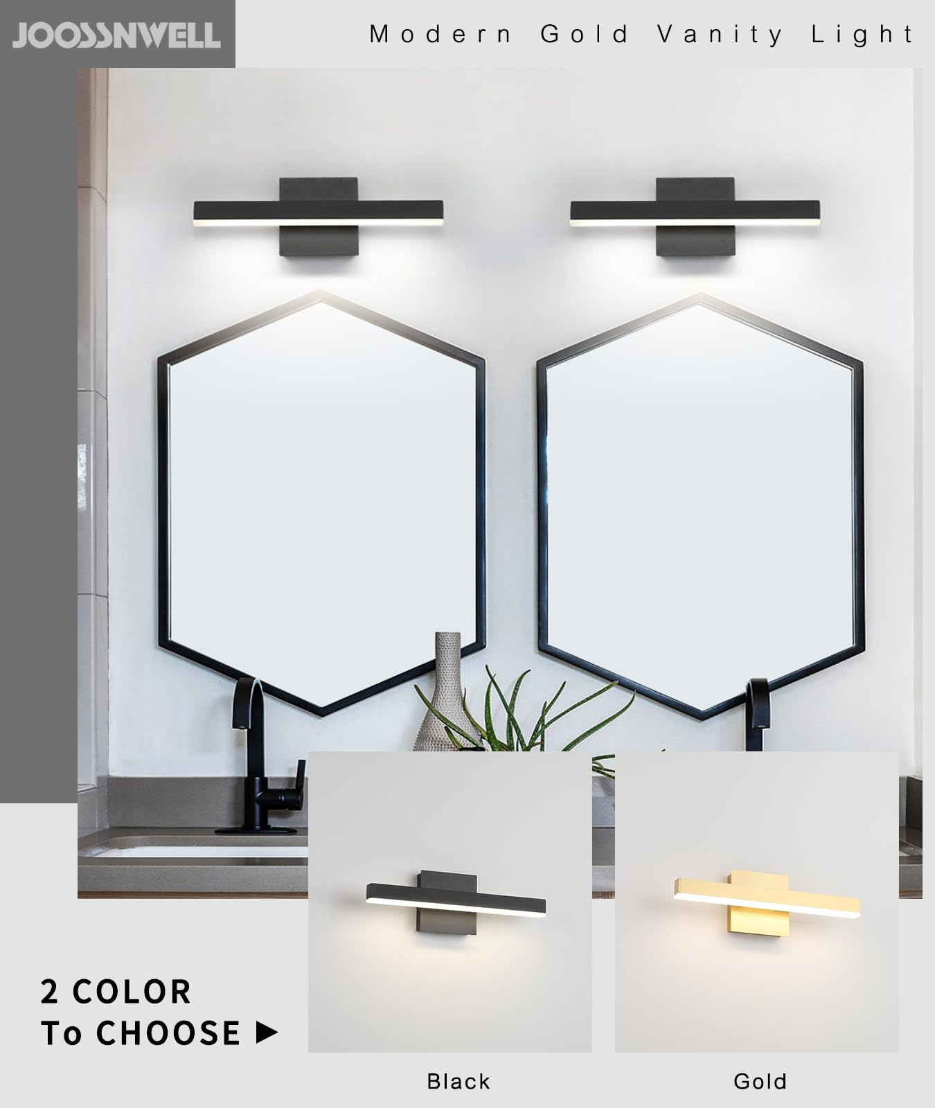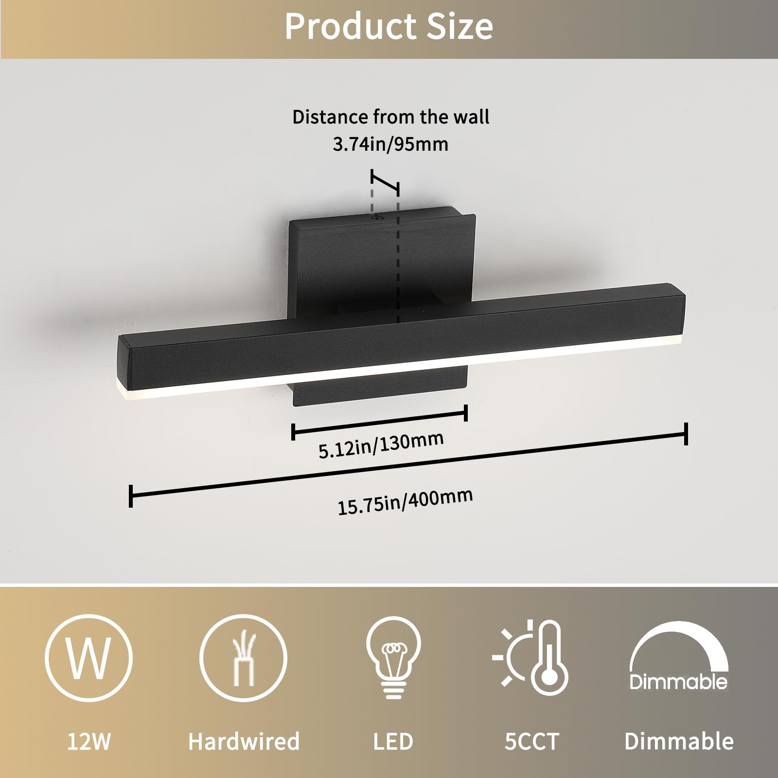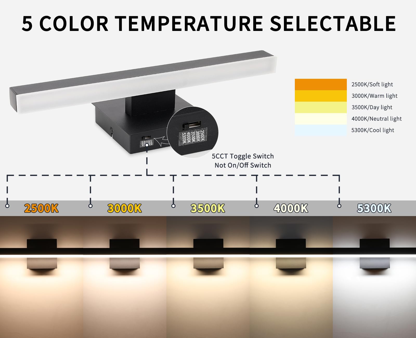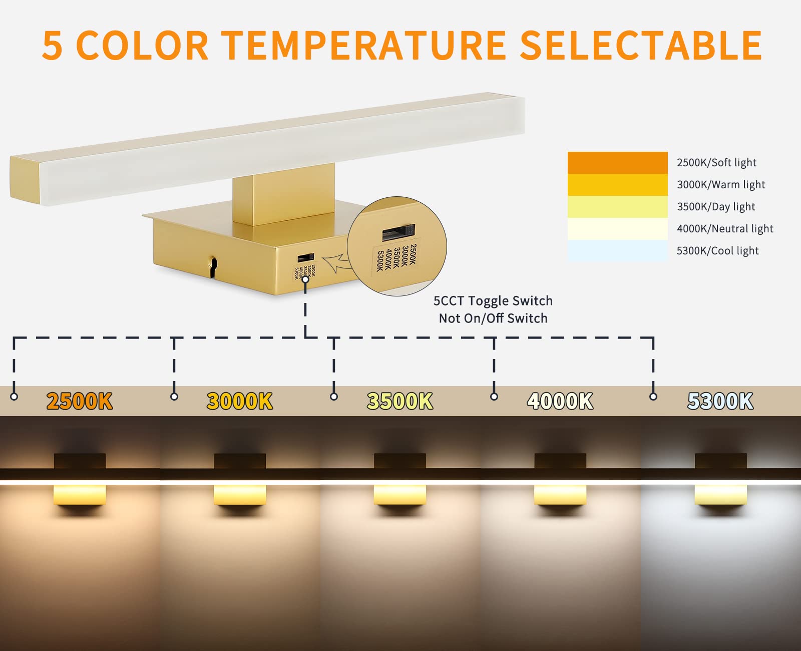 - 5 Color Changeable: Our black bathroom light fixtures can adjust the 5 vanity mirror lights color , there is a SHIFT key on the side of the mirror lights base, and freely choose soft white/warm white/cool white/Day light temperature for the black vanity lights according to your need