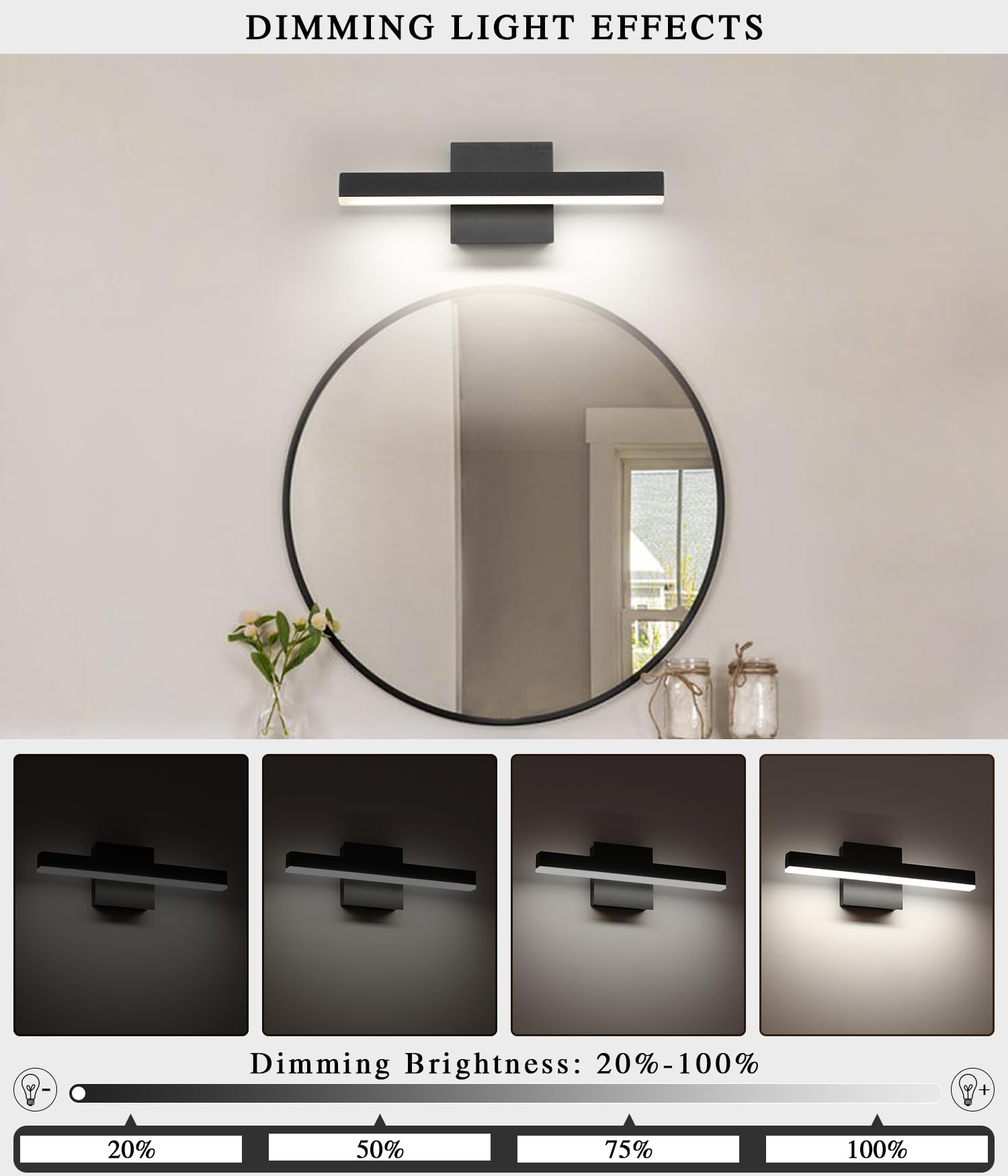 The vanity light to 5%-100% dimming range, the LED lights for vanity mirror compatible with most household triac LED dimmers for smooth and flicker-free operation.you can switch the black bathroom light freely to the dimming range.