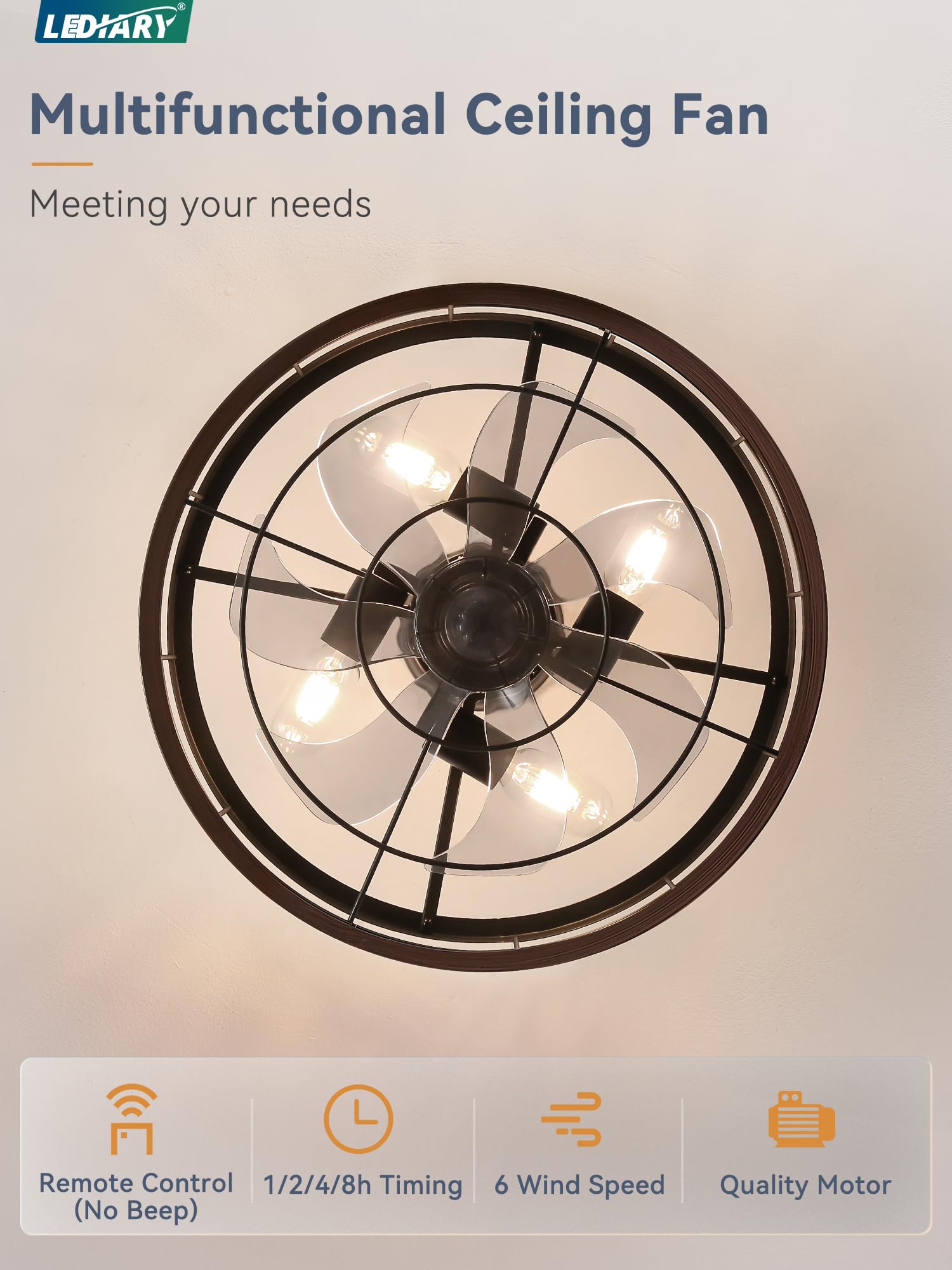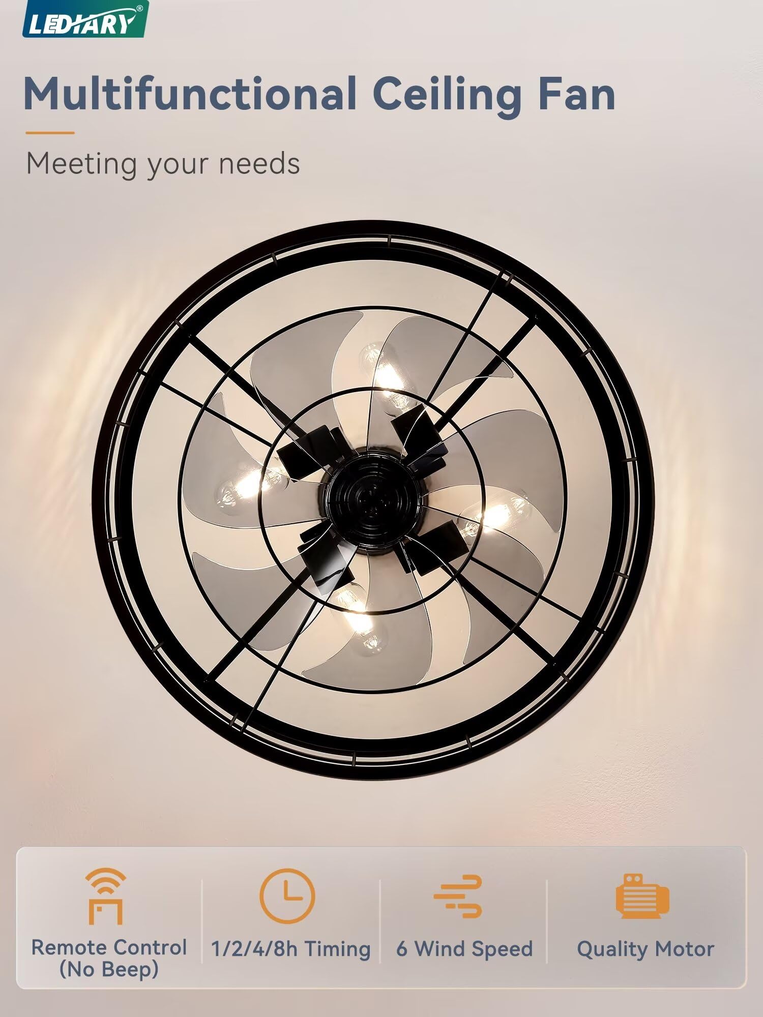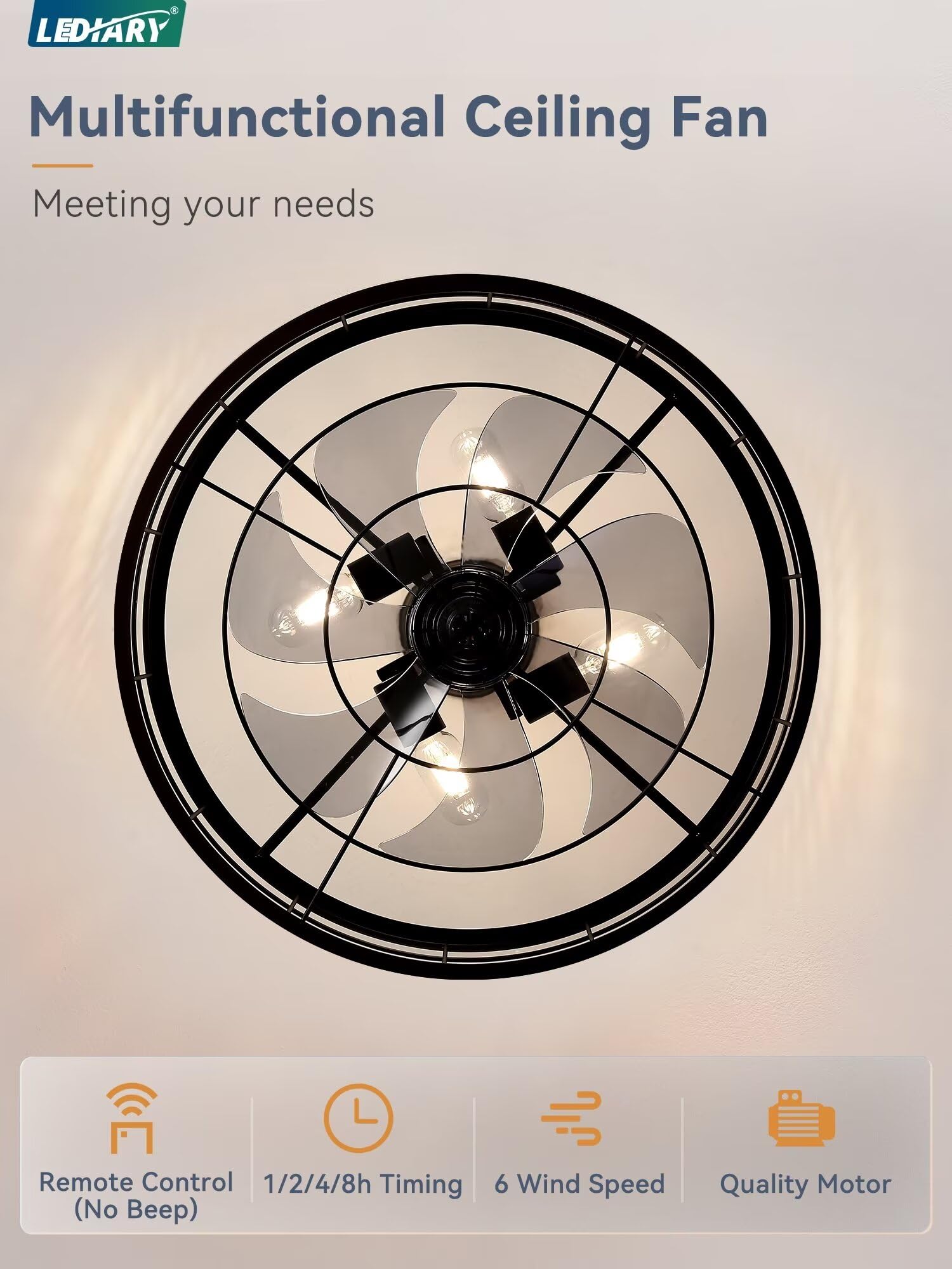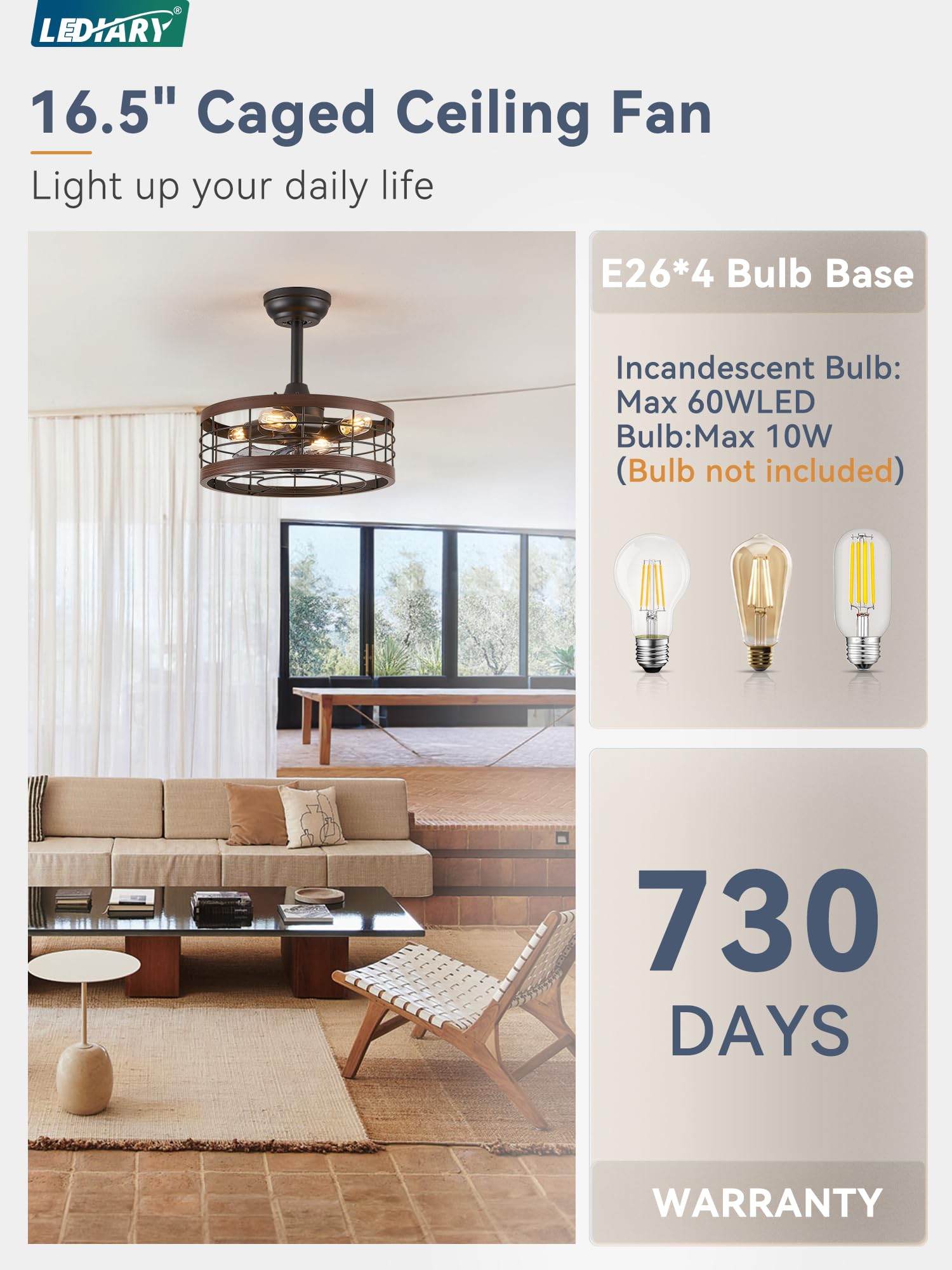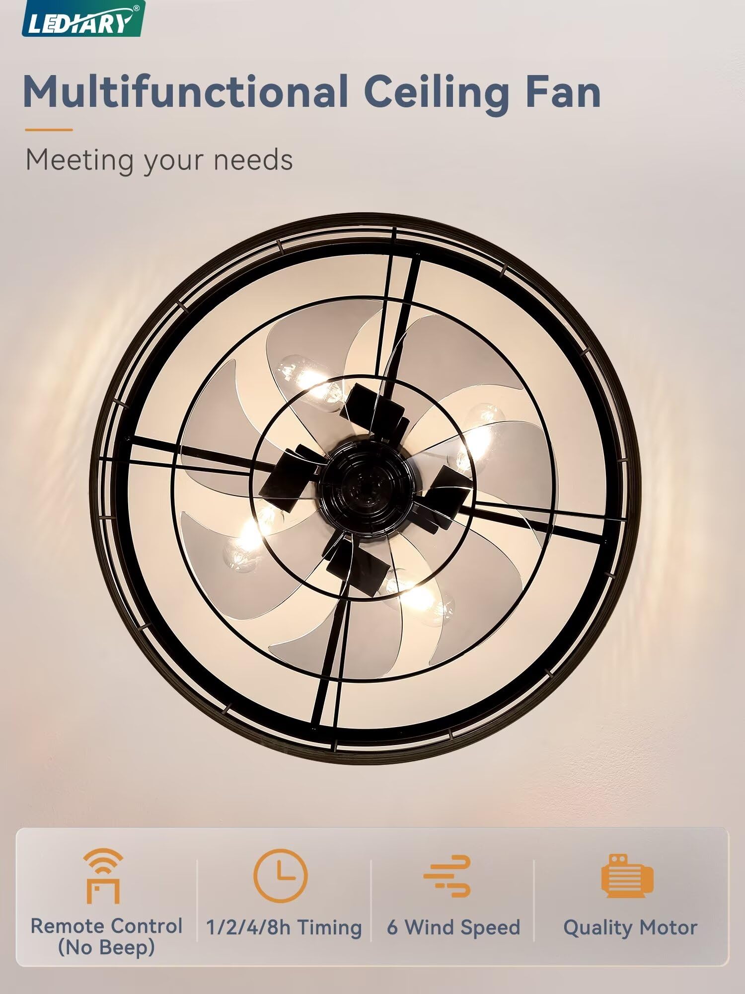LEDIARY 16.5 inch Black Caged Ceiling Fan with Light, Fandelier Industrial Ceiling Fan with Remote, Farmhouse Fan Lights Ceiling Fixtures for Kitchen, Bedroom, Outdoor(6 Speed, Timing)-Black