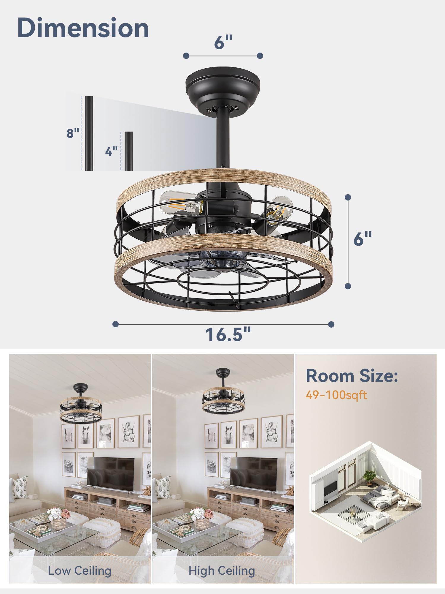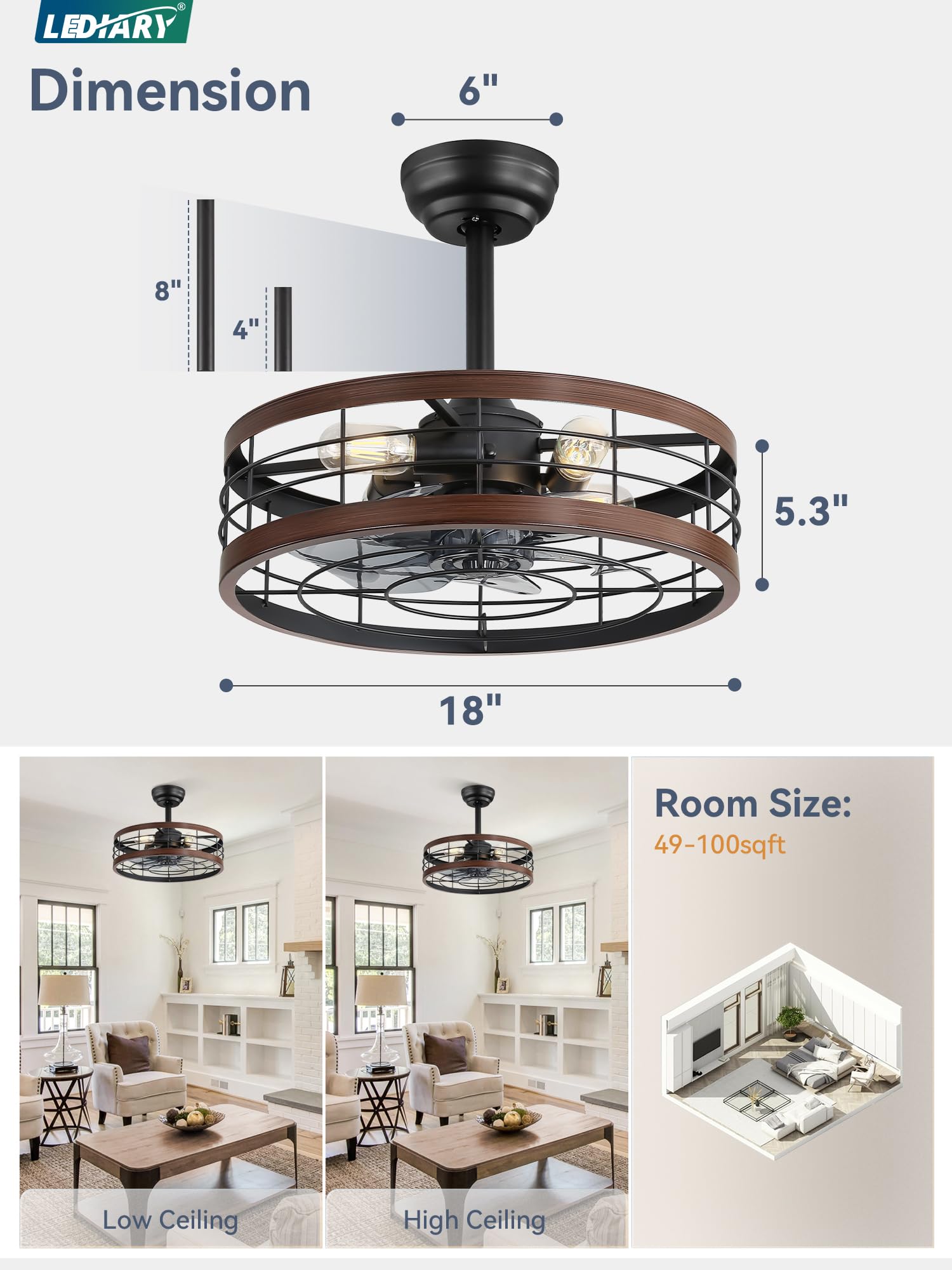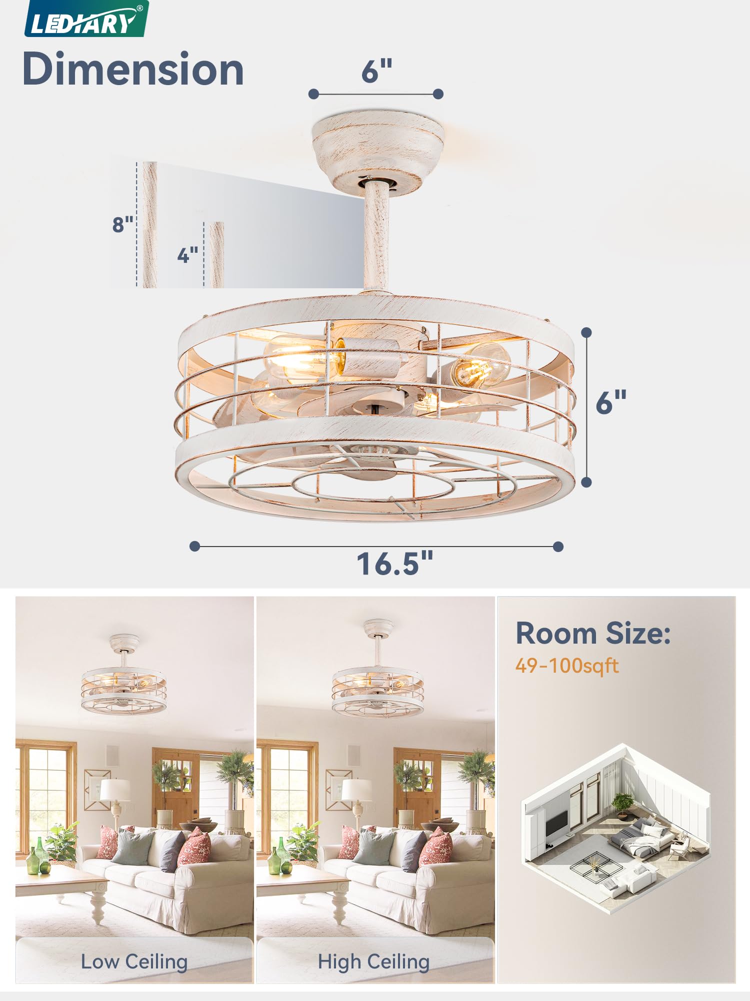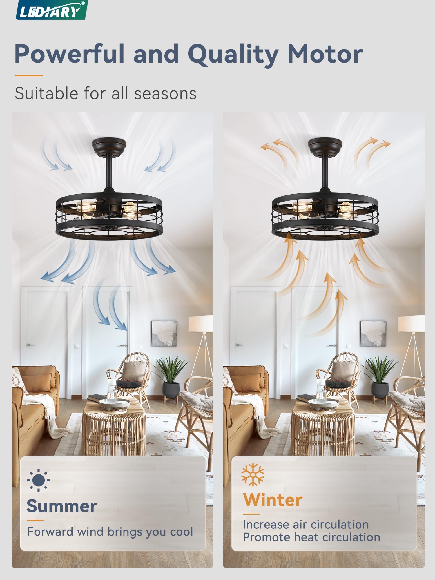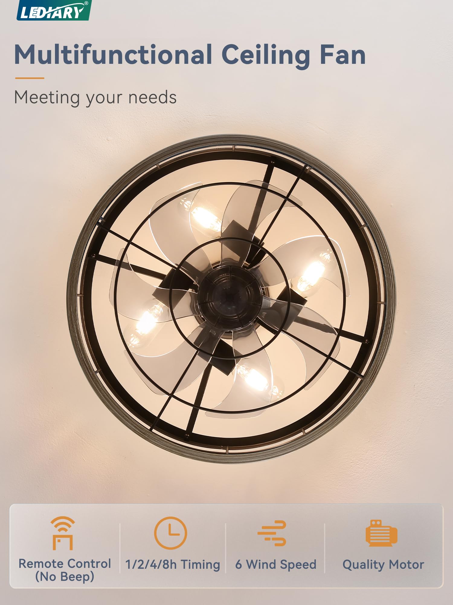 LEDIARY 16.5 inch Black Caged Ceiling Fan with Light, Fandelier Industrial Ceiling Fan with Remote, Farmhouse Fan Lights Ceiling Fixtures for Kitchen, Bedroom, Outdoor(6 Speed, Timing)-Black