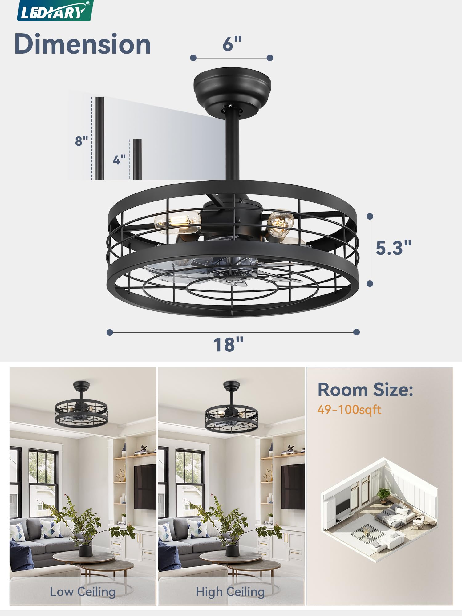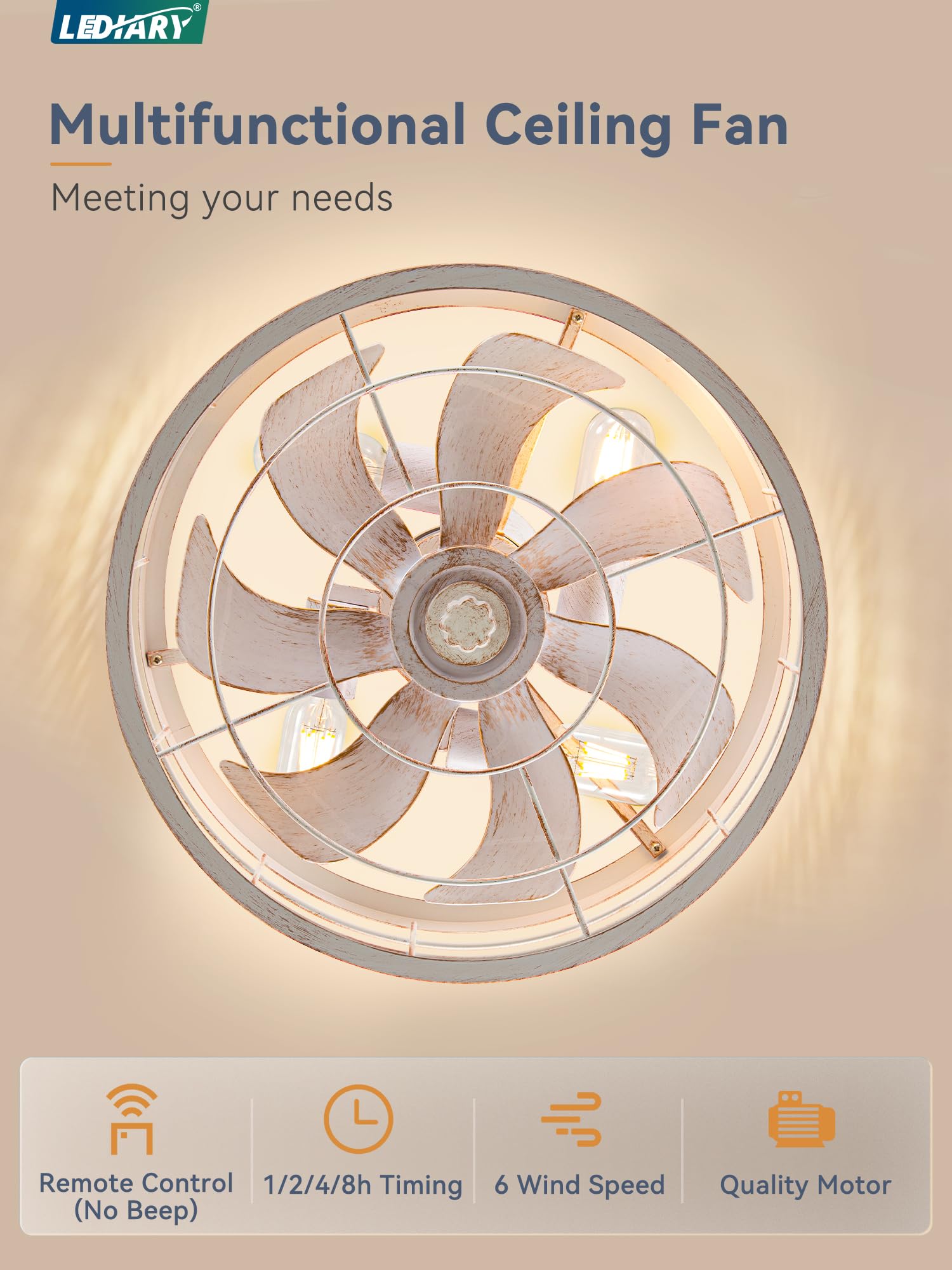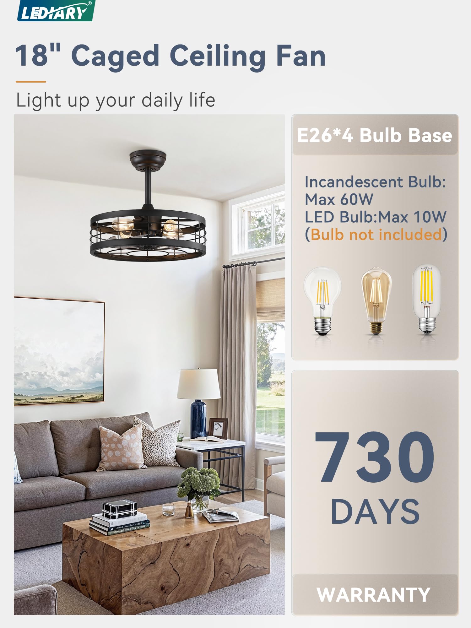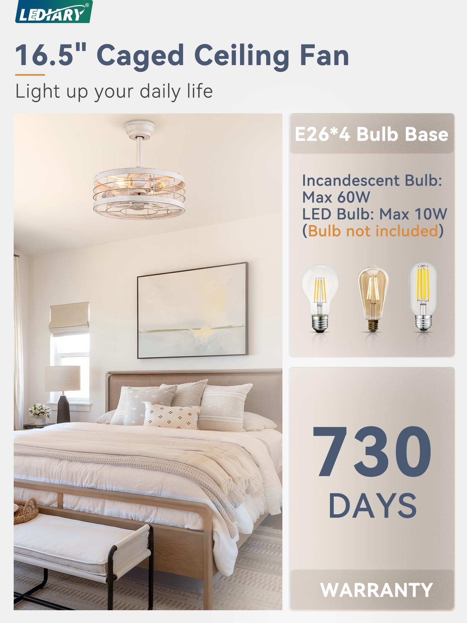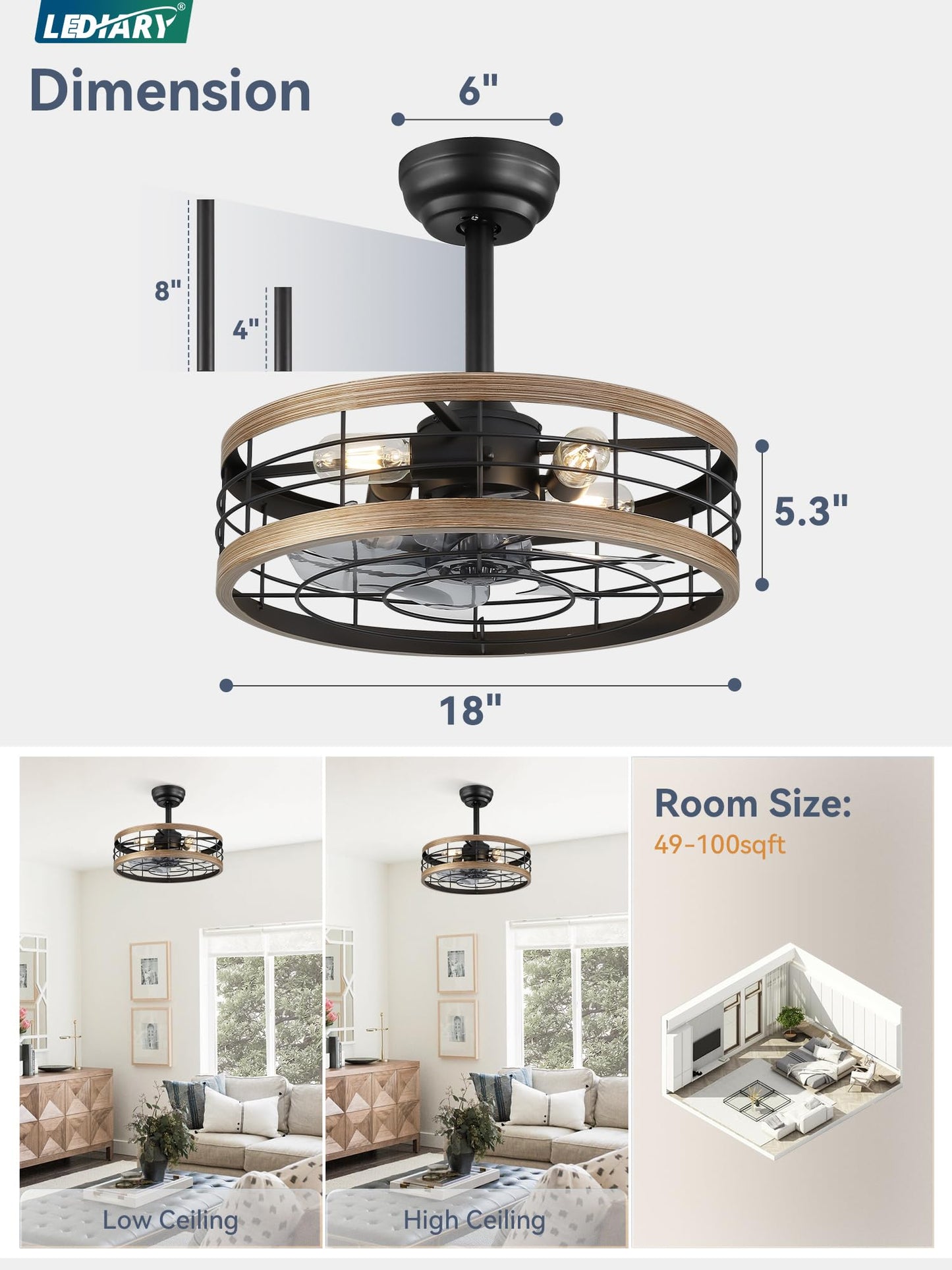 LEDIARY 16.5 inch Black Caged Ceiling Fan with Light, Fandelier Industrial Ceiling Fan with Remote, Farmhouse Fan Lights Ceiling Fixtures for Kitchen, Bedroom, Outdoor(6 Speed, Timing)-Black