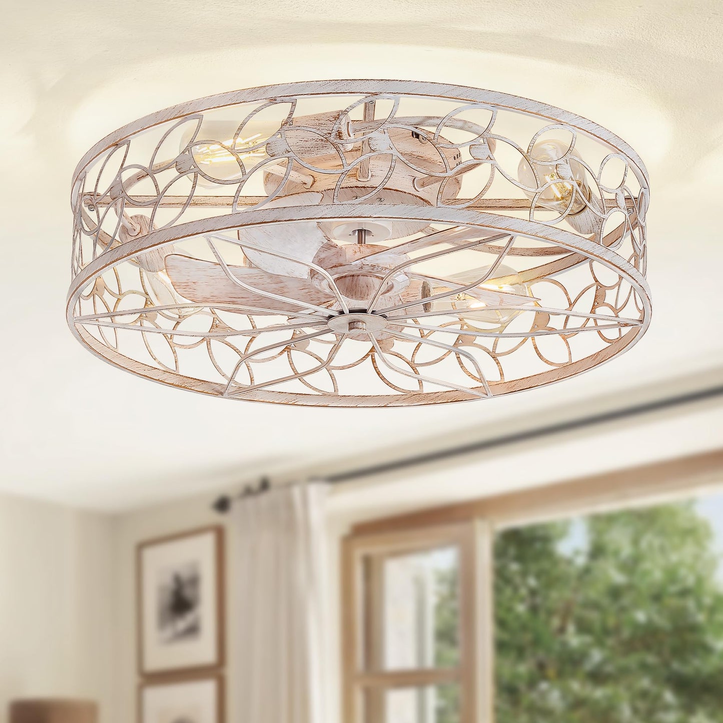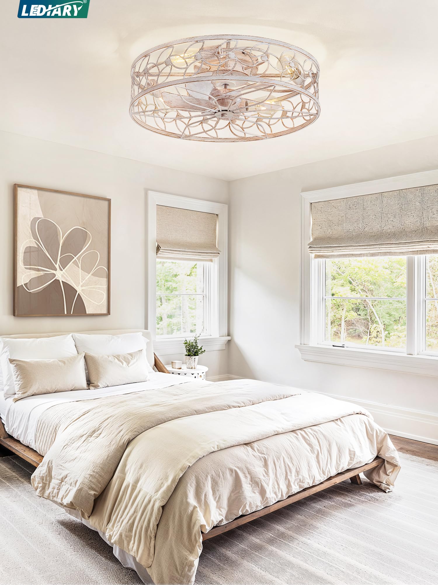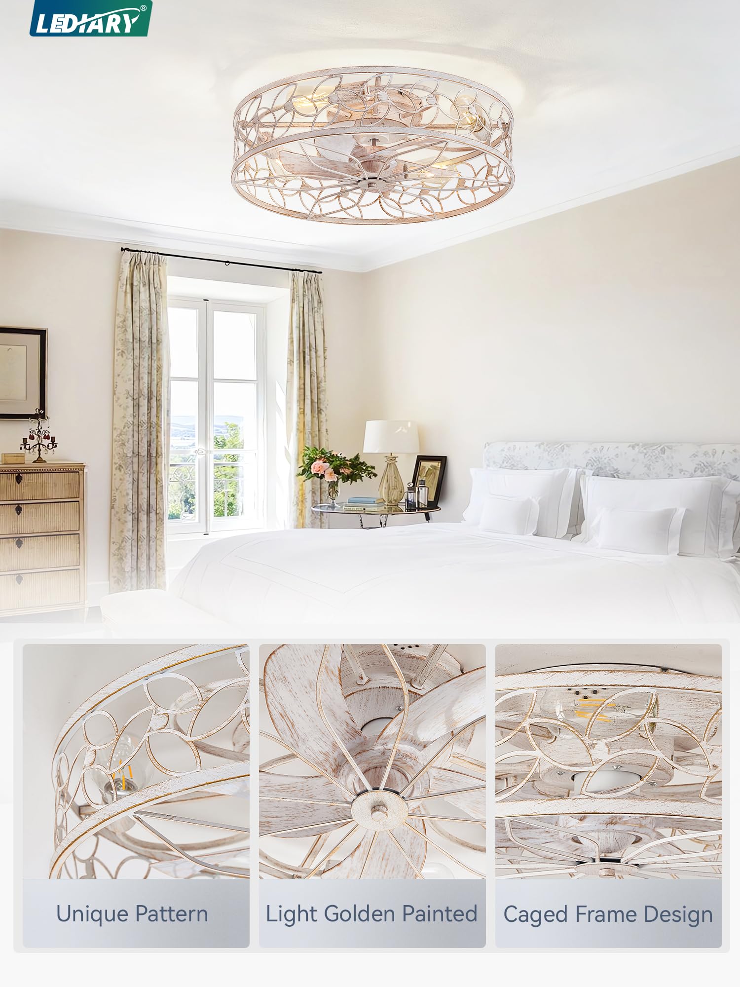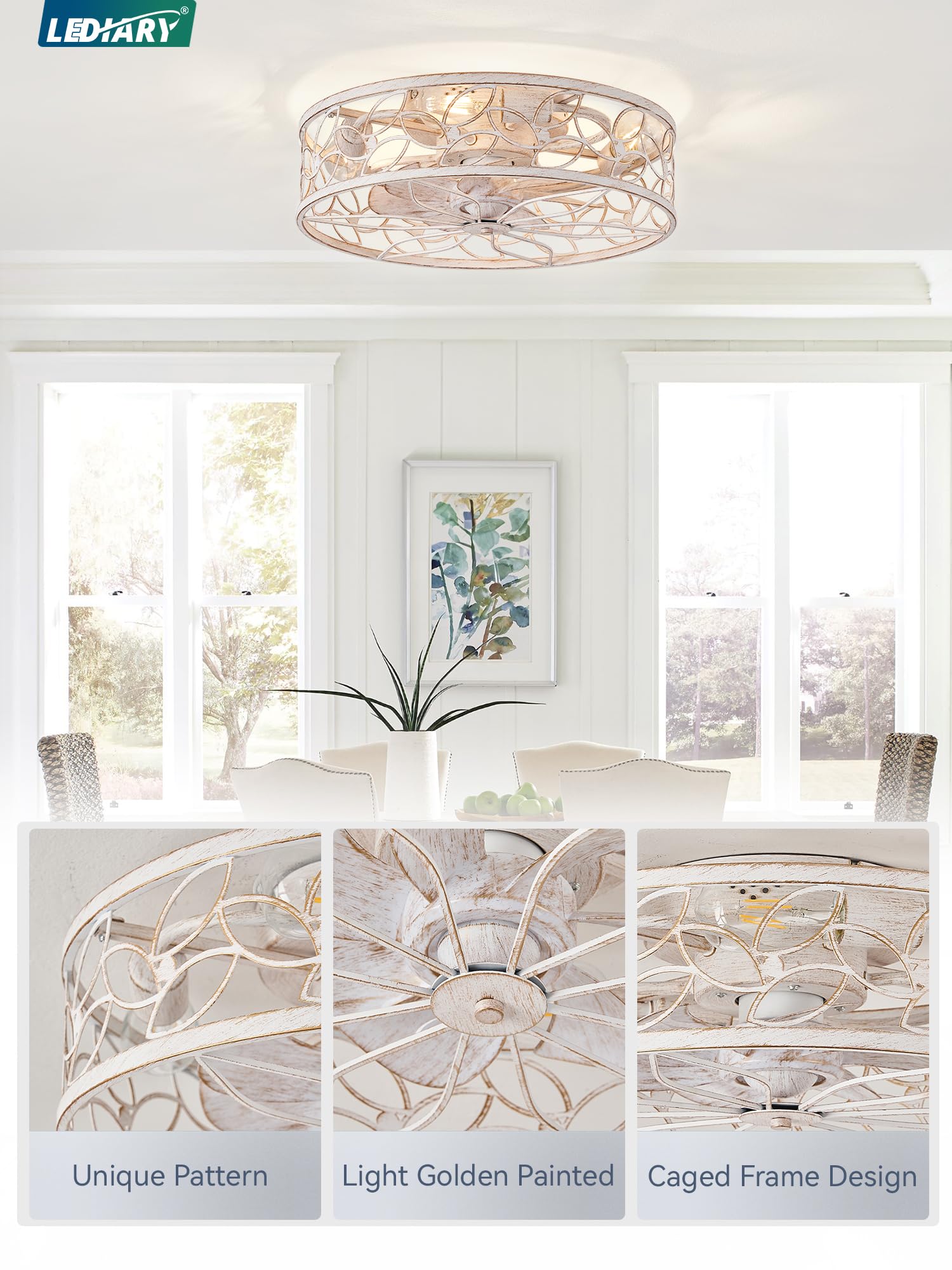LEDIARY Caged Ceiling Fans with Lights, White Flush Mount Ceiling Fan with Remote, Small Low Profile Bladeless Ceiling Fan Light Fixture for Bedroom, Kitchen, Dining Room-White Gold Color