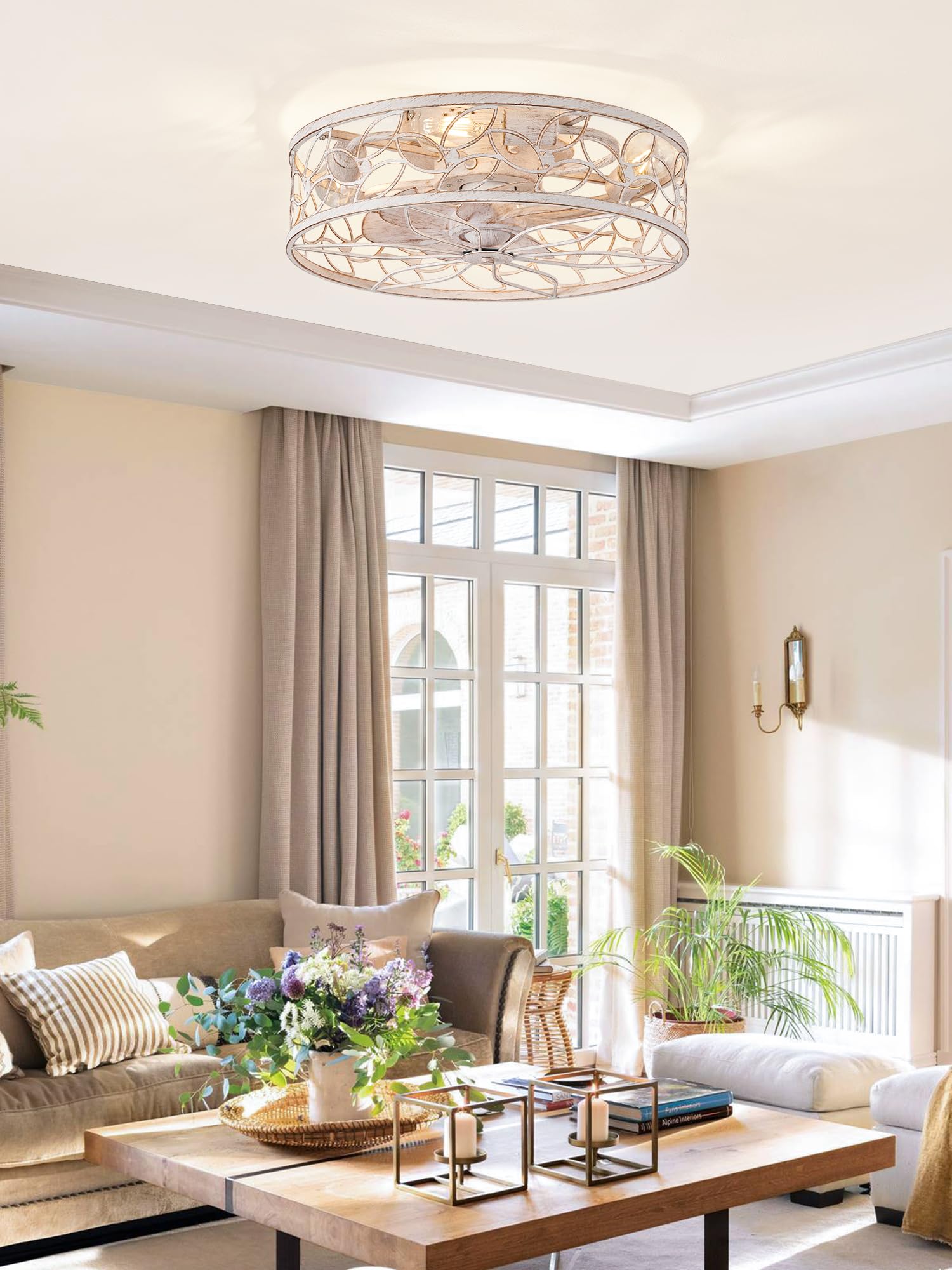 - 【Caged Design】The low profile ceiling fan has excellent coloring process and quality control, which combines practicality and aesthetics. It's designed with the farmhouse and modern style——cage shaped frame, white and golden painted finish and lacelike pattern, perfectly matching and decorating your home.