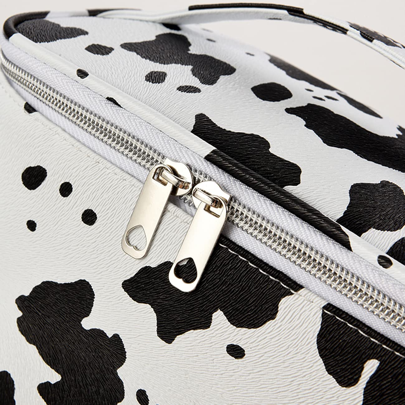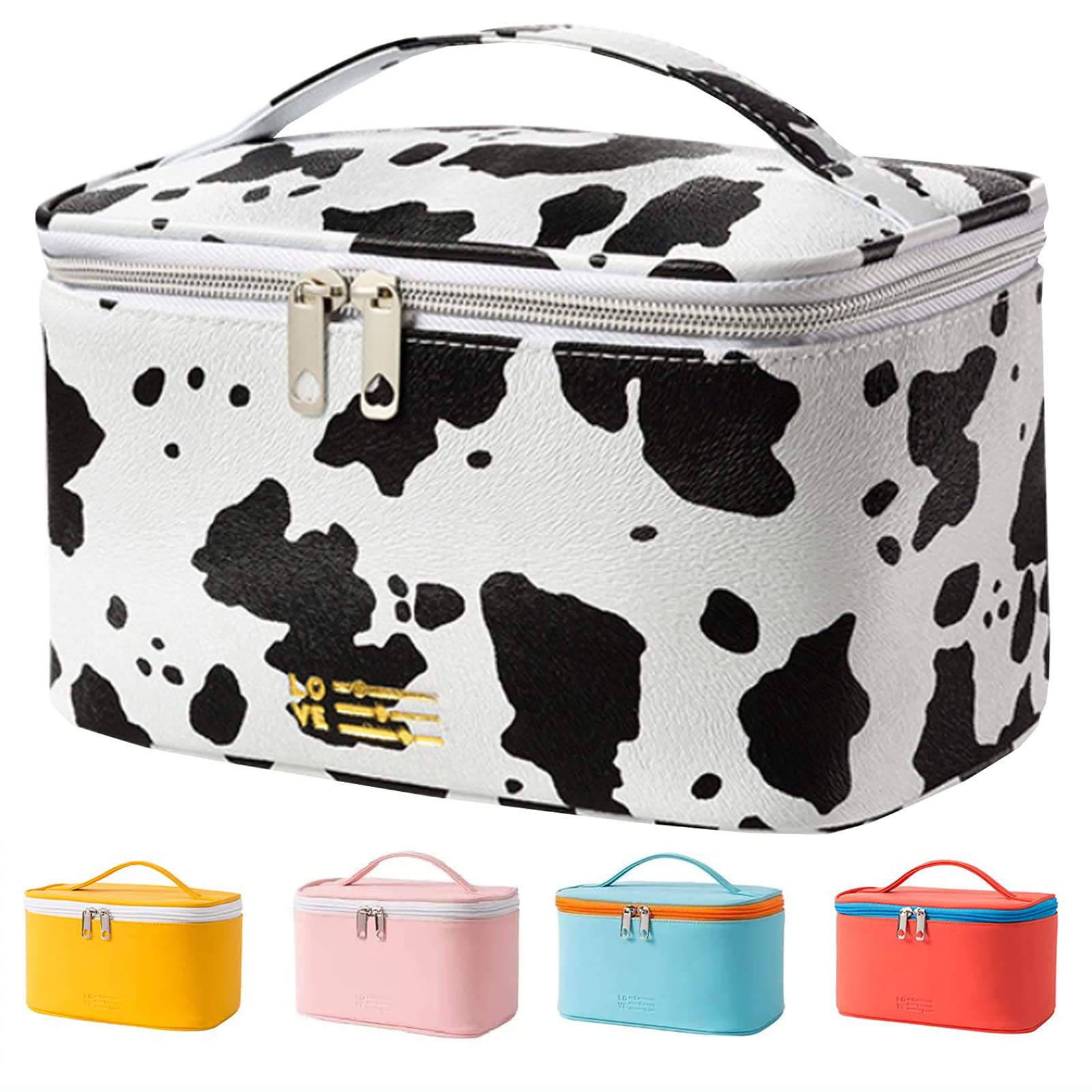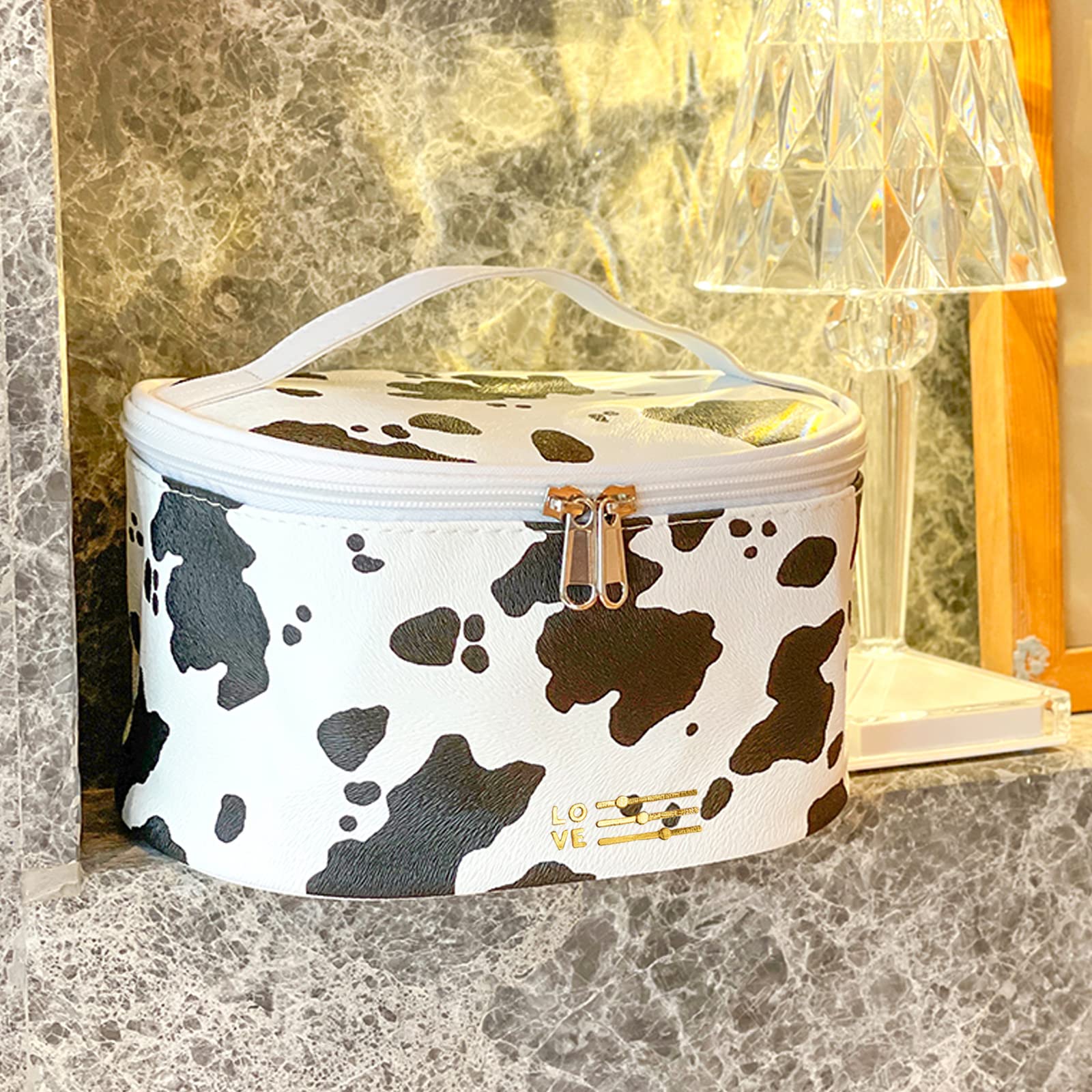 - SOOTHING COLOR: Stylish and kawaii cow print pattern design makes it a super cute makeup bag for ladies, not fade or crack for over time, it is simple and lightweight, holds tons of your daily makeup essentials products securely. It fits nicely into your overnight bag, carryon baggage or suitcase. Wide and firm handle for easy carrying