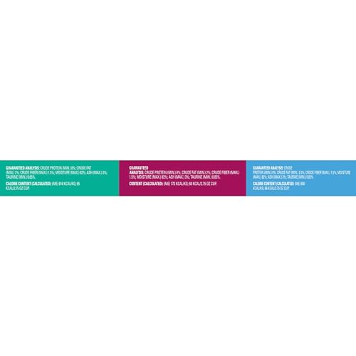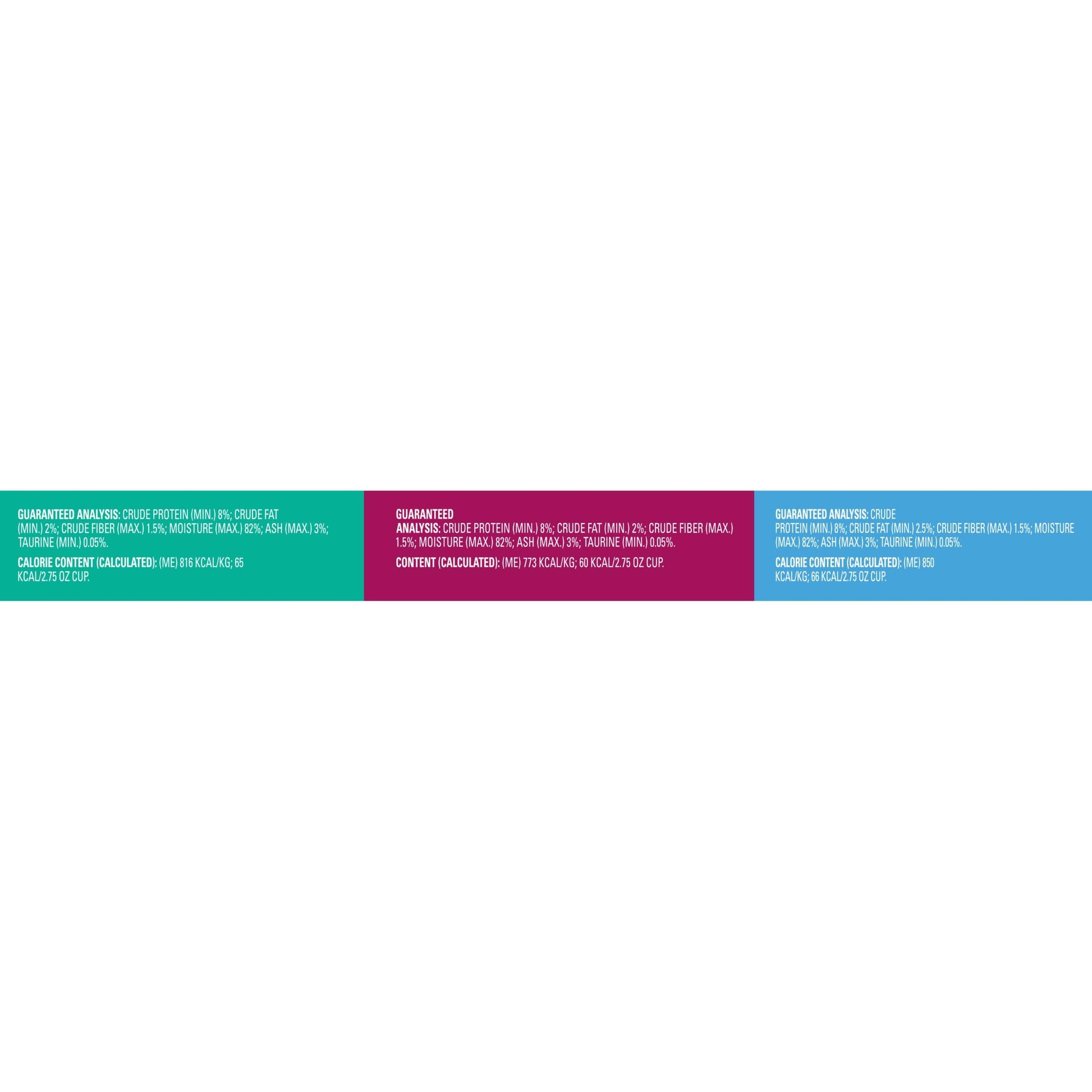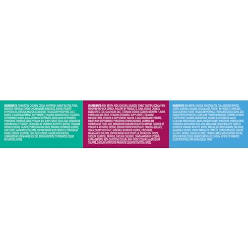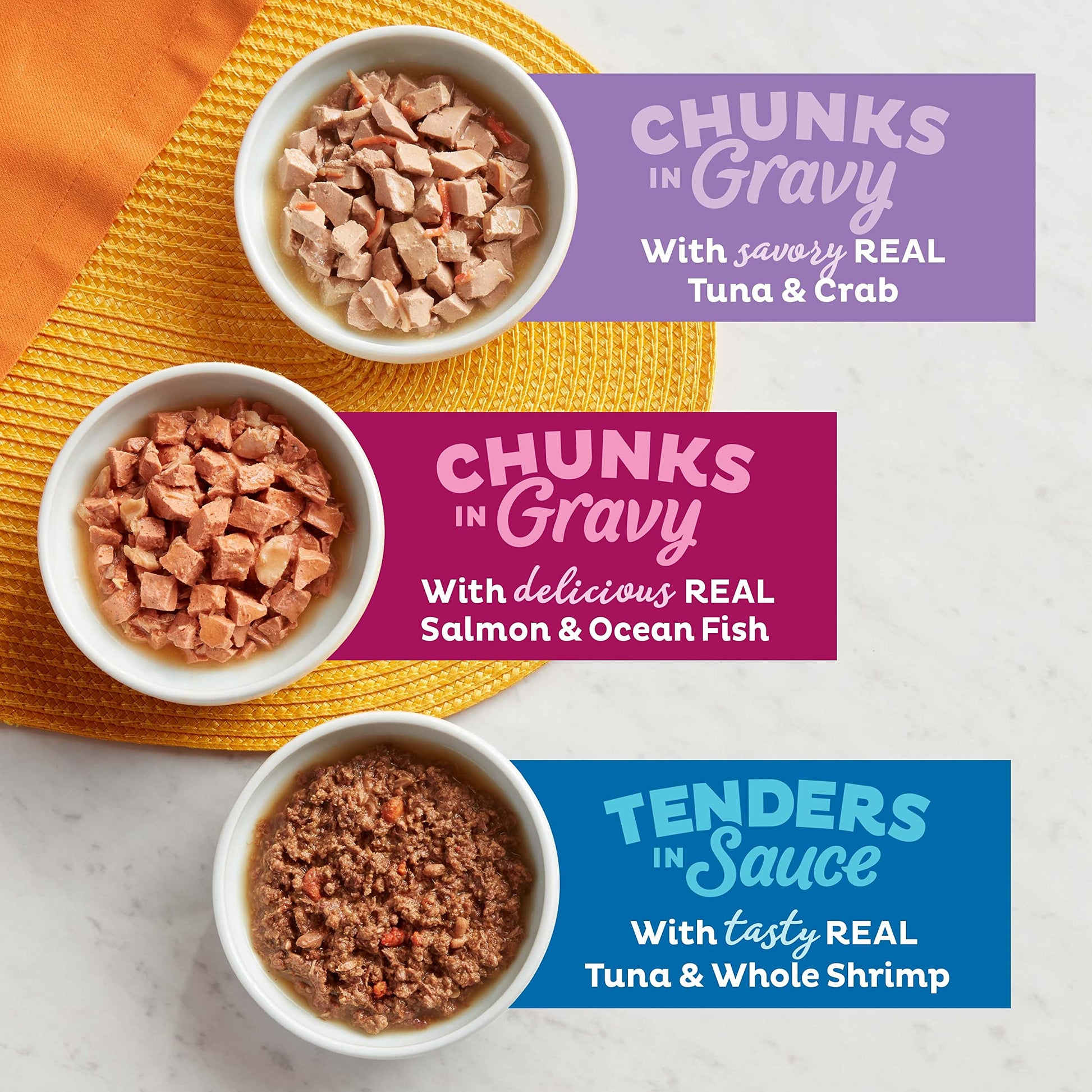 - Eight (8) cups of Tenders in Sauce With real Tuna & Whole Shrimp, eight (8) cups of Chunks in Gravy With real Salmon & Ocean Fish, and eight (8) cups of Chunks in Gravy With real Tuna & Crab