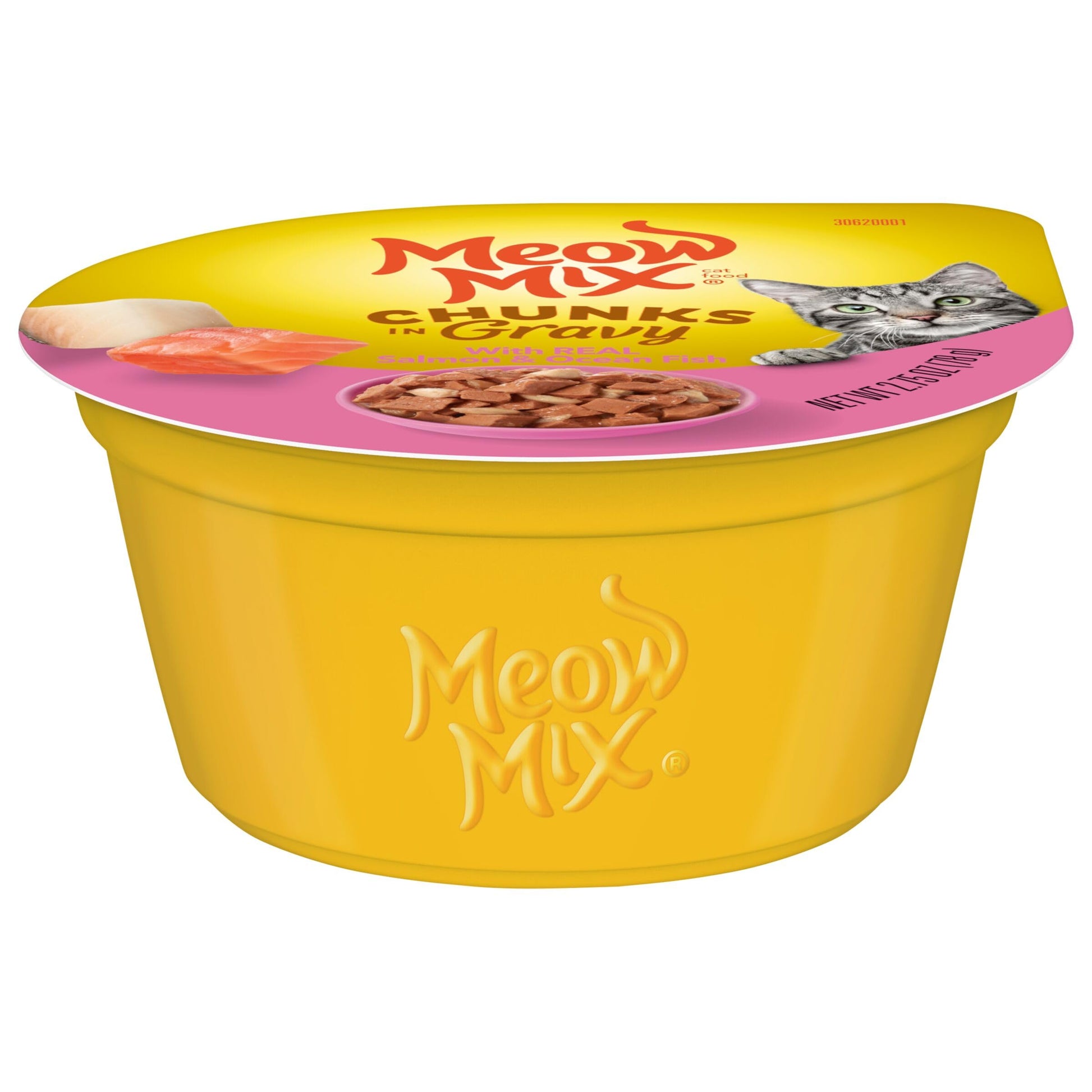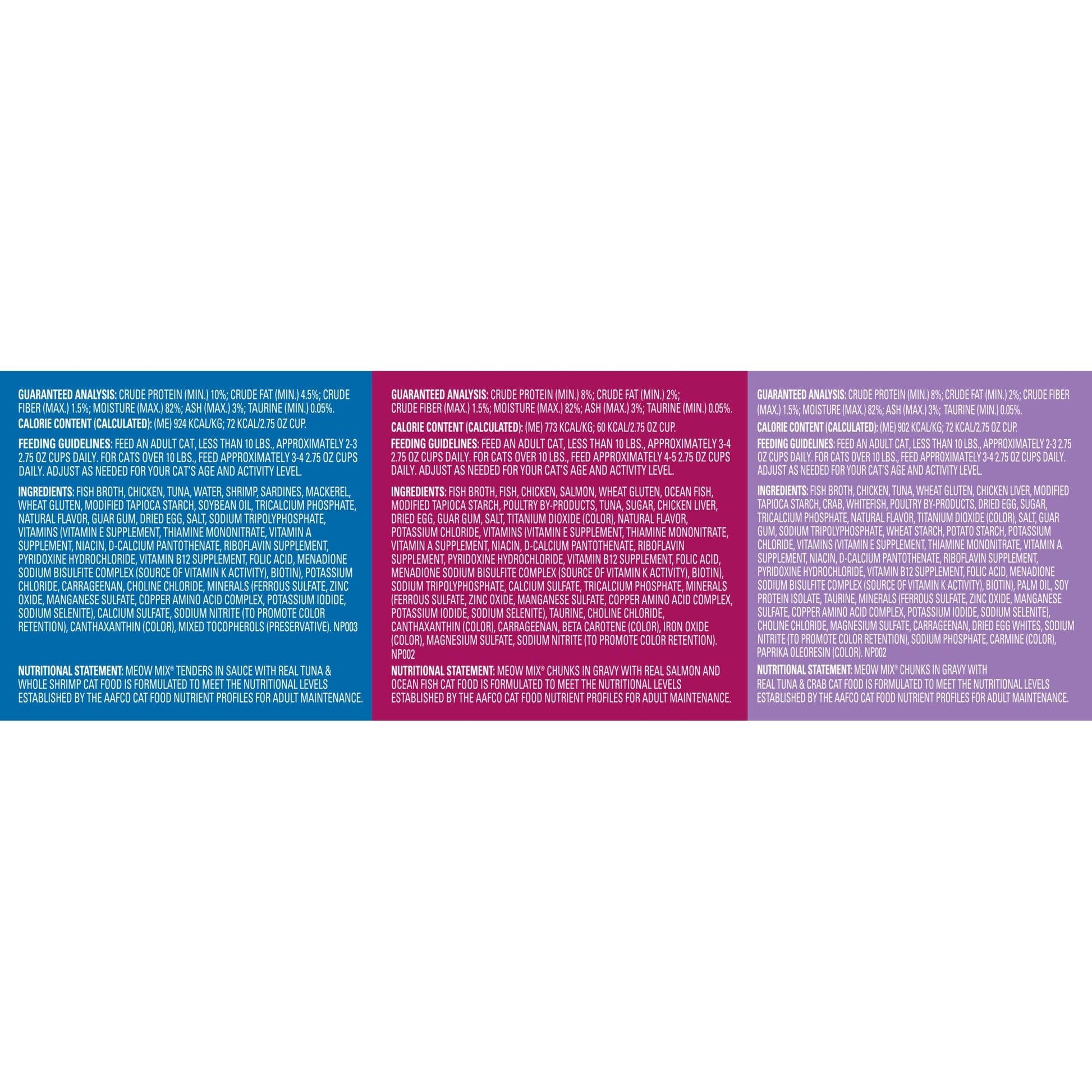 When it comes to mealtime, Meow Mix cat food is The Only One Cats Ask for By Name. So give them more of what they ask for with this irresistible Meow Mix wet cat food variety pack. Cats go crazy for the tastes and textures of all three (3) recipes inside: Tenders in Sauce With real Tuna & Whole Shrimp, Chunks in Gravy With real Salmon & Ocean Fish, and Chunks in Gravy With real Tuna & Crab. Each recipe provides 100% complete and balanced nutrition for cats in all life stages, from kittens to adults to seniors. And the plastic cups with peel-off lids make mealtime easy, no can opener required. Stock up now to make feeding your cat more fun for both of you.