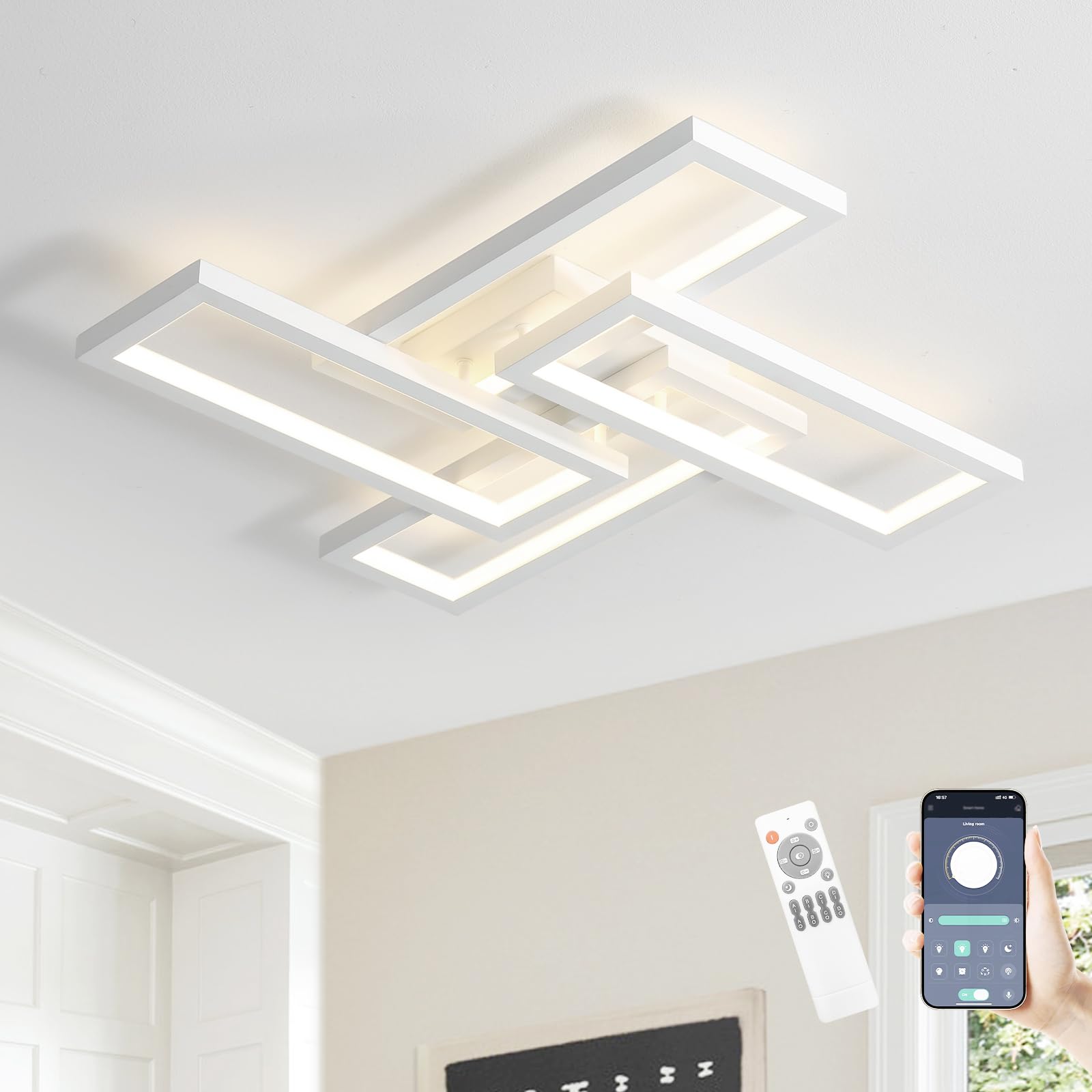 Modern LED Ceiling Light, kitchen light fixtures, Square LED Flush Mount Ceiling Light, APP and Remote Control Dimming with Memory 3000K-6500K for Dining Room, Living Room, Bedroom, Office (White)