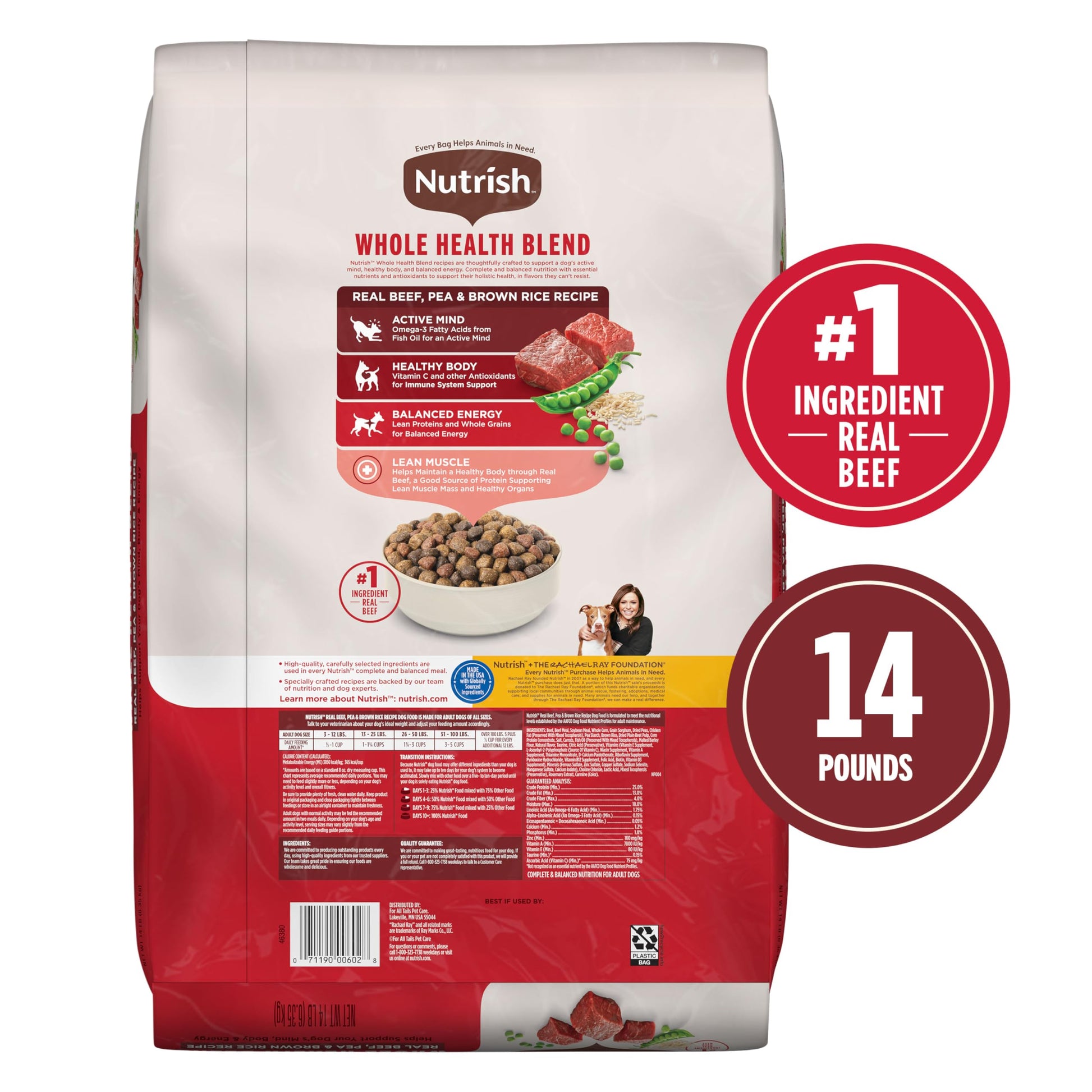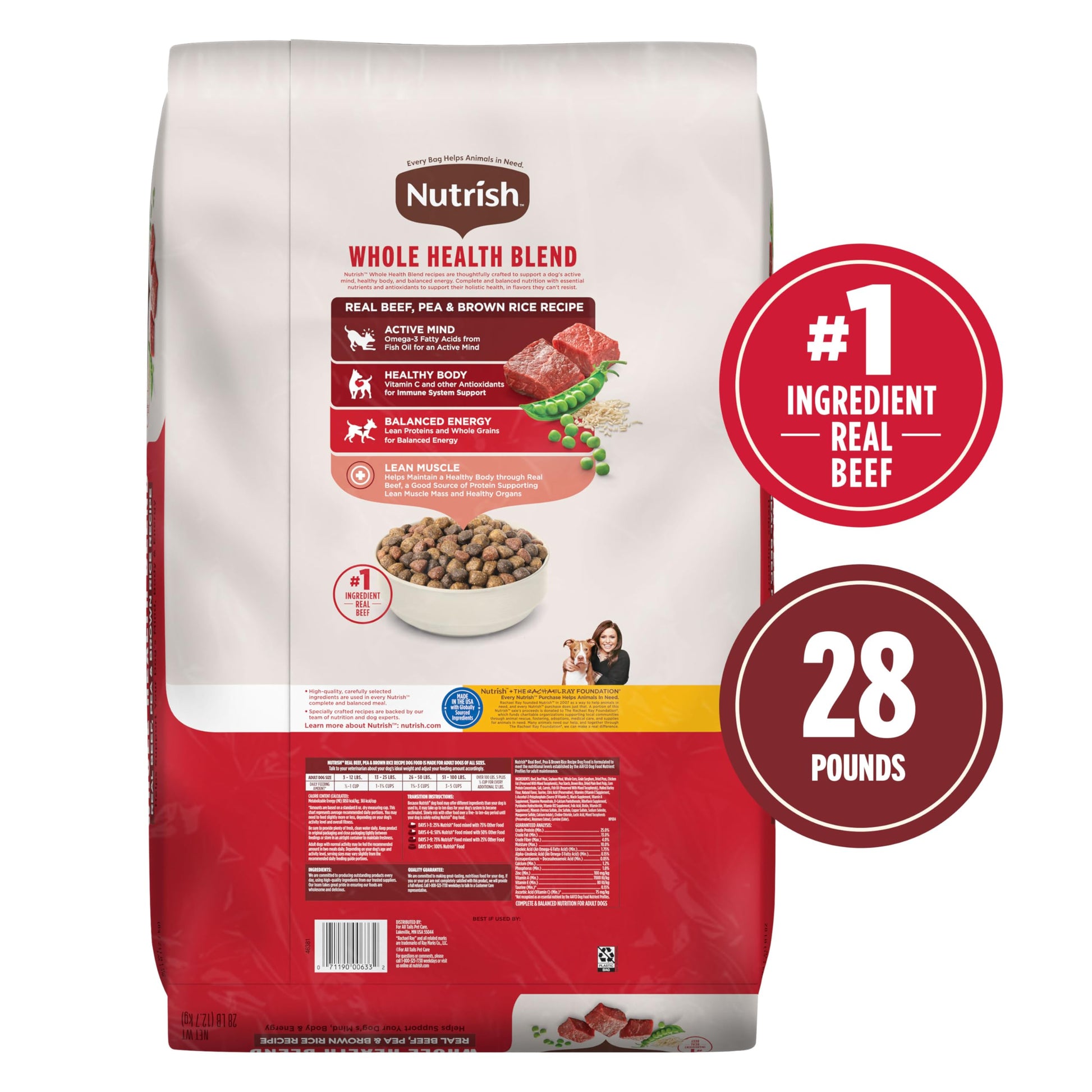Want to feed your dog delicious and nutritious meals? Nutrish Real Beef, Pea and Brown Rice Recipe Whole Health Blend Dry Dog Food is the perfect choice. Made with real beef as the #1 ingredient, this premium dry dog food is packed with protein to help support lean muscle mass and healthy organs. Formulated for small, medium and large breed adult dogs, it provides complete and balanced nutrition without artificial flavors, artificial preservatives, or poultry by-product meal. Nutrish Whole Health Blend recipes are thoughtfully crafted to support a dog's active mind, healthy body, and balanced energy. Complete and balanced nutrition with essential nutrients and antioxidants to support their holistic health, in flavors they can't resist. Your dog will love the hearty flavor of this beef dog food, and you’ll feel great knowing that a portion of every purchase supports The Rachael Ray Foundation to help animals in need. Grab a bag now and treat your dog to the delicious nutrition they deserve.