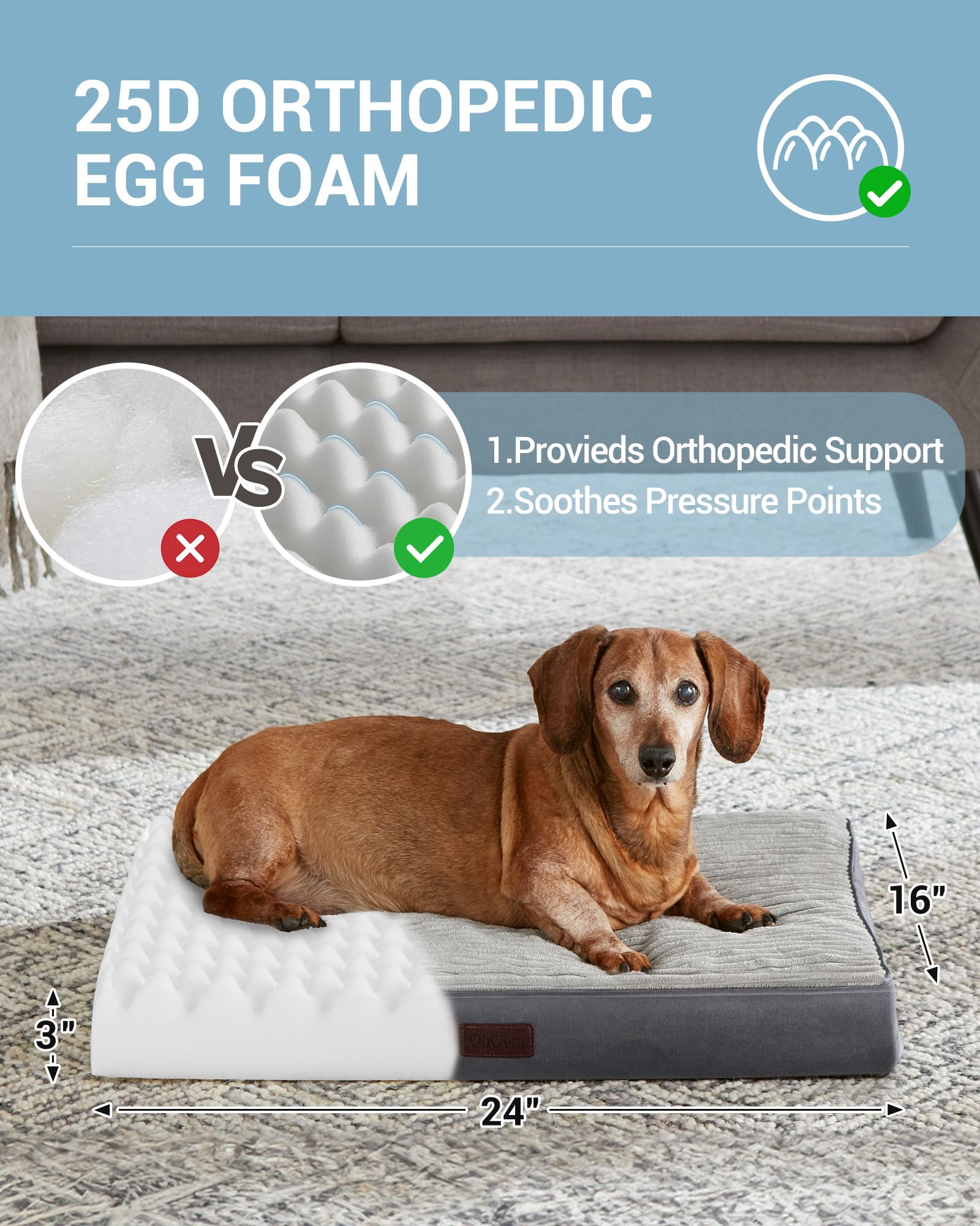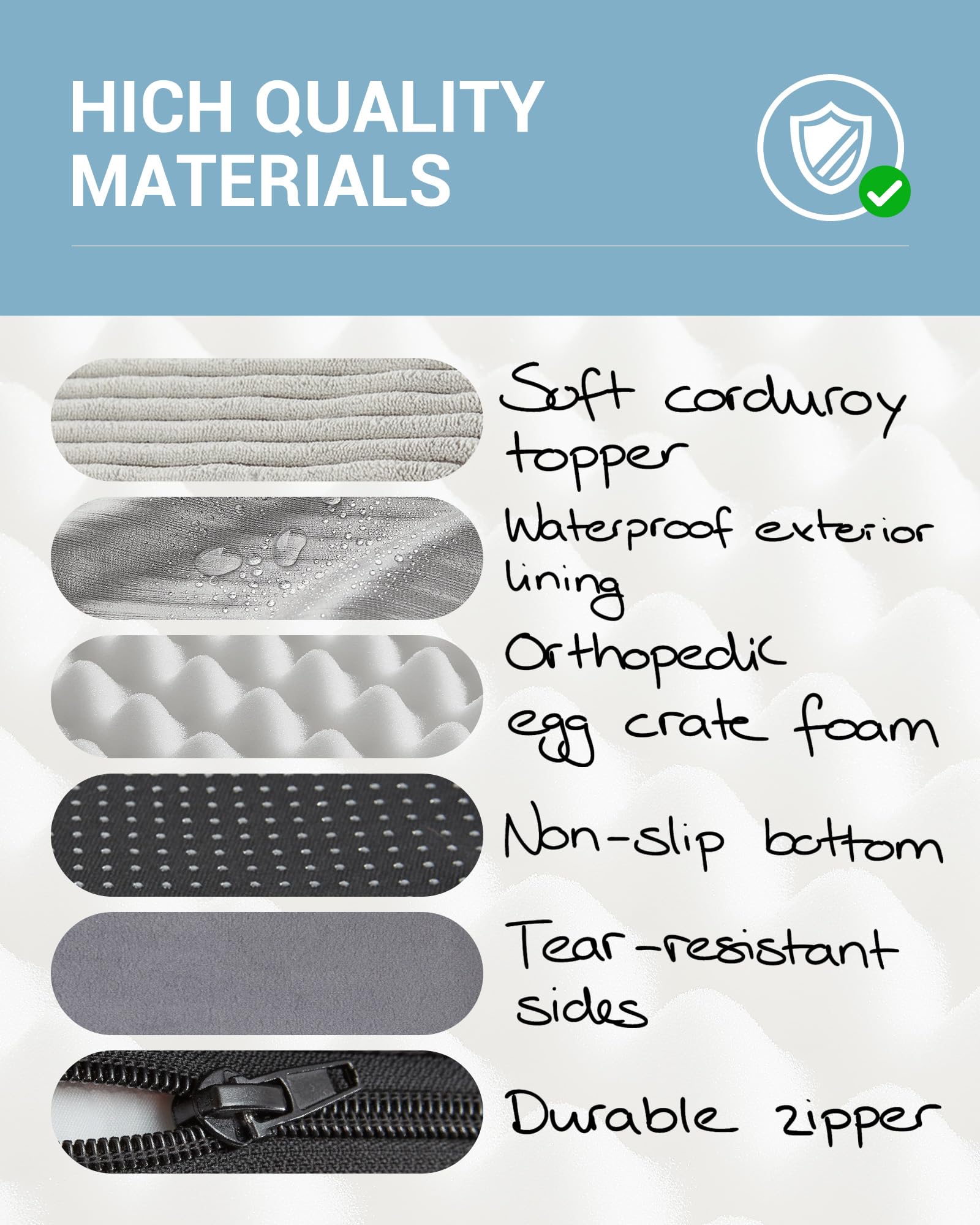 - Luxurious Comfort & Durability: Enjoy premium quality materials – plush corduroy surface with a 2-3 mm hair length, bonded with TPU for water resistance, and 25D Egg Crate Foam. Rest assured, our beds pass rigorous CP65 testing, ensuring safety and comfort for your pet.