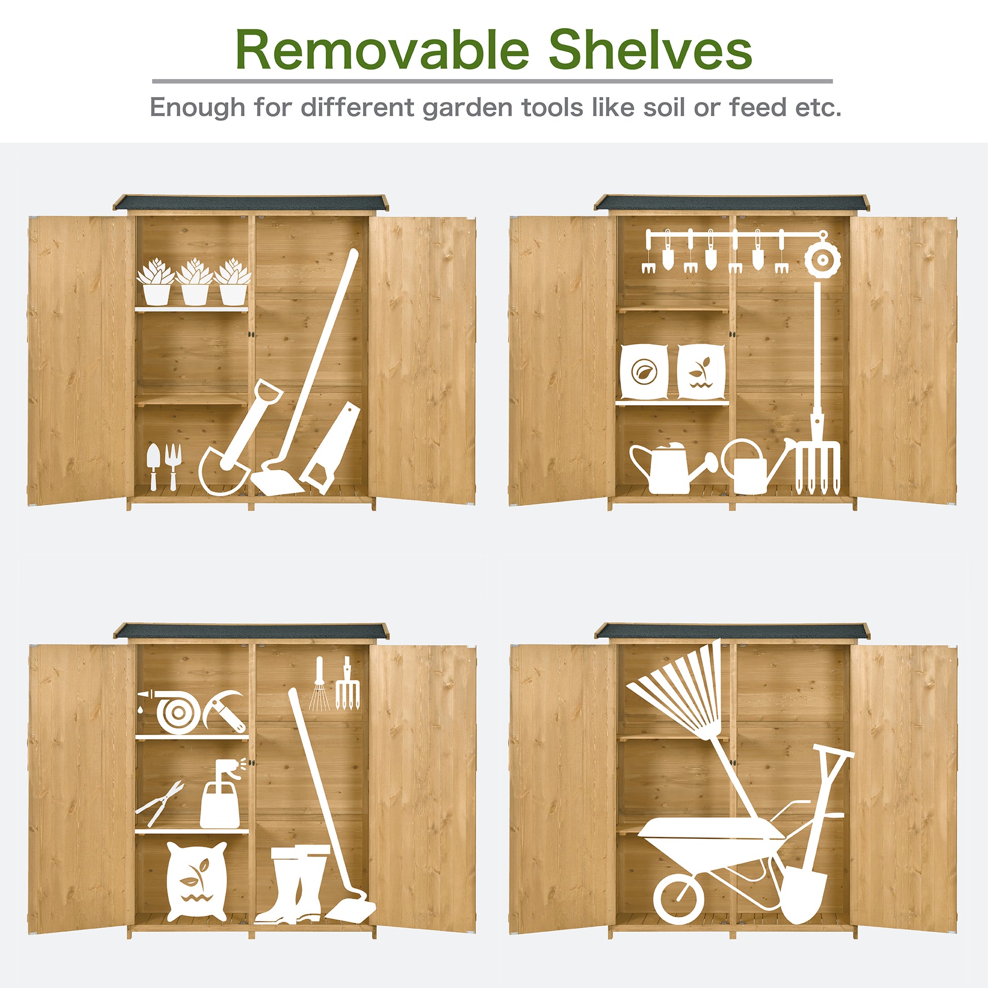 [Spacious Storage Room] With 3-tier shelves, 2 of which are removable, and 1 large space inside, the tool organizer is deal for storing different tools and accessories such as watering can, spades, pots even some long tools etc. Each shelf of this tool storage cabinet can hold 33 lbs which is suitable for many kinds of outdoor equipment.