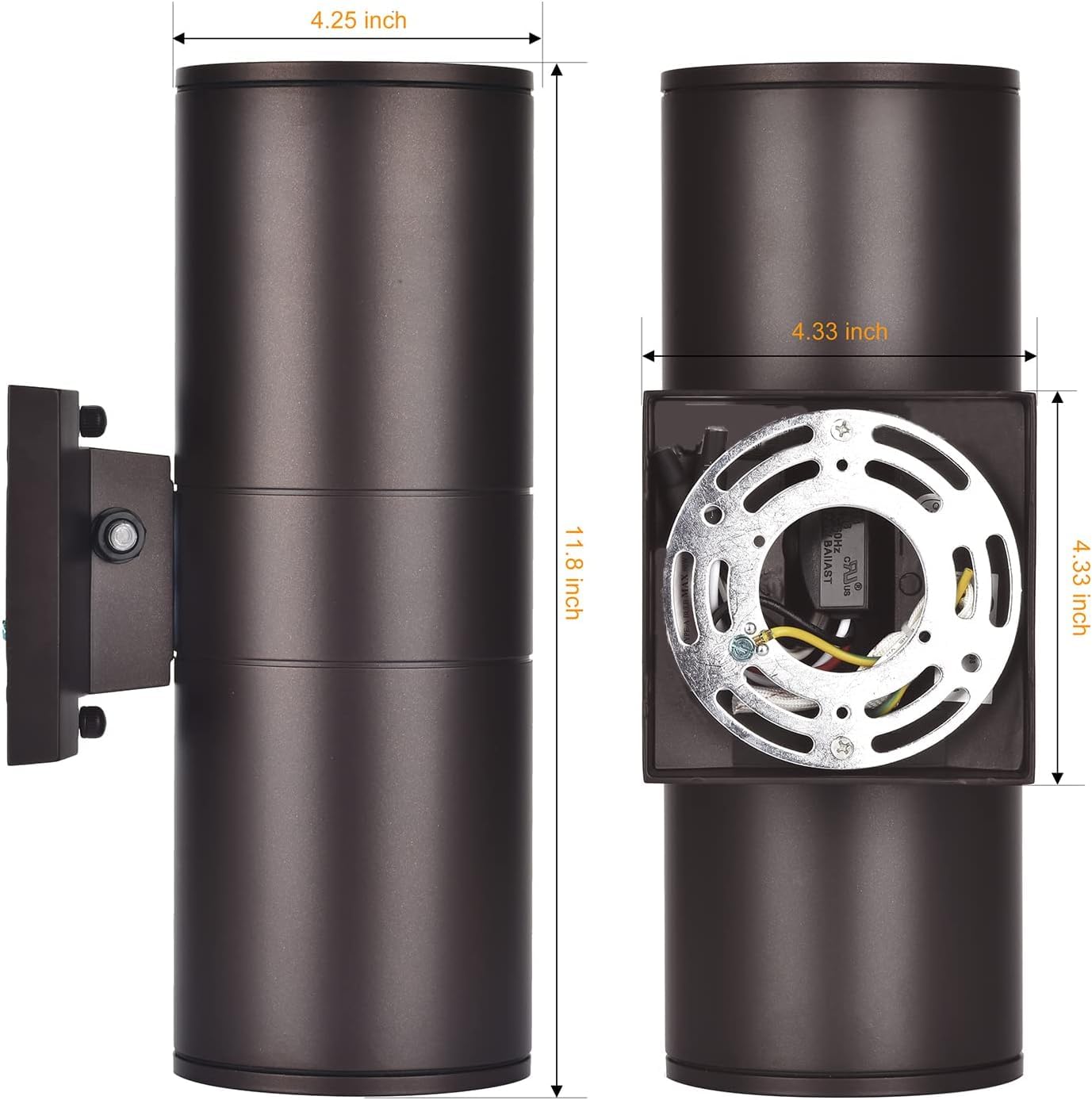 Light Fixture: φ4.3” x H11.8”.Back Plate: 4.3”x4.3”. All the bulbs based E26 is compatible for our exterior light fixture