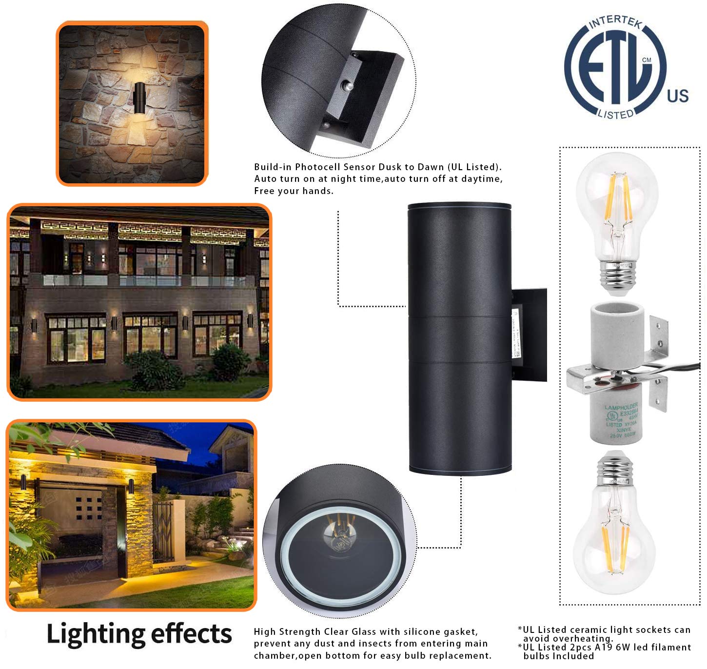 - ✅No Rust & ETL-listed Outdoor Wall Lights: dusk to dawn outdoor lighting fixtures body are made of heavy duty die-casting aluminum,Ensure outdoor front porch lights more sturdy are able to resistance to heat,impact,low temperature. ETL-listed, Safety Ensured. IP65 waterproof outside house lights can withstand the baptism of wind and rain.