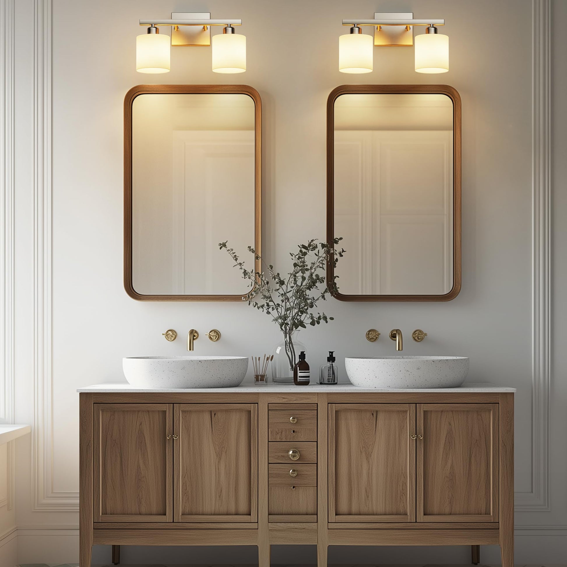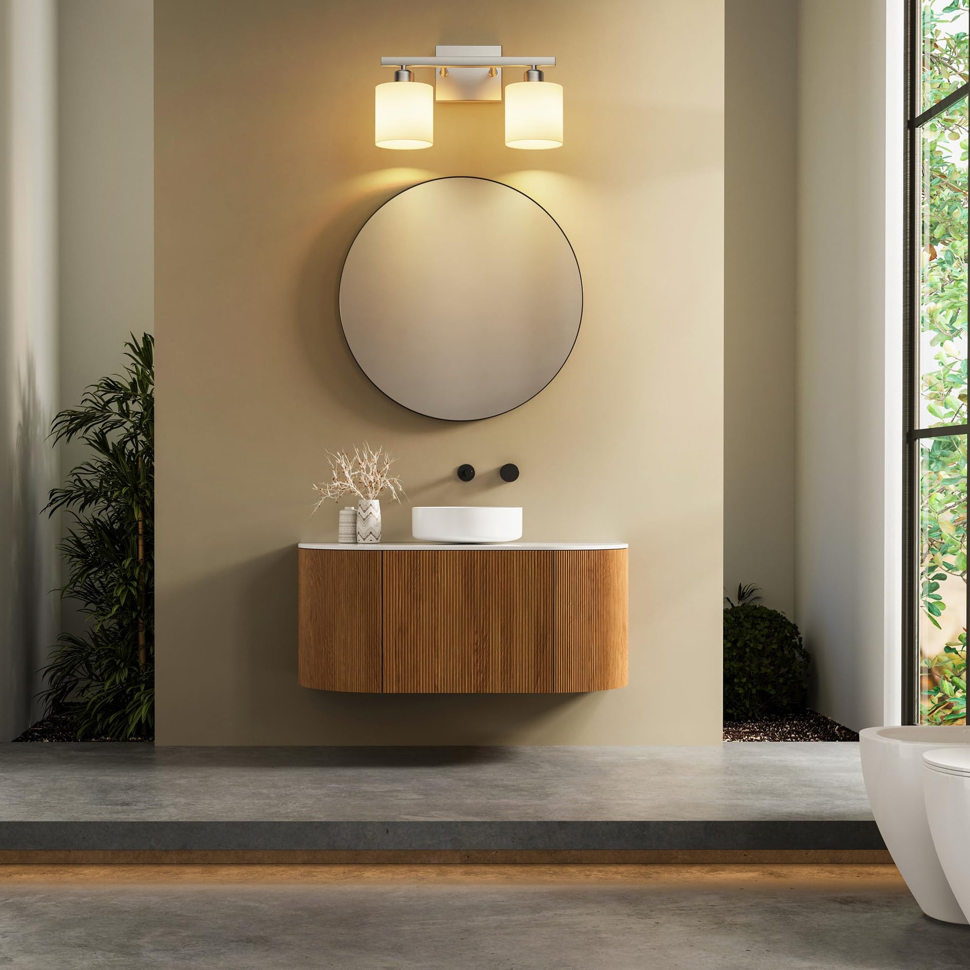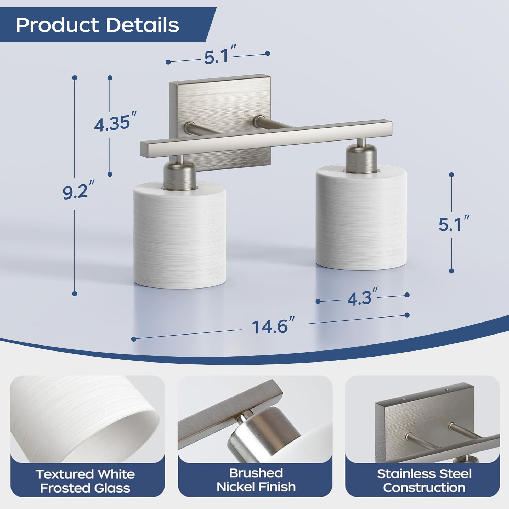 - Modern lighting design: mingle function design with sophisticated style with PARTPHONER bath vanity light. Featuring a stylish brushed nickel finish and textured white cylindrical glass shades, this bath lighting collection adds a pleasing touch of elegance to your home. Ideal for any bathroom in coastal, luxury, modern, and transitional settings