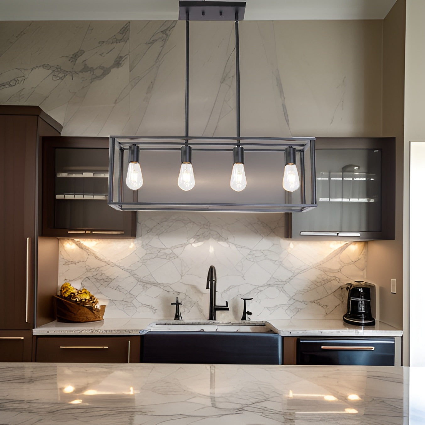 Rectangular Chandelier with 4 Lights: This contemporary lighting fixture, suitable for the kitchen island or dining room, boasts adjustable stems for hanging. The captivating open bulb design ensures that this farmhouse chandelier becomes a captivating focal point in any residence.