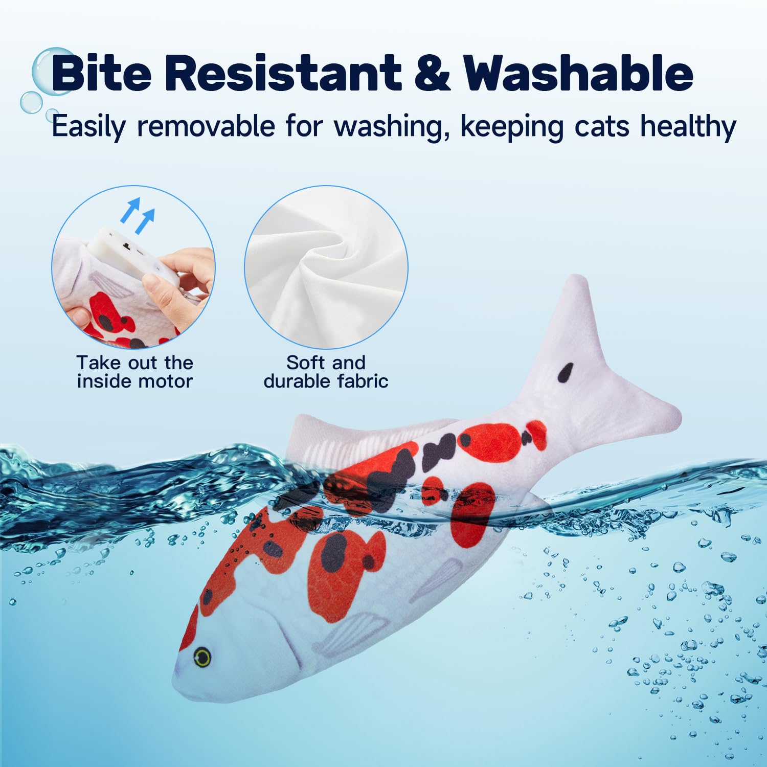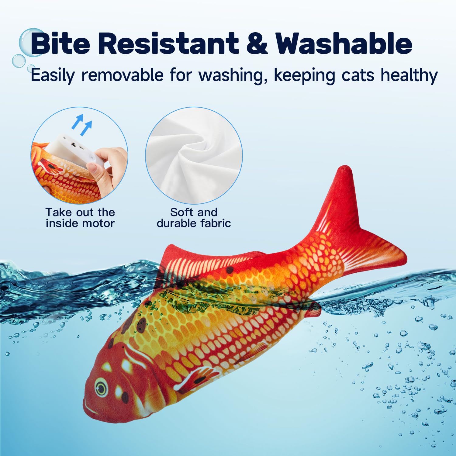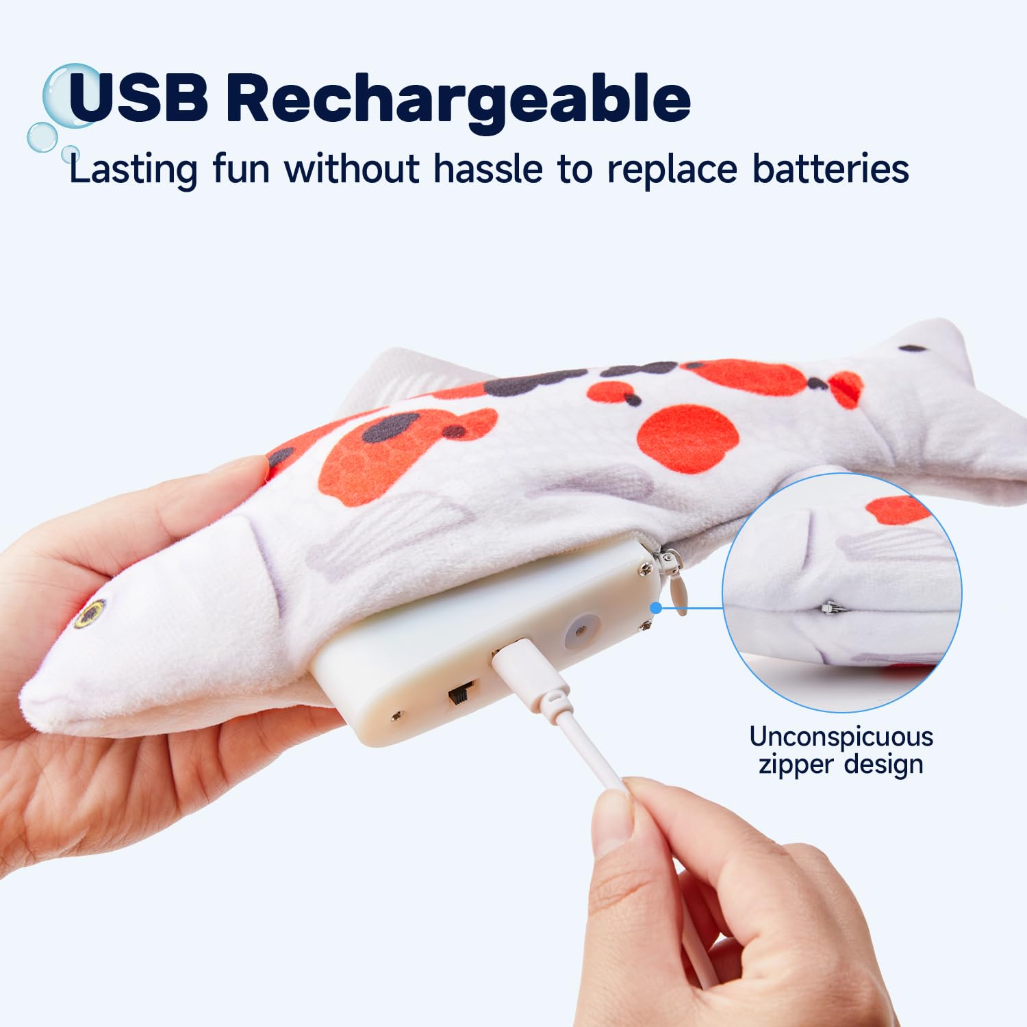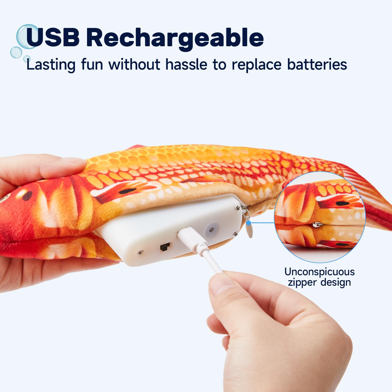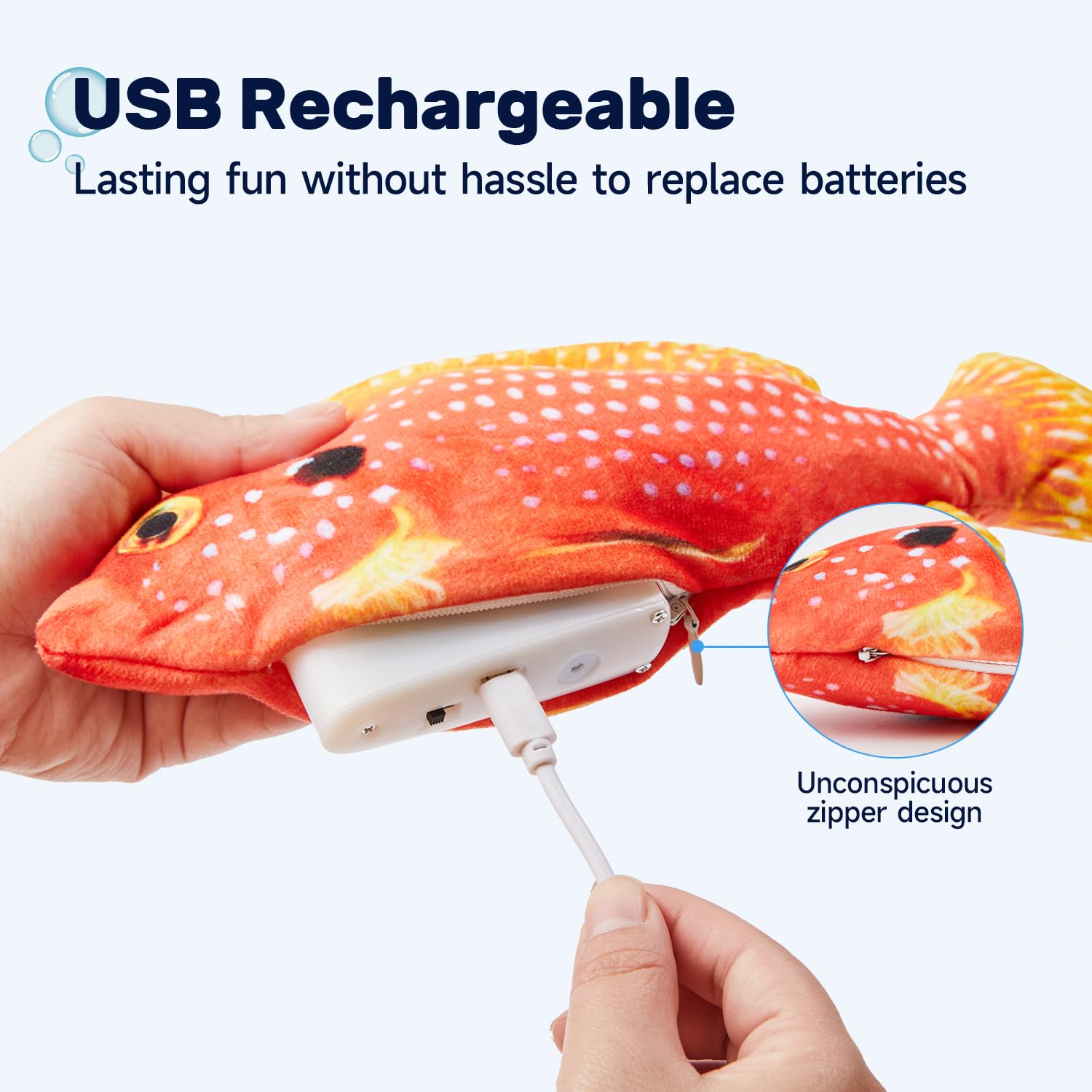 - USB Chargeable: this toy is USB chargeable which saves you from the hassle and costs to replace batteries. USB cable is included in the package. The included chargeable motor is detachable for convenient cleaning of the plush toy. Use Instructions: Unzip the fish belly, flip the switch on, and then tap the fish belly to make the fish flop; When charging, the red light comes on; When fully charged, the red light goes out