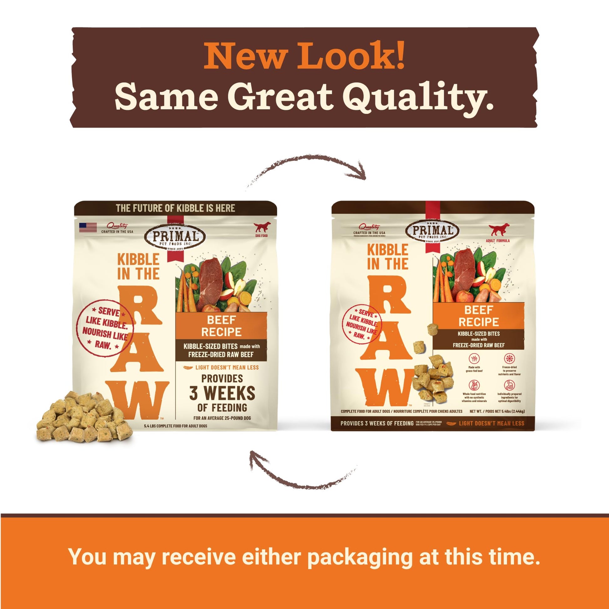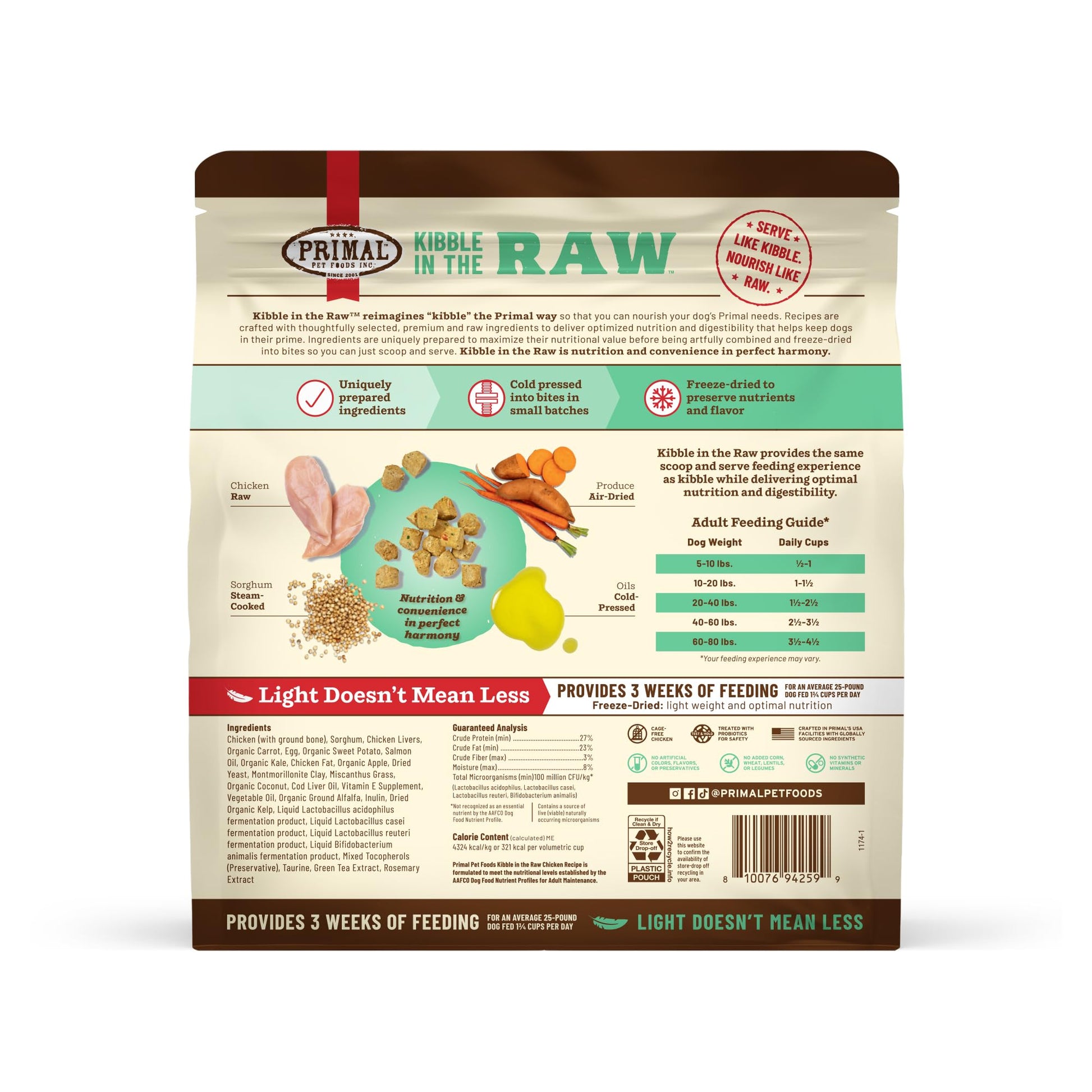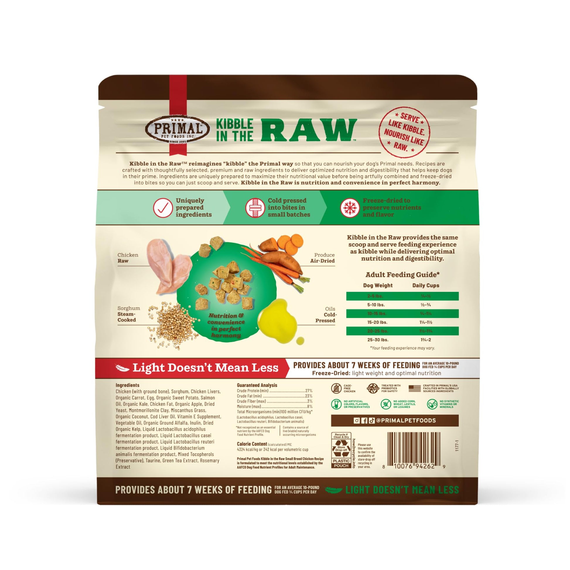 Primal Kibble in the Raw dog food reimagines premium dry dog food by combining the convenience of kibble with the superior nutrition of raw dog food. Dry freeze-dried dog food made with responsibly sourced protein for dogs like cage-free chicken, grass-fed beef, wild-caught fish, and crate-free pork, each recipe is crafted to deliver high-protein, nutrient-rich meals dogs love. Our freeze-dried food for dogs locks in essential nutrients and flavor, ensuring every bite supports digestion, energy, and overall vitality. With no fillers, synthetic vitamins, or common allergens, it’s the perfect choice for small dog breeds, medium dog breeds, large dog breeds, extra large dog breeds, puppies, senior dogs, dogs with sensitive stomachs or those needing a natural, wholesome diet. Scoop and serve raw kibble for dogs with ease, knowing you're providing premium raw nutrition for your furry family members, all crafted in the USA with the highest quality standards using our own kitchens. Alimenta a tu perro con alimentos de alta calidad, como comida para perros cruda liofilizada y croquetas saludables. Croquetas para perro.