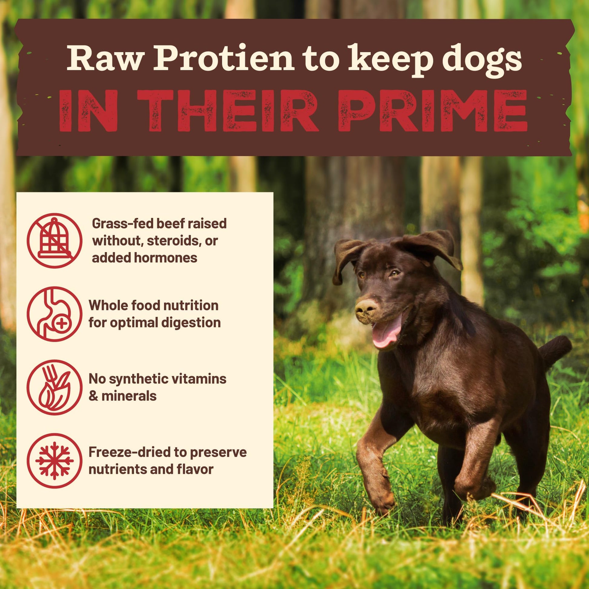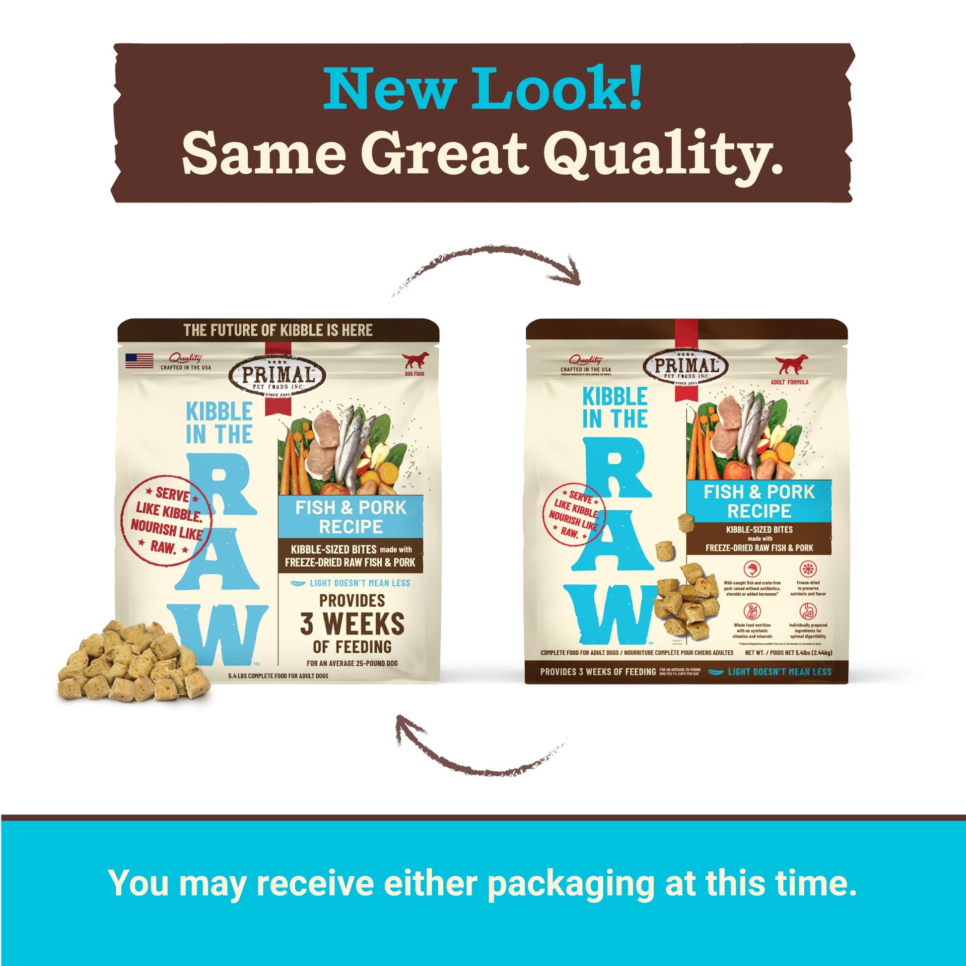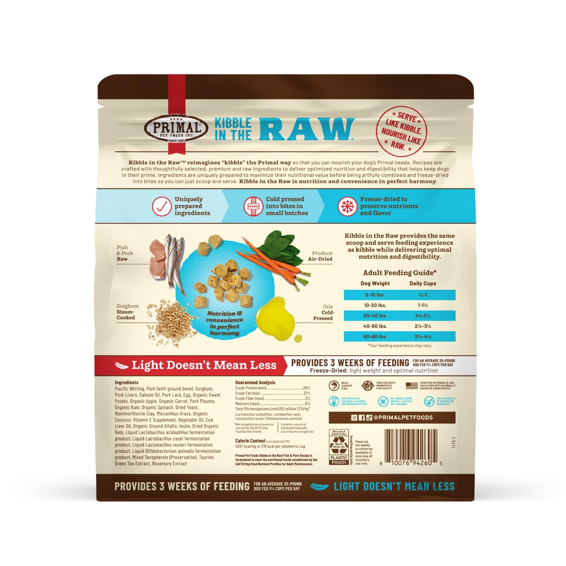 Primal Kibble in the Raw dog food reimagines premium dry dog food by combining the convenience of kibble with the superior nutrition of raw dog food. Dry freeze-dried dog food made with responsibly sourced protein for dogs like cage-free chicken, grass-fed beef, wild-caught fish, and crate-free pork, each recipe is crafted to deliver high-protein, nutrient-rich meals dogs love. Our freeze-dried food for dogs locks in essential nutrients and flavor, ensuring every bite supports digestion, energy, and overall vitality. With no fillers, synthetic vitamins, or common allergens, it’s the perfect choice for small dog breeds, medium dog breeds, large dog breeds, extra large dog breeds, puppies, senior dogs, dogs with sensitive stomachs or those needing a natural, wholesome diet. Scoop and serve raw kibble for dogs with ease, knowing you're providing premium raw nutrition for your furry family members, all crafted in the USA with the highest quality standards using our own kitchens. Alimenta a tu perro con alimentos de alta calidad, como comida para perros cruda liofilizada y croquetas saludables. Croquetas para perro.