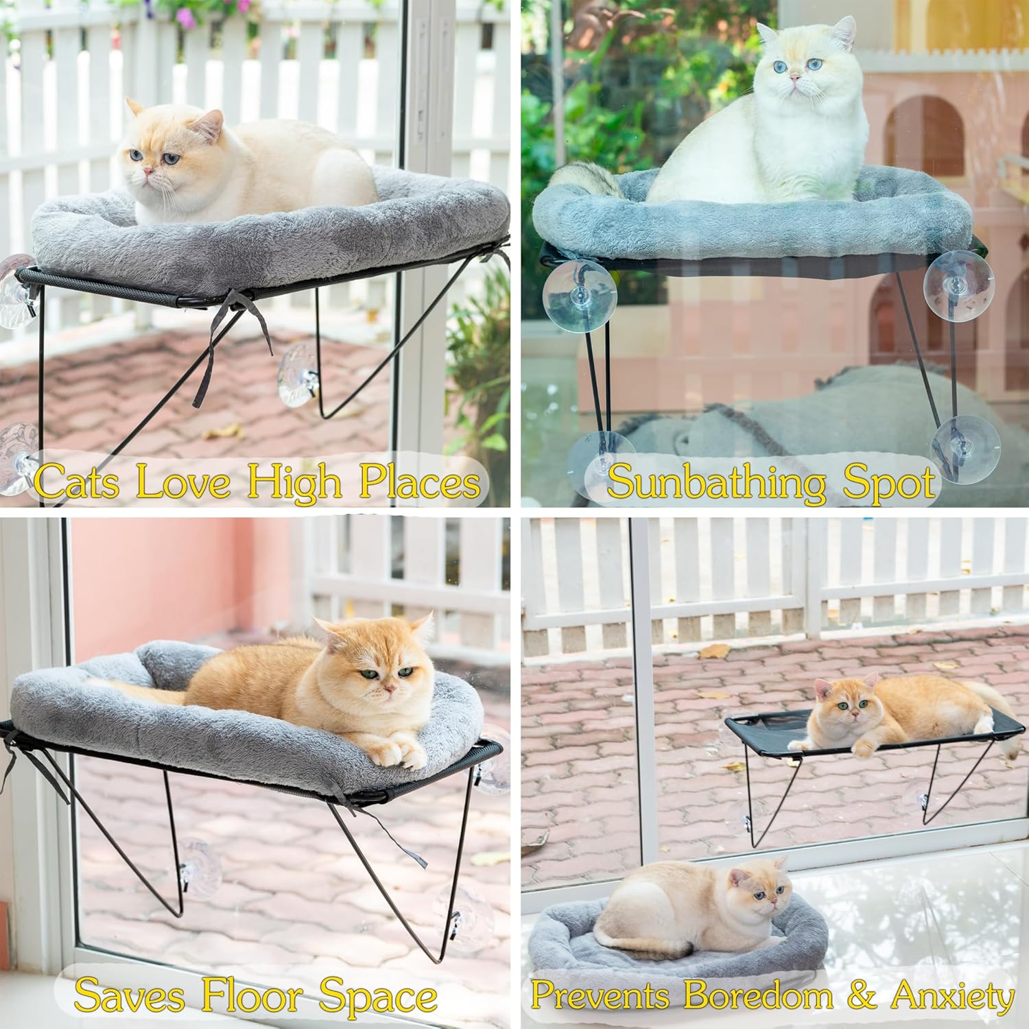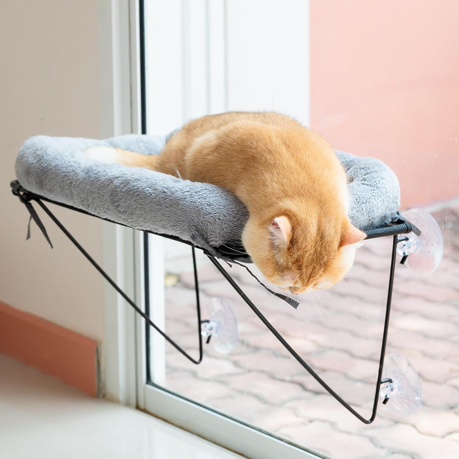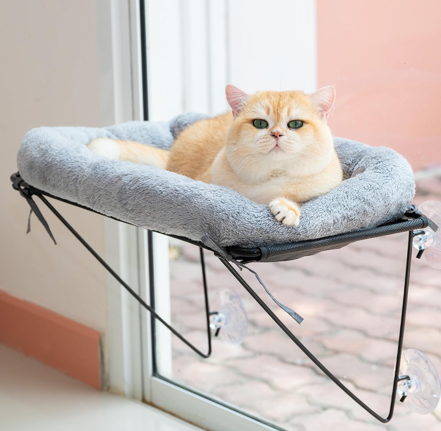 - 🐱👤Easy to Assemble, Remove & Clean – This cat window perch comes with simple, tool-free assembly. Just connect the sturdy steel frame and bedding base, secure it to your chosen window with the strong suction cups, and place the soft cotton bedding on top. Let your cat enjoy their cozy new perch and the outdoor scenery. When it’s time to clean, simply machine wash the cotton bedding for effortless maintenance.
