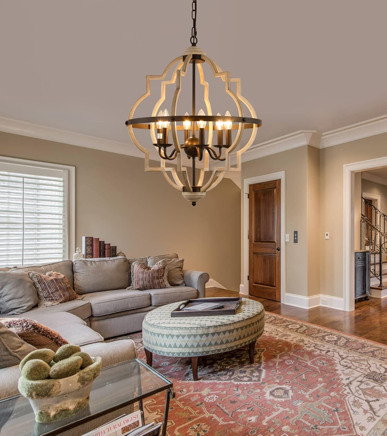 Transform your space into a cozy farmhouse retreat with this beautiful chandelier. Its rustic yet luxurious appearance makes it a perfect addition to any dry place, whether it's your home, restaurant, or workshop. Order now and brighten up your living space with style!