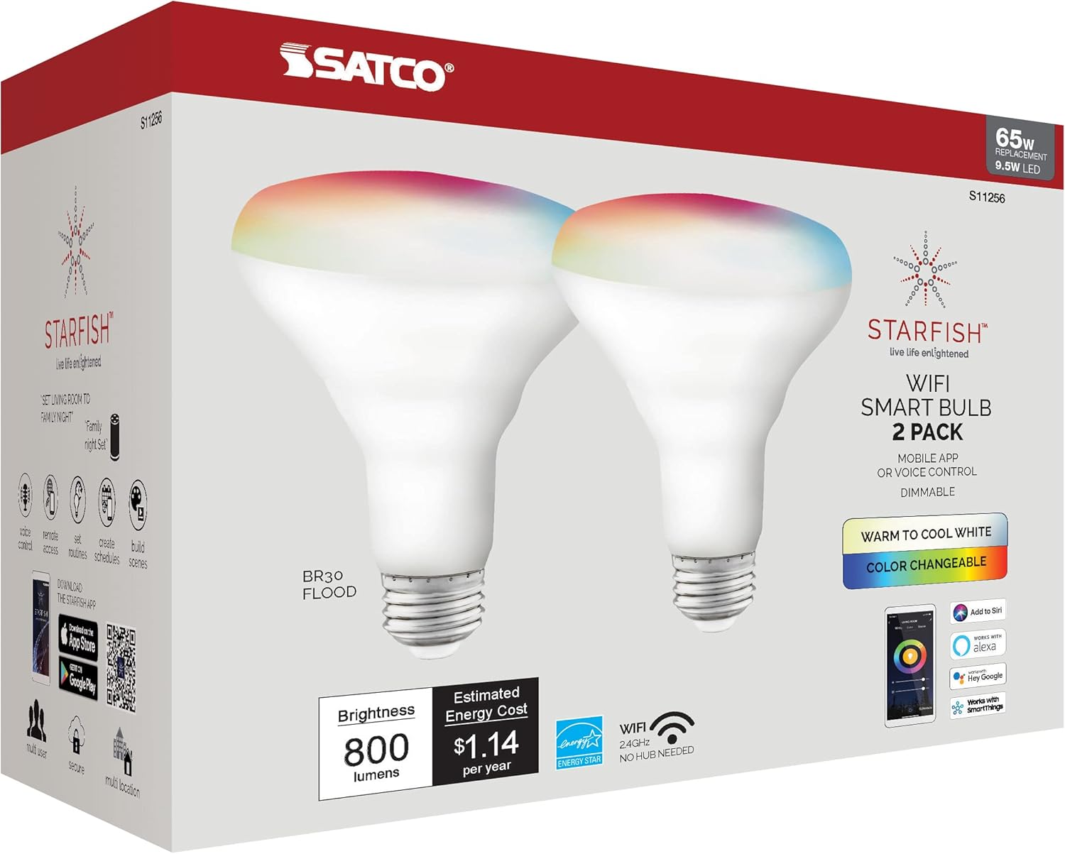 Satco S11256 Starfish BR30 WiFi Smart LED Light Bulb, Works with Siri, Alexa, Google Assistant, SmartThings, 9.5 Watt, 120 Volt, 800 Lumens, Color Changing & Tunable White, 2-Pack