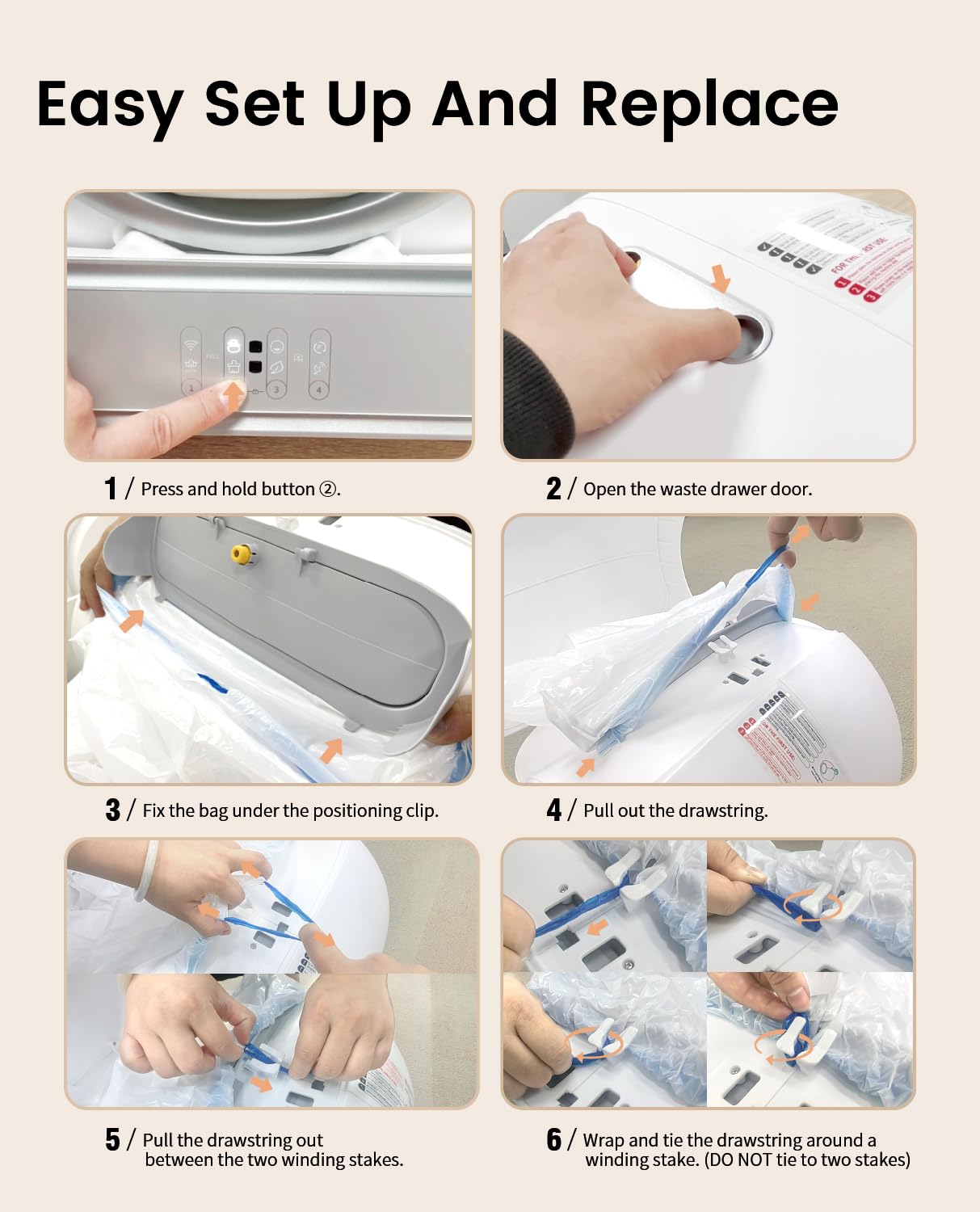 - 【EASY TO INSTALL & CLEAN】No tools are required to install the large cat litter box. Simply plug in, pour in the cat litter, and you can enjoy the scoop-free experience, ensuring that your cat always has a fresh and clean litter box. Daily cleaning is incredibly easy. The waste full indicator will let you know when it's time to change the litter liner. Moreover, the disassemble barrel is washable for effortless cleaning.