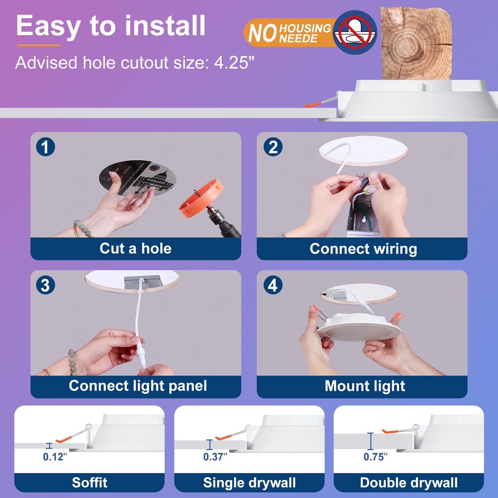 - [Easy to install] The outer diameter of the LED downlight is Ø4.7in,Ceiling cutout: 3.1-4.7in,the suitable installation depth: 1.57in, the installation is convenient and safe. It is suitable for installation and use in different places , such as home,hotel,coffee shop, restaurant,Bar,game room,etc.