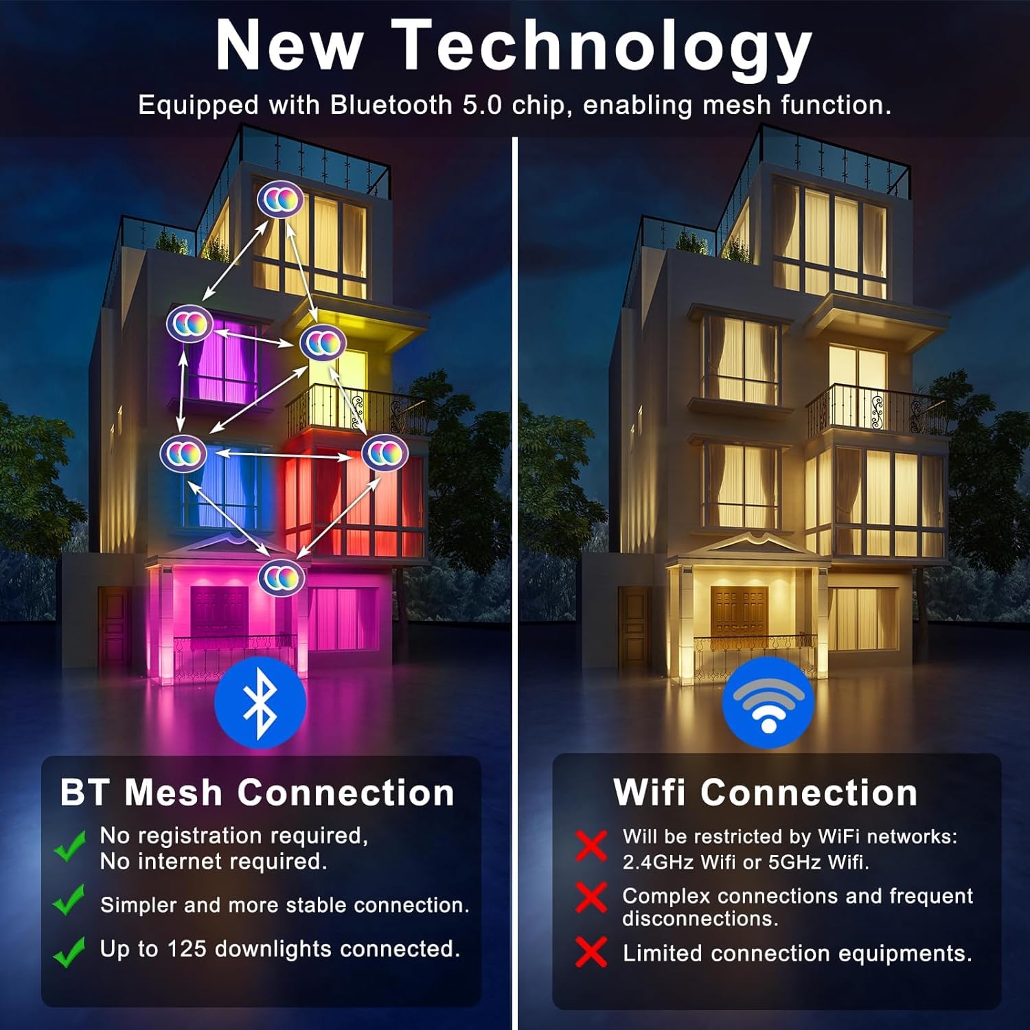 - [BT Mesh Technology] Smart downlight is equipped with Bluetooth 5.0 chip to realize mesh function. Does not occupy the router broadband, and is stable and does not drop the line. A simple application gives you the freedom to control any number of lights (up to 125 lights). BT Mesh is an excellent solution for multi-lamp control, which solves the shortcomings of short control distance of IR remote control lamp, few lamps and disconnection of WIFI lamp due to network speed.