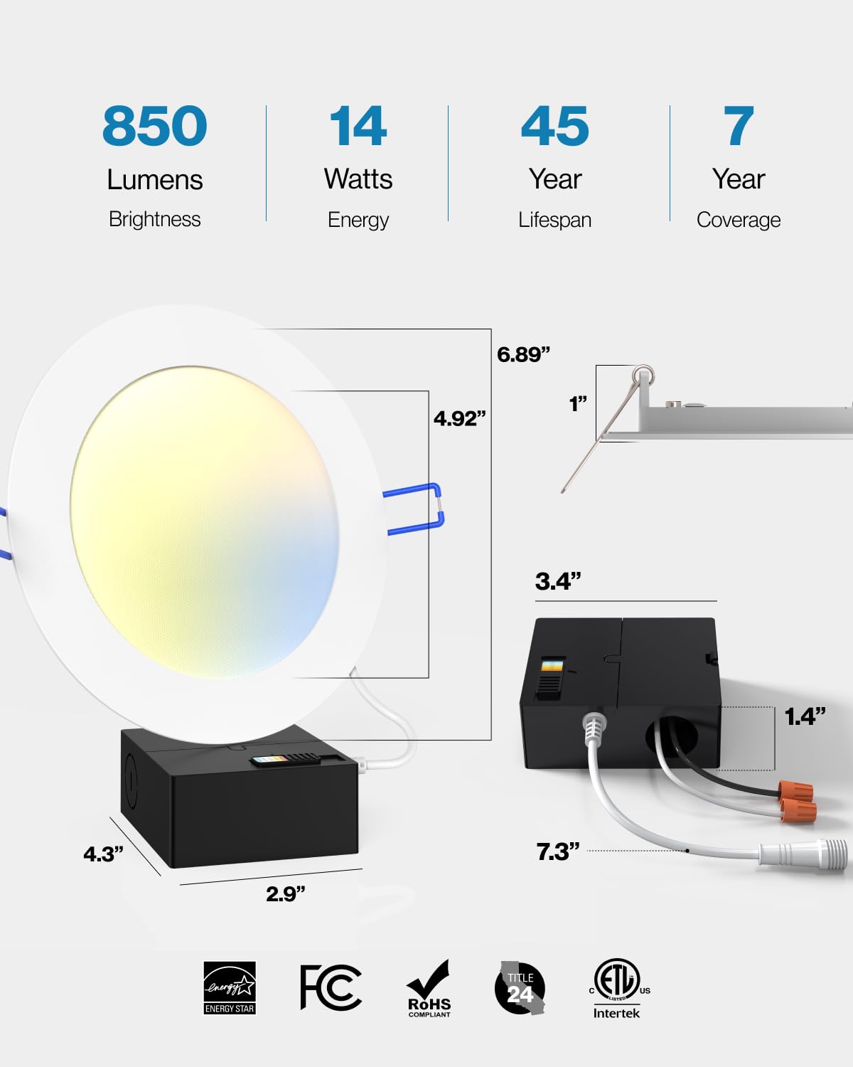 Sunco 24 Pack 6 Inch LED Recessed Light, Canless Ceiling Lights Slim with Junction Box, 850 LM, 14W (100W Equivalent), Selectable CCT 2700K/3000K/4000K/5000K/6000K, Dimmable, Wafer Thin ETL