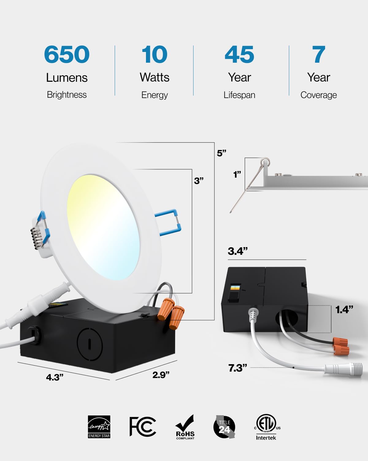 - SIMPLE INSTALL - Our LED slim downlights come equipped with a junction box which means they do not need a can. Spring-loaded brackets fit any ceiling type: double drywall, single drywall, and soffit.