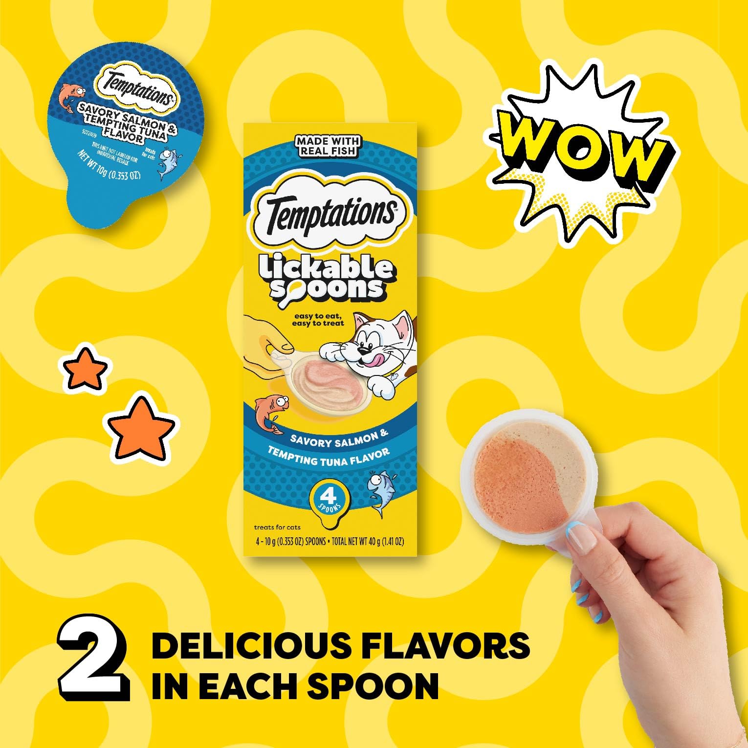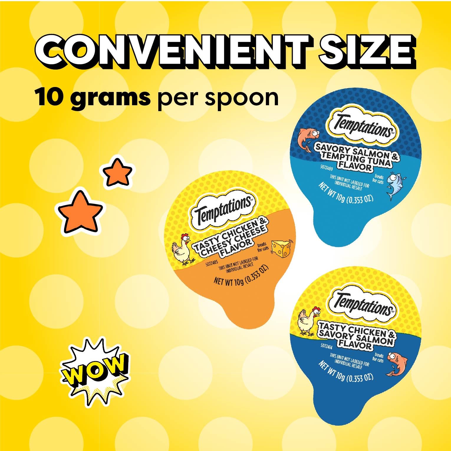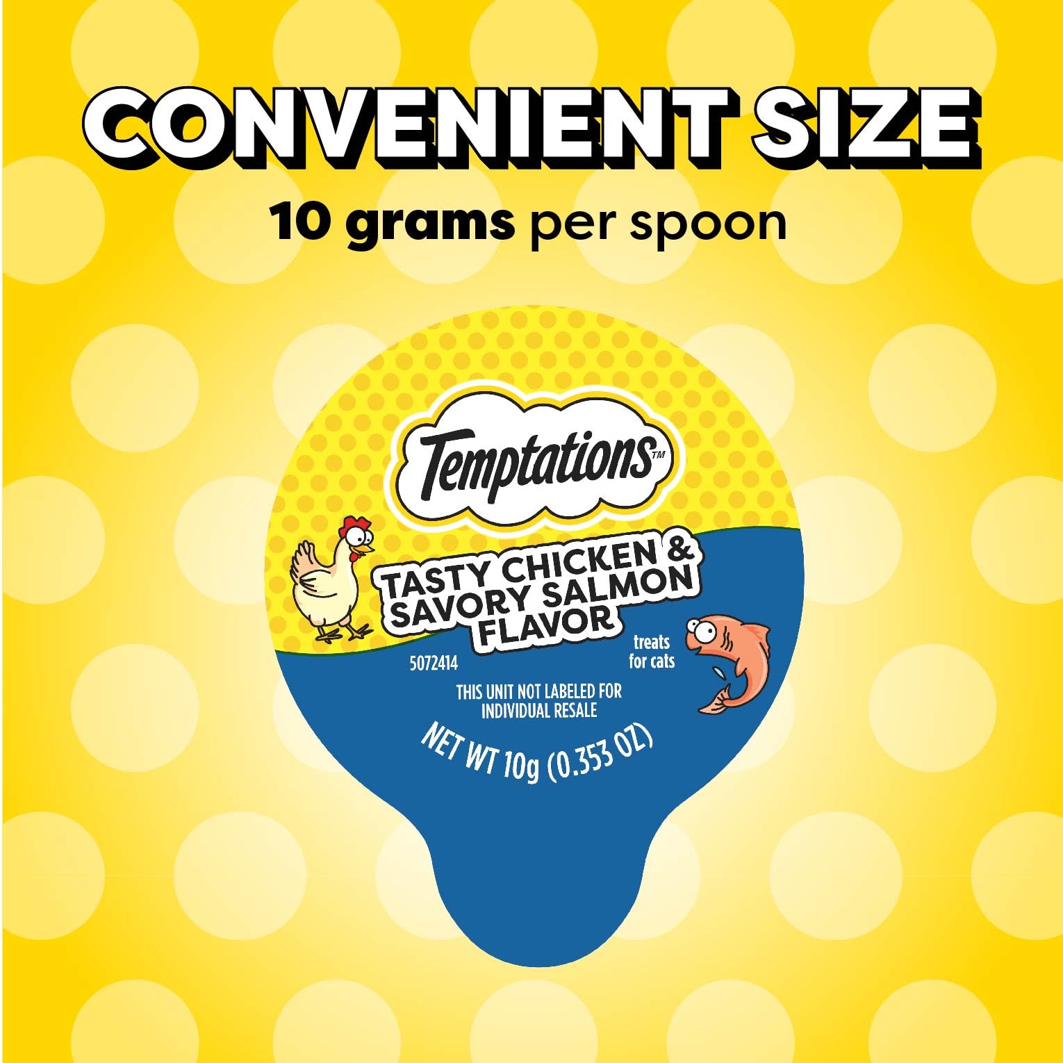 - 24-Pack: Contains eight (8) 10-gram spoons of TEMPTATIONS Lickable Spoons Tasty Chicken and Cheesy Cheese Flavor, eight (8) Savory Salmon and Tempting Tuna Flavor, and eight (8) Tasty Chicken and Savory Salmon Flavor Adult Wet Cat Treats
