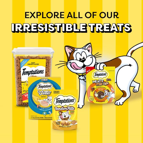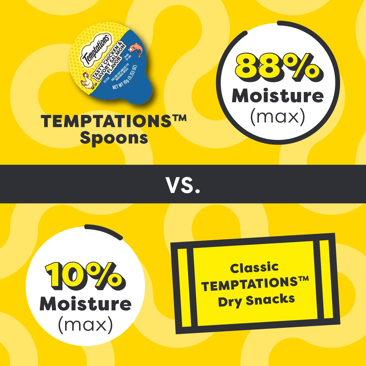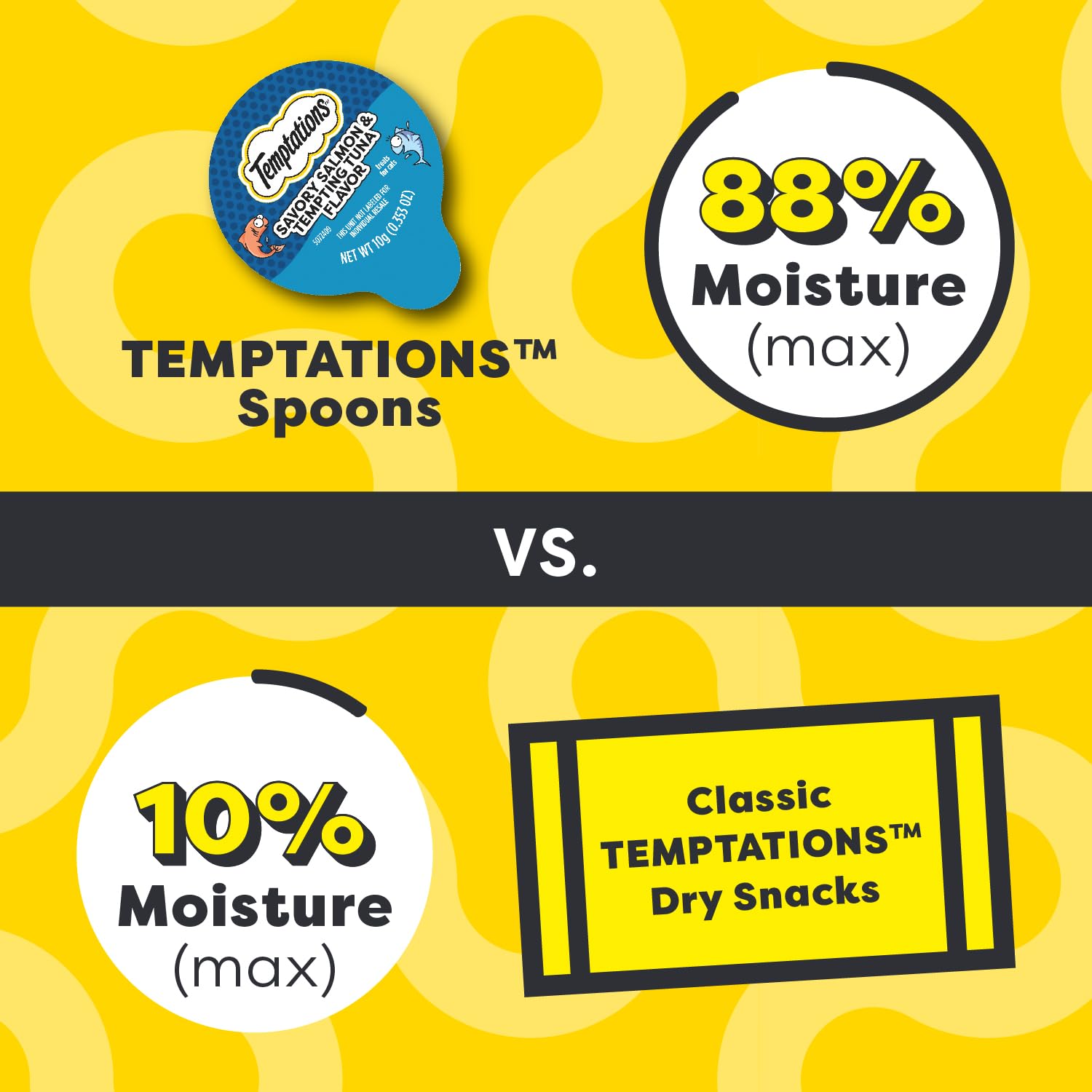 - 24-Pack: Contains eight (8) 10-gram spoons of TEMPTATIONS Lickable Spoons Tasty Chicken and Cheesy Cheese Flavor, eight (8) Savory Salmon and Tempting Tuna Flavor, and eight (8) Tasty Chicken and Savory Salmon Flavor Adult Wet Cat Treats