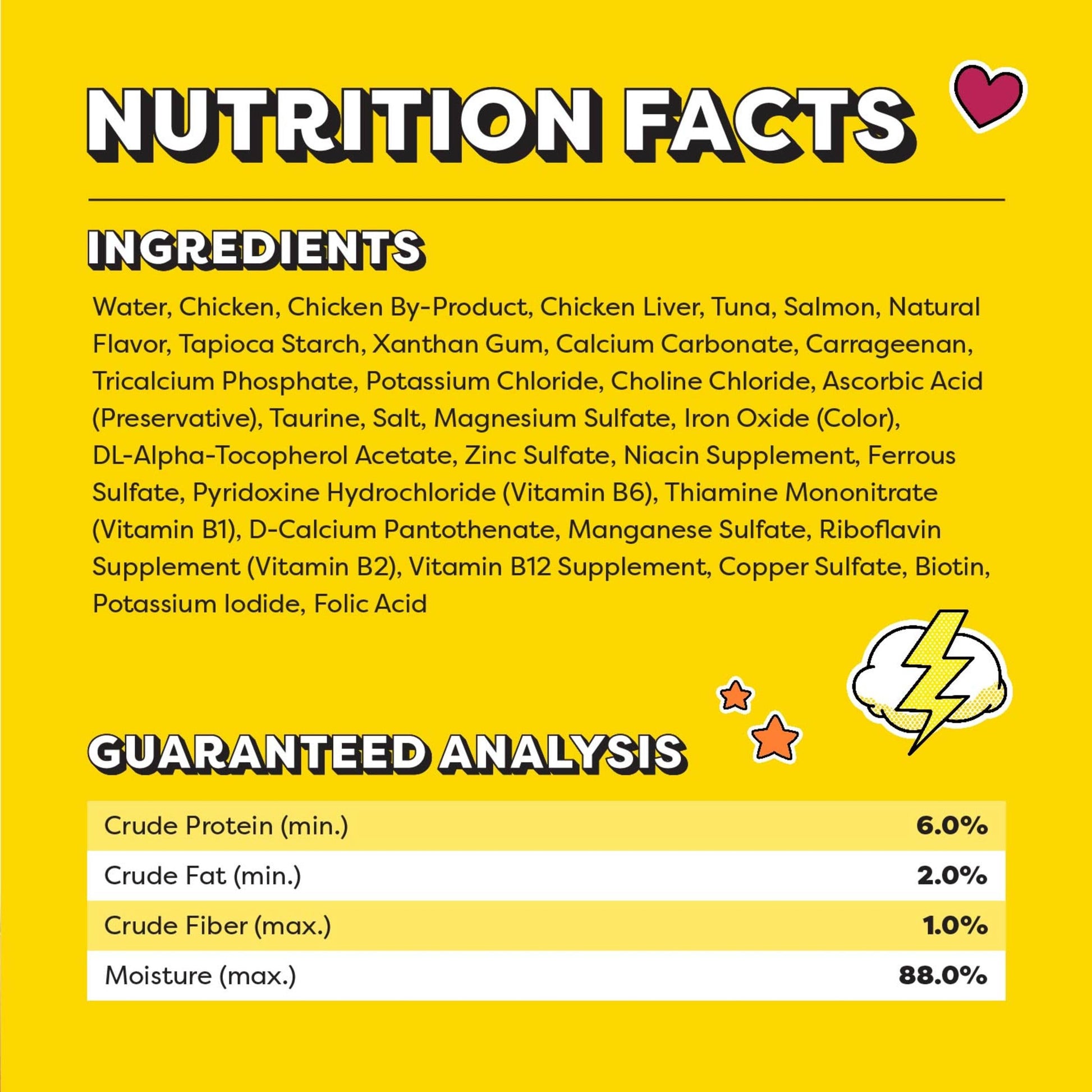 - Made with real chicken, tuna, salmon or cheese so your favorite feline will enjoy two irresistible flavors in one lickable spoon.