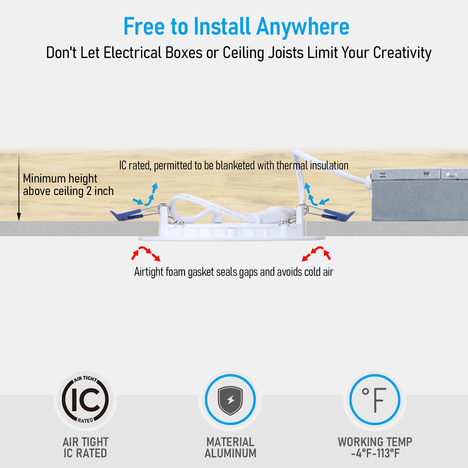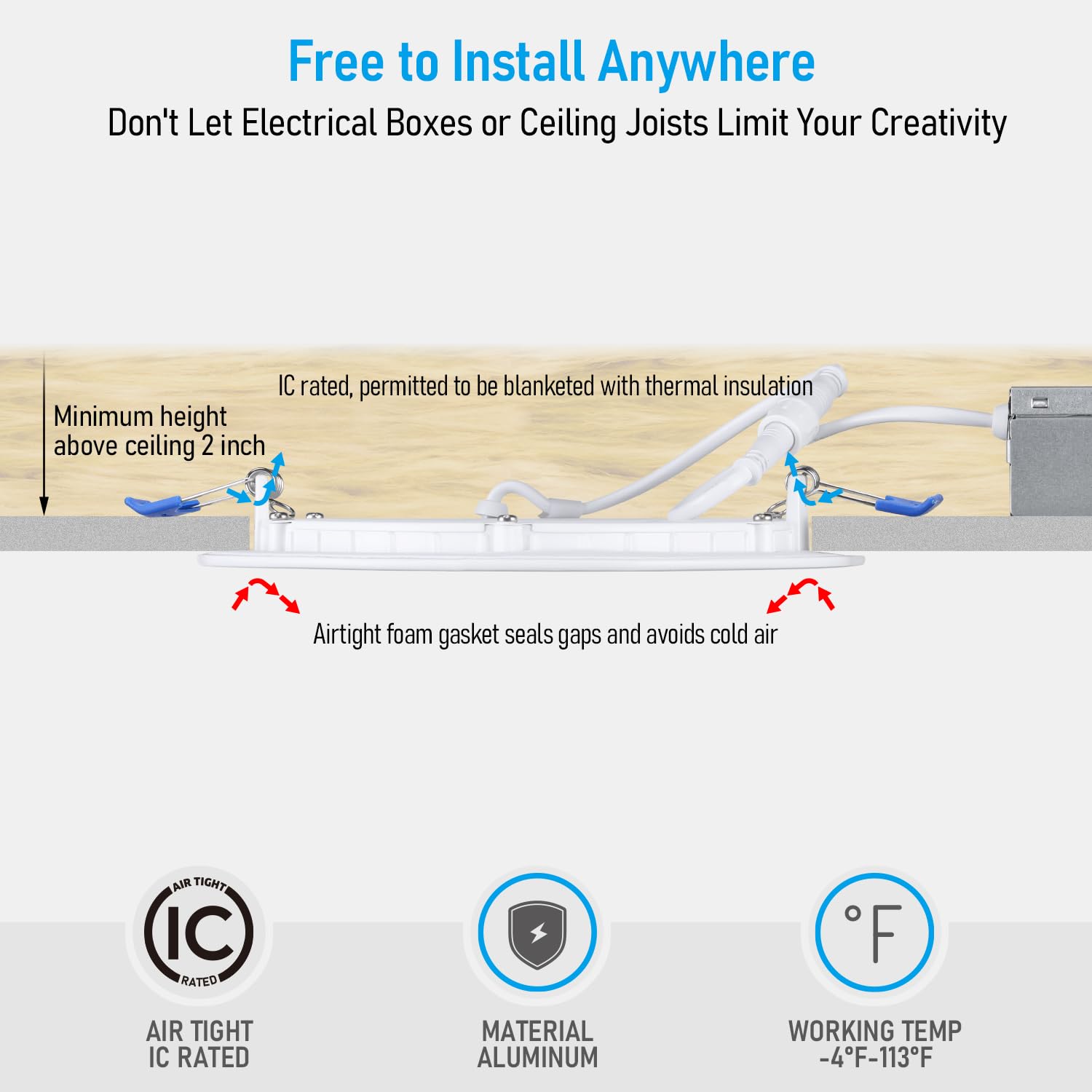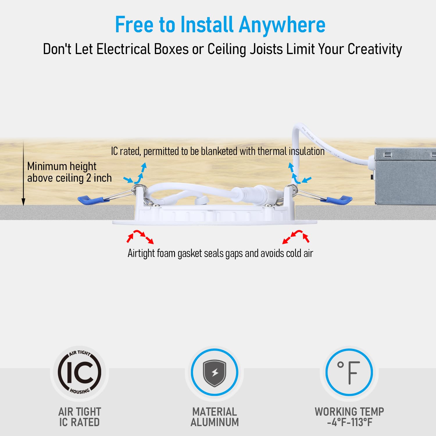 - Easy Install: Say goodbye to complex installations. Attach the included j-box to the LED recessed lighting using male/female cables, then secure it to the ceiling with the spring clip. This IC-rated light can directly contact insulation