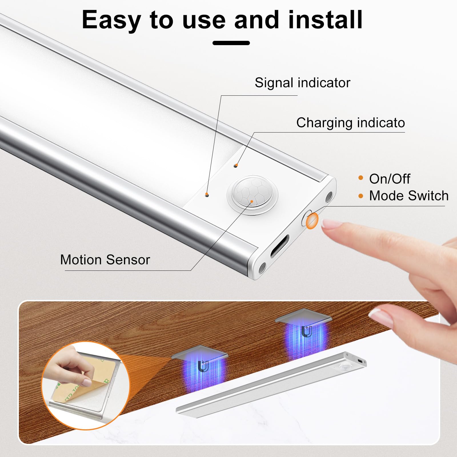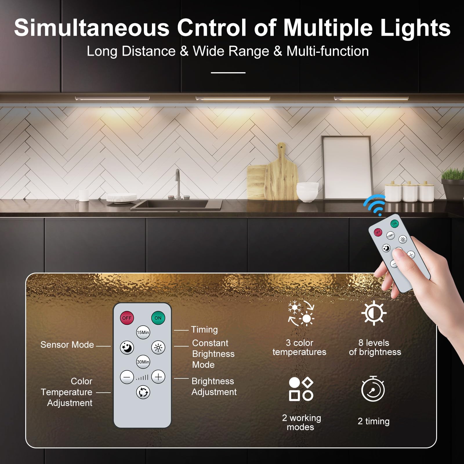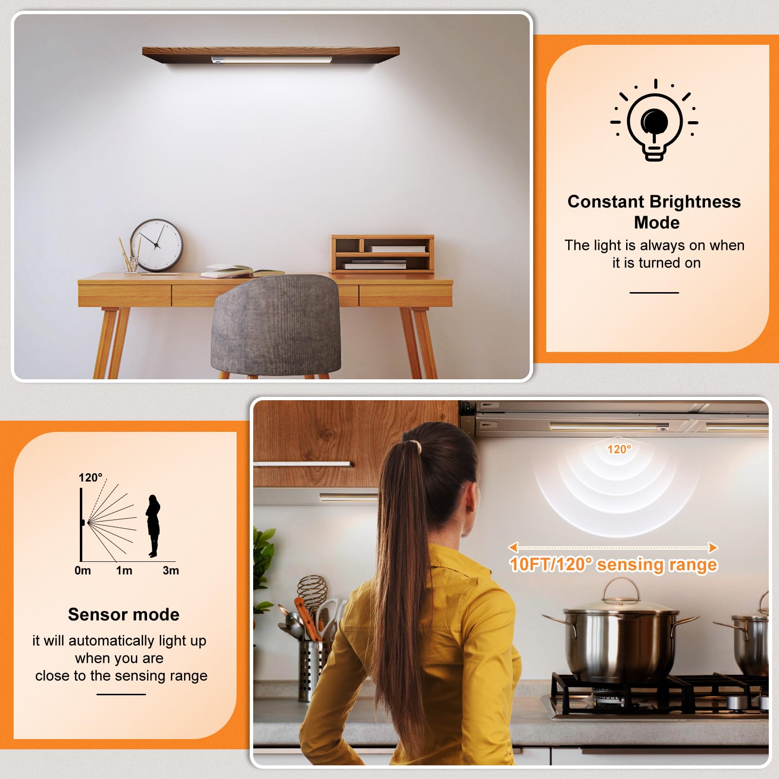 - 📳【Upgraded Motion Sensor & 2 Working Modes】The under cabinet lighting wireless provides efficient and energy-saving lighting. When in the induction mode , the high-sensitivity sensor will automatically turn on the light when it detects human activities within 120° and 10 feet, and automatically turn off after 20 seconds, so you no longer have to fumble for the switch in the dark; the constant light mode can meet the lighting needs of scenes such as cooking and reading