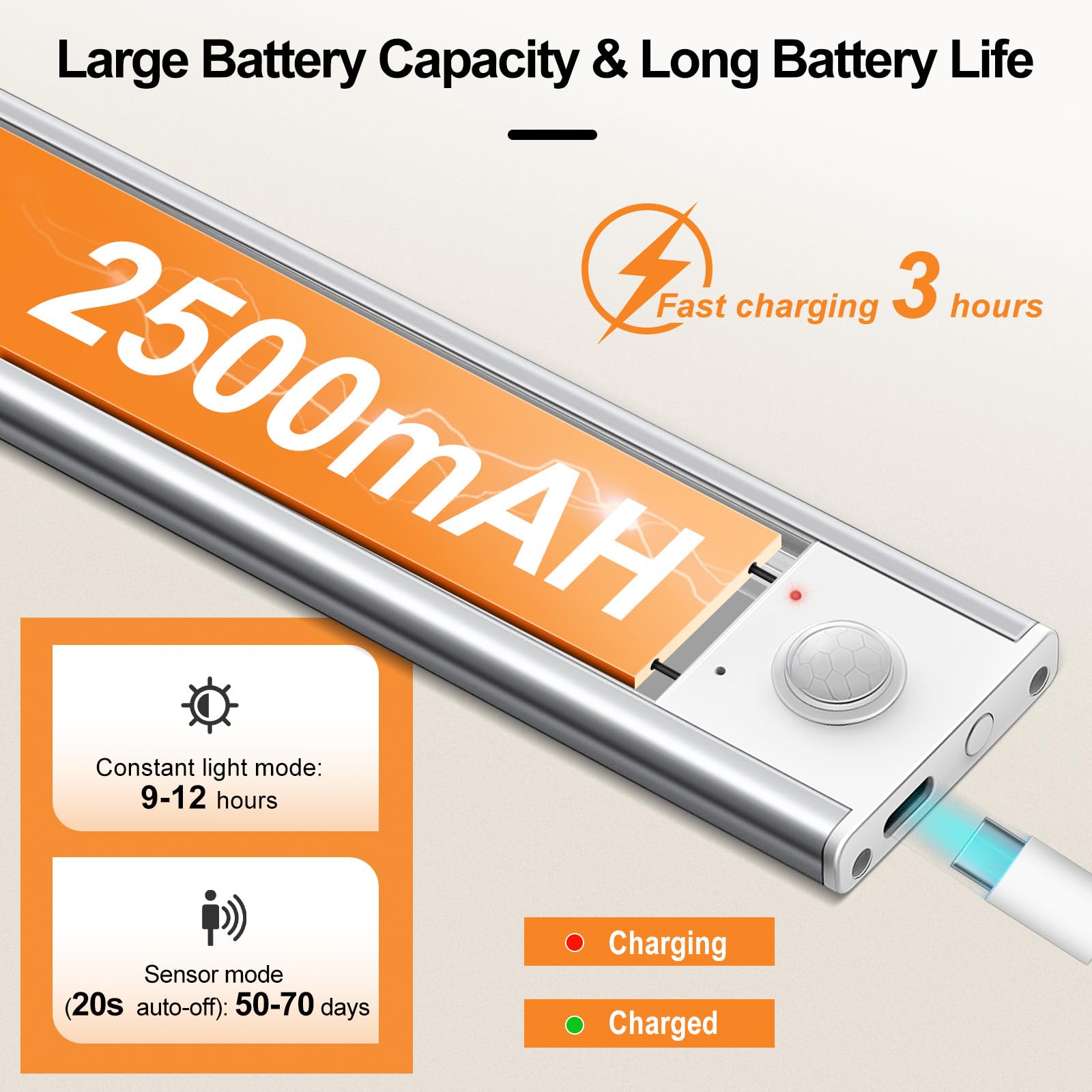 - 🔋【2500mAh Large Battery & Fast Charging】No need to recharge frequently! The upgraded Coolpub under cabinet lighting is equipped with a powerful 2500mAh rechargeable battery, which can be quickly fully charged in 3 hours using USB-C. The cabinet lights can be used for up to 60 days in sensing mode (depending on the brightness you set and the frequency of sensing), and up to 9 hours in constant light mode.