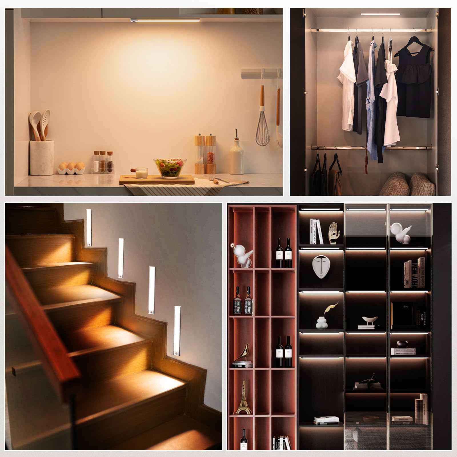 - 🧲【Easy Installation & Multi-scene Application】The under cabinet lighting have built-in strong magnets that can be attached to metal surfaces, and the two removable metal plates can be attached to non-magnetic surfaces using the included double-sided tape. The installation is very simple and providing a lighting solution that does not require drilling for kitchens, closets, cabinets, storage rooms, basements, stairs, corridors, bookshelves, etc.