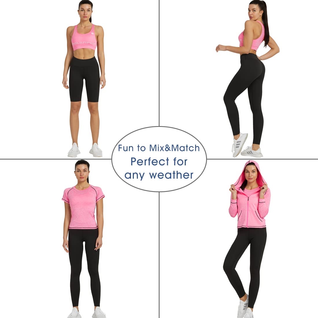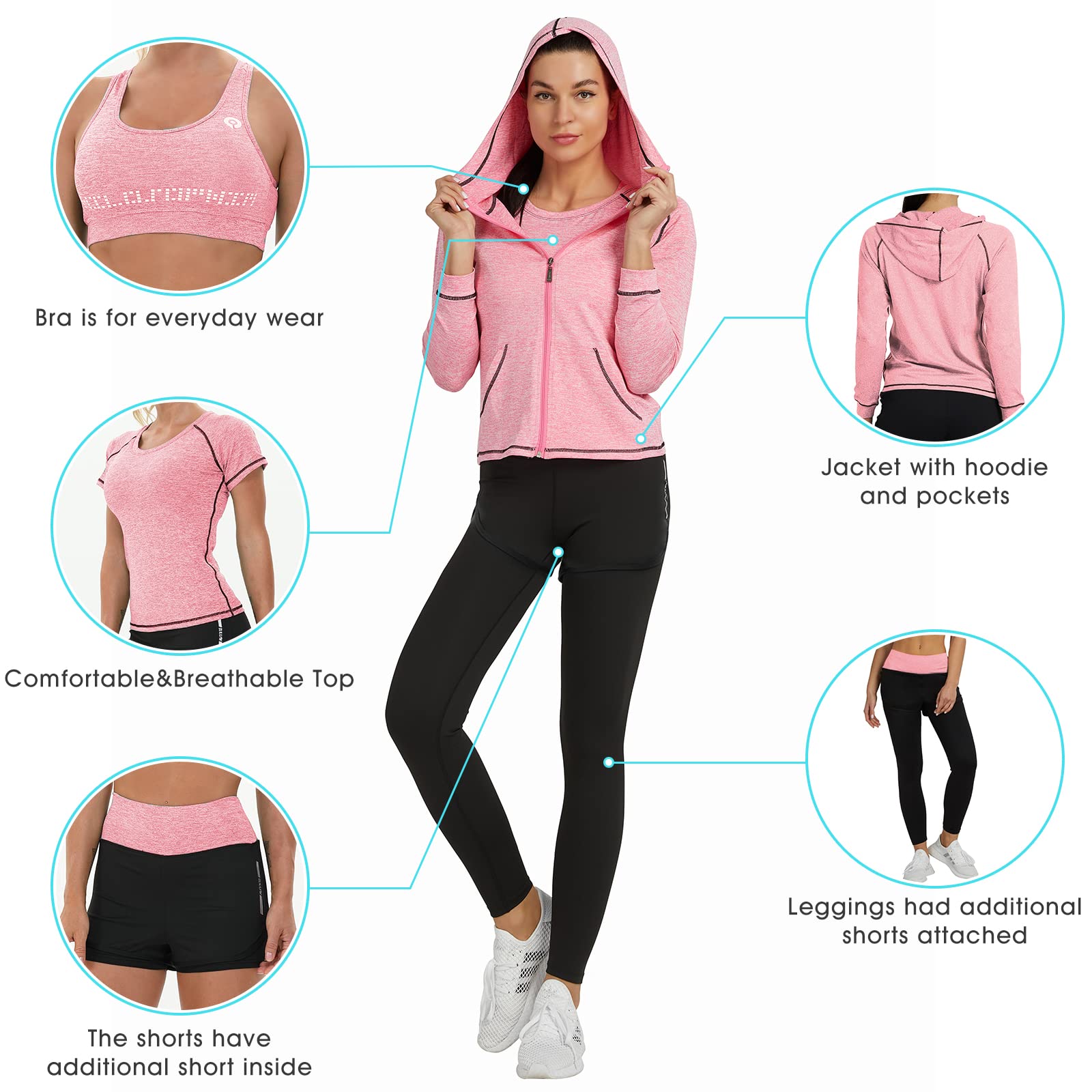 - 5 Pieces Workout Set - Including sport bra, T-shirt, shorts, leggings with extra shorts and jackets. Provide you the variety of options as possible